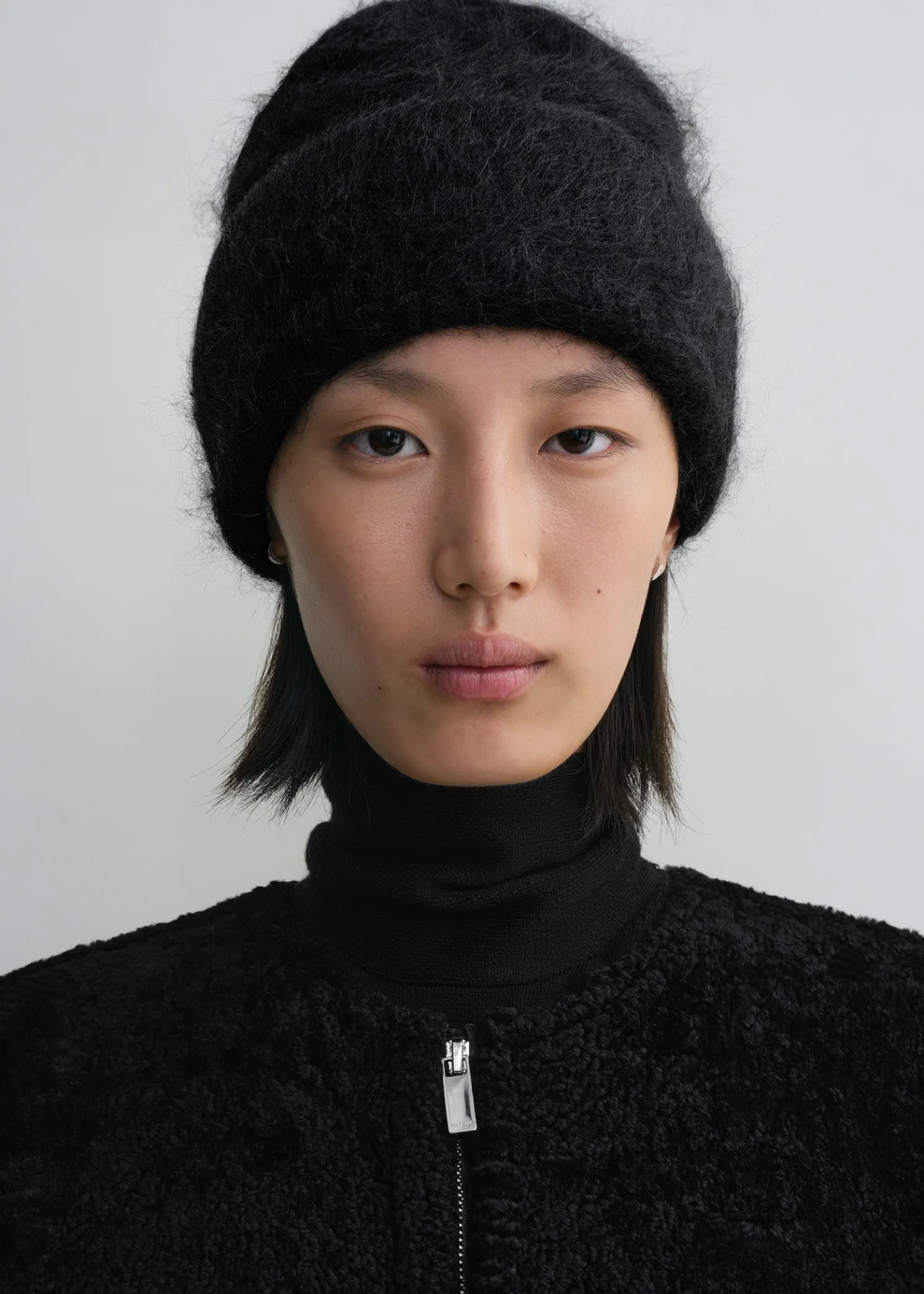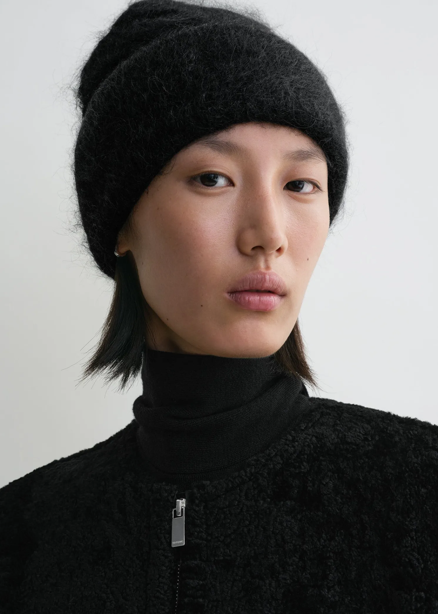 TOTEME beanie hat imagined as a warm set complete with the Boxy alpaca knit. It’s knitted from a fuzzy alpaca blend that has a touch of elastane for comfort and can be worn with the edge folded or extended.
