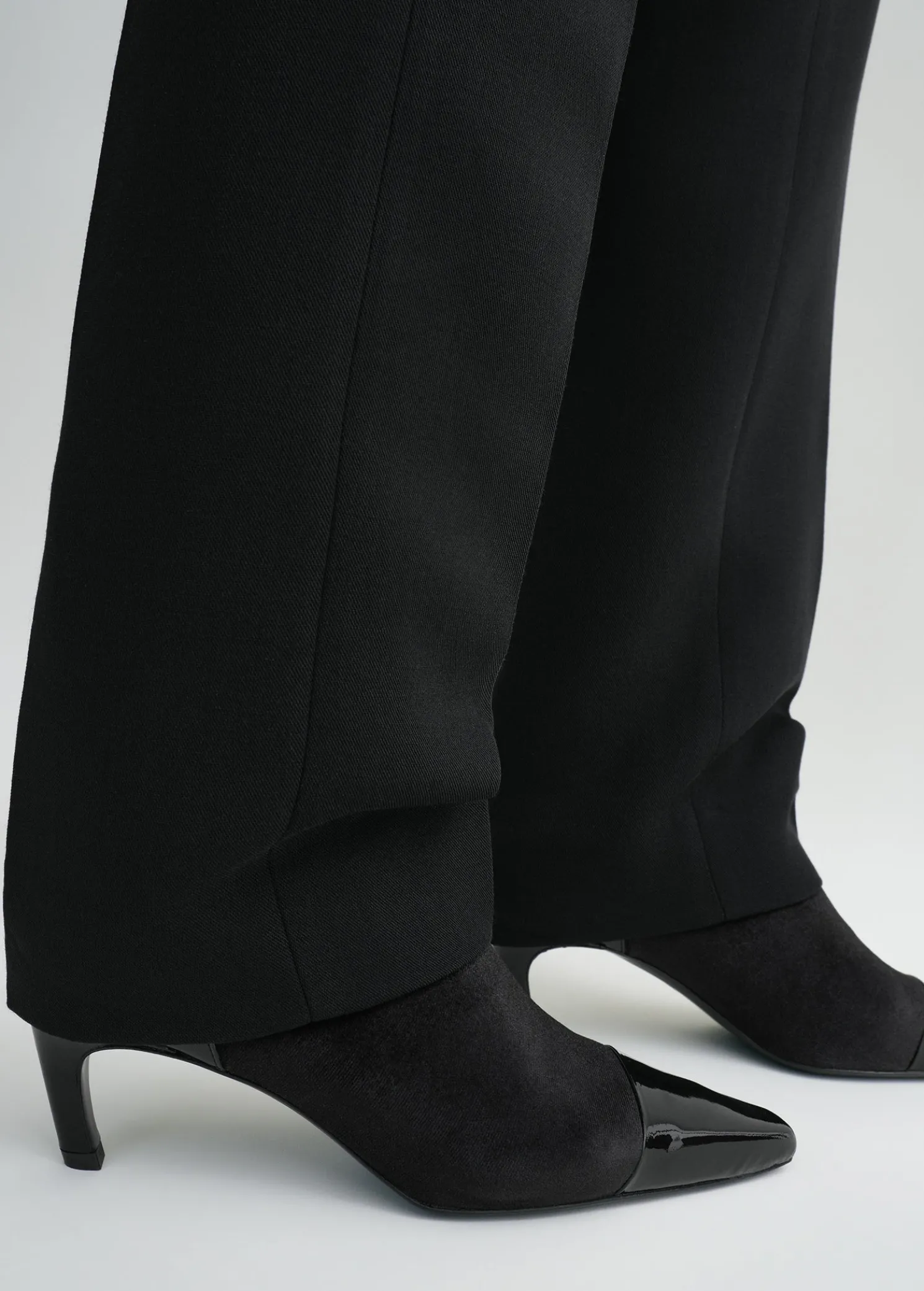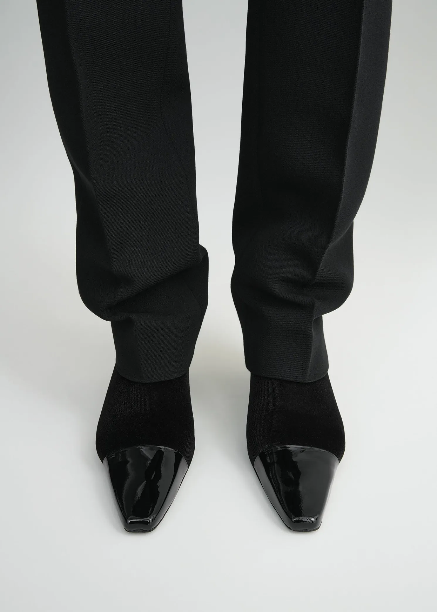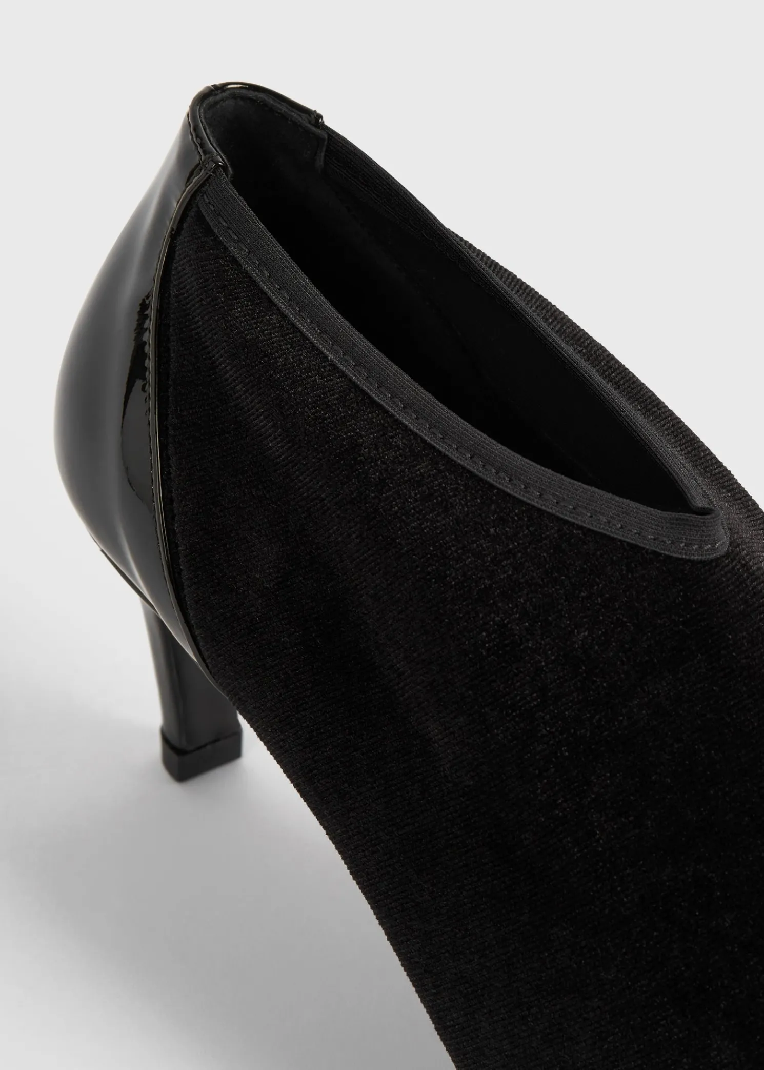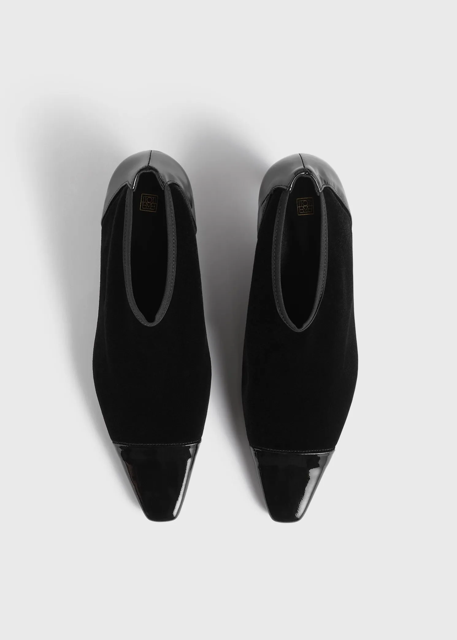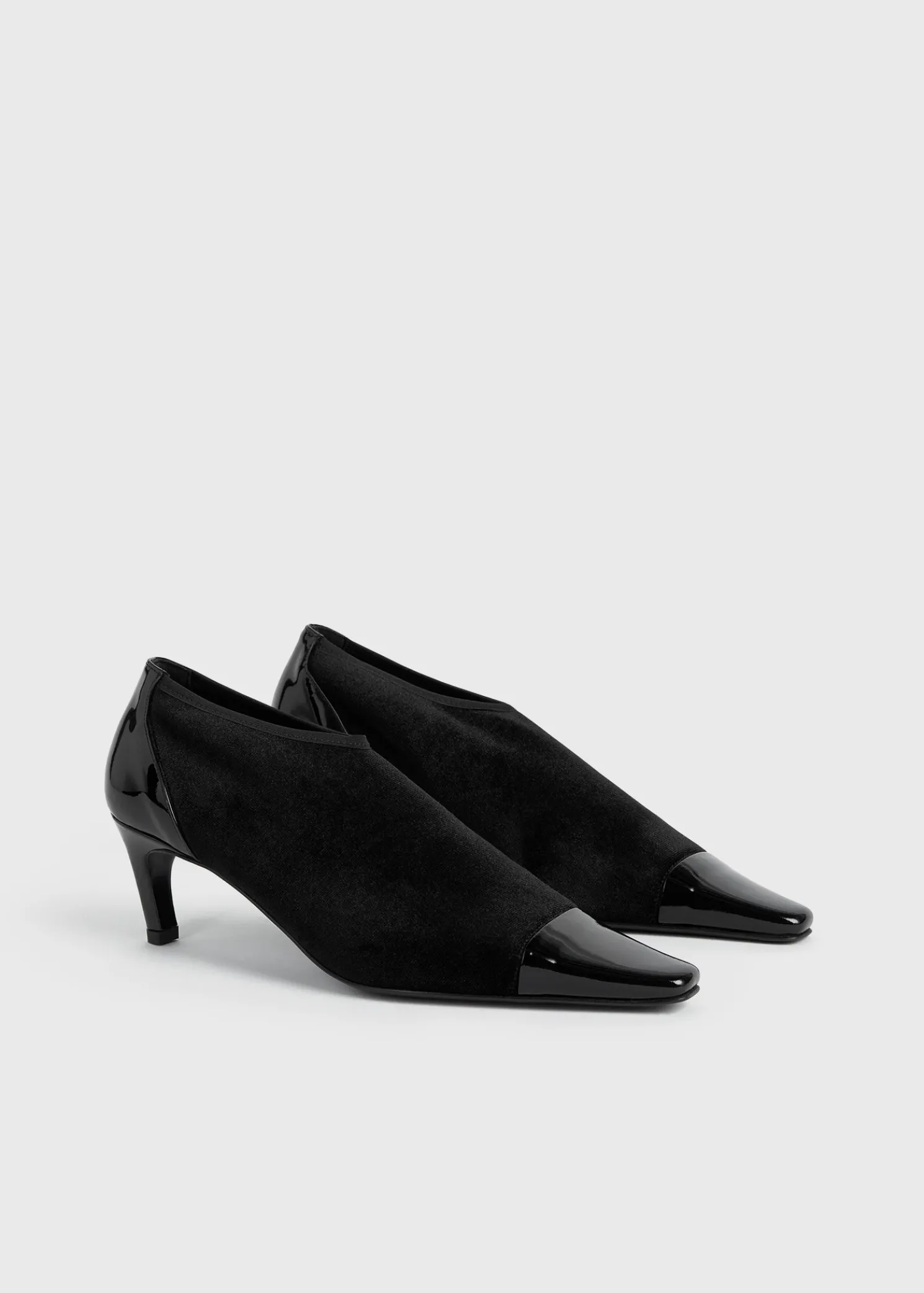 TOTEME bootie pumps featuring a tactile bi-material design. Made in Spain, they have an elasticated velvet upper and a shiny patent leather toecap and are set on a 60mm heel. Team them with occasion looks.