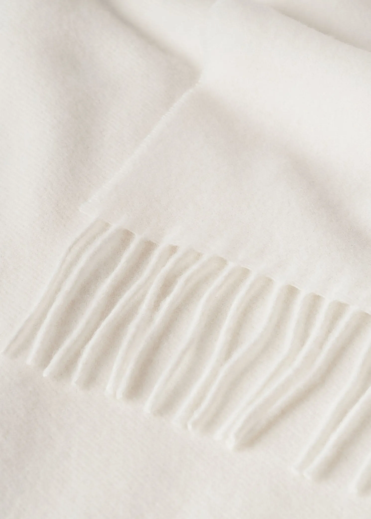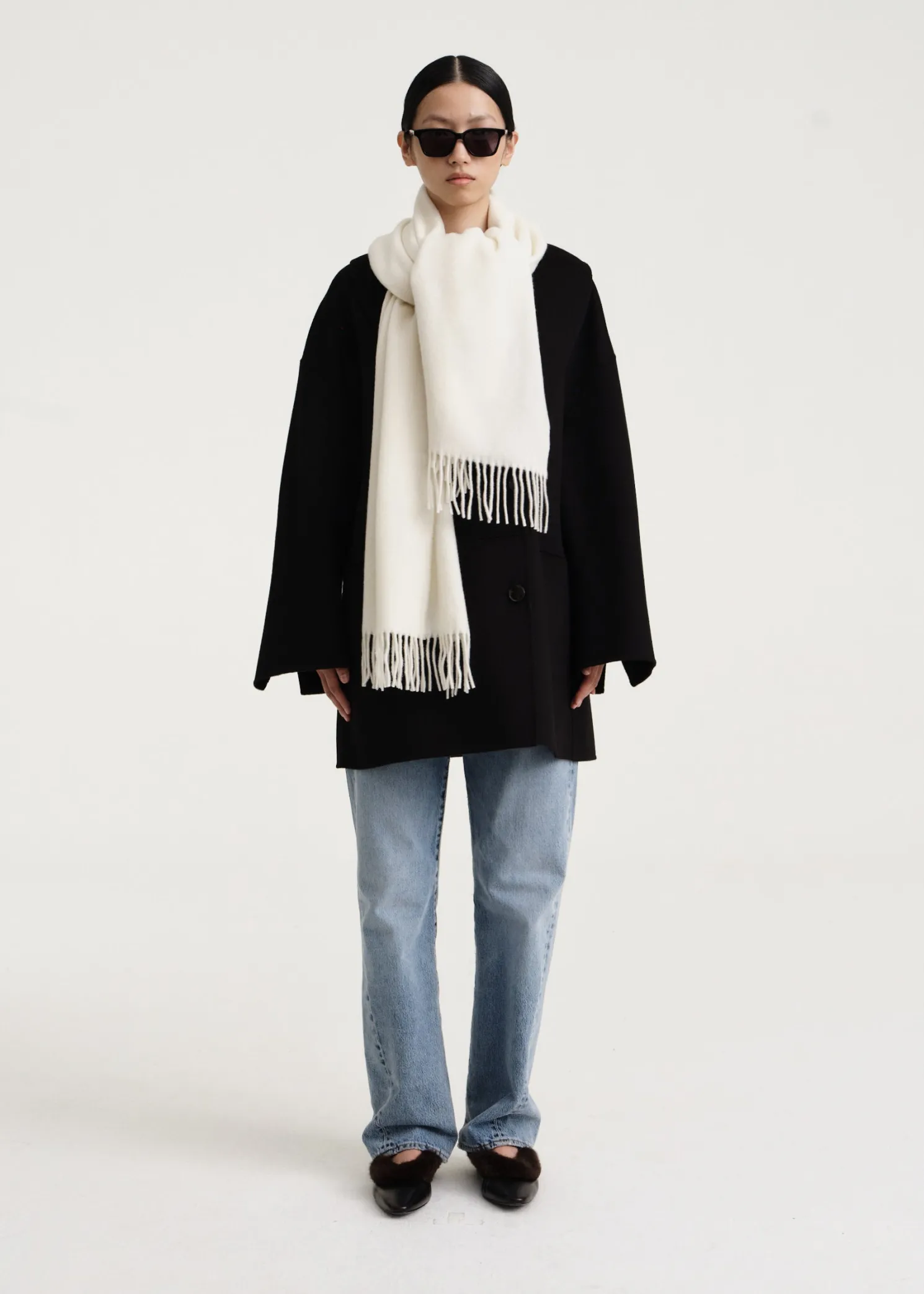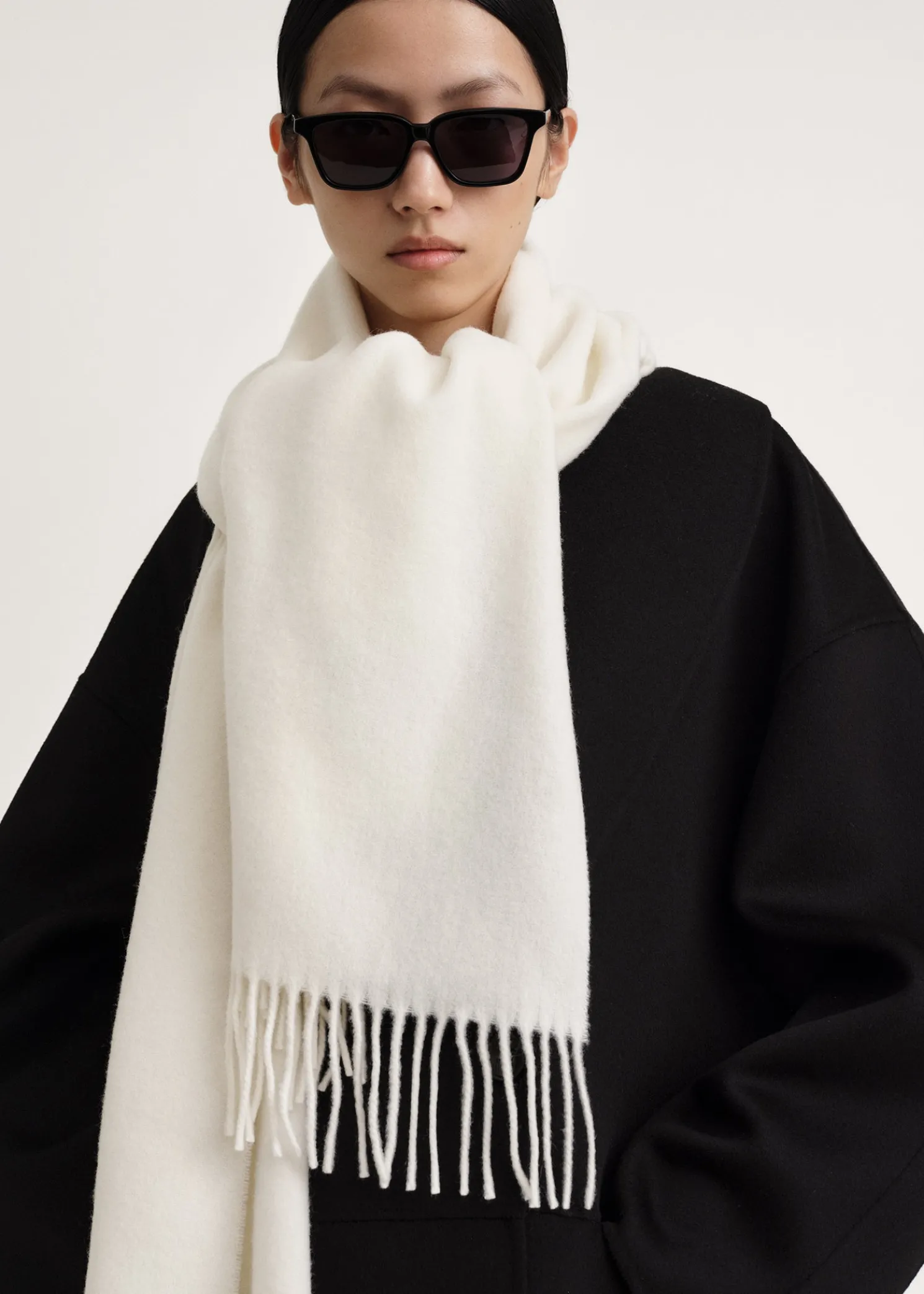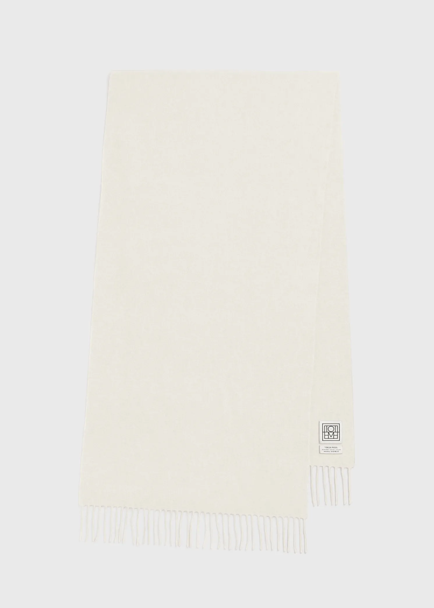 nnClassic TOTEME scarf made in Italy from responsibly sourced wool. It has a rectangular shape measuring 220x50cm with fringed edges and a monogram label. Wear it throughout winter over your favorite coat or jacket.
