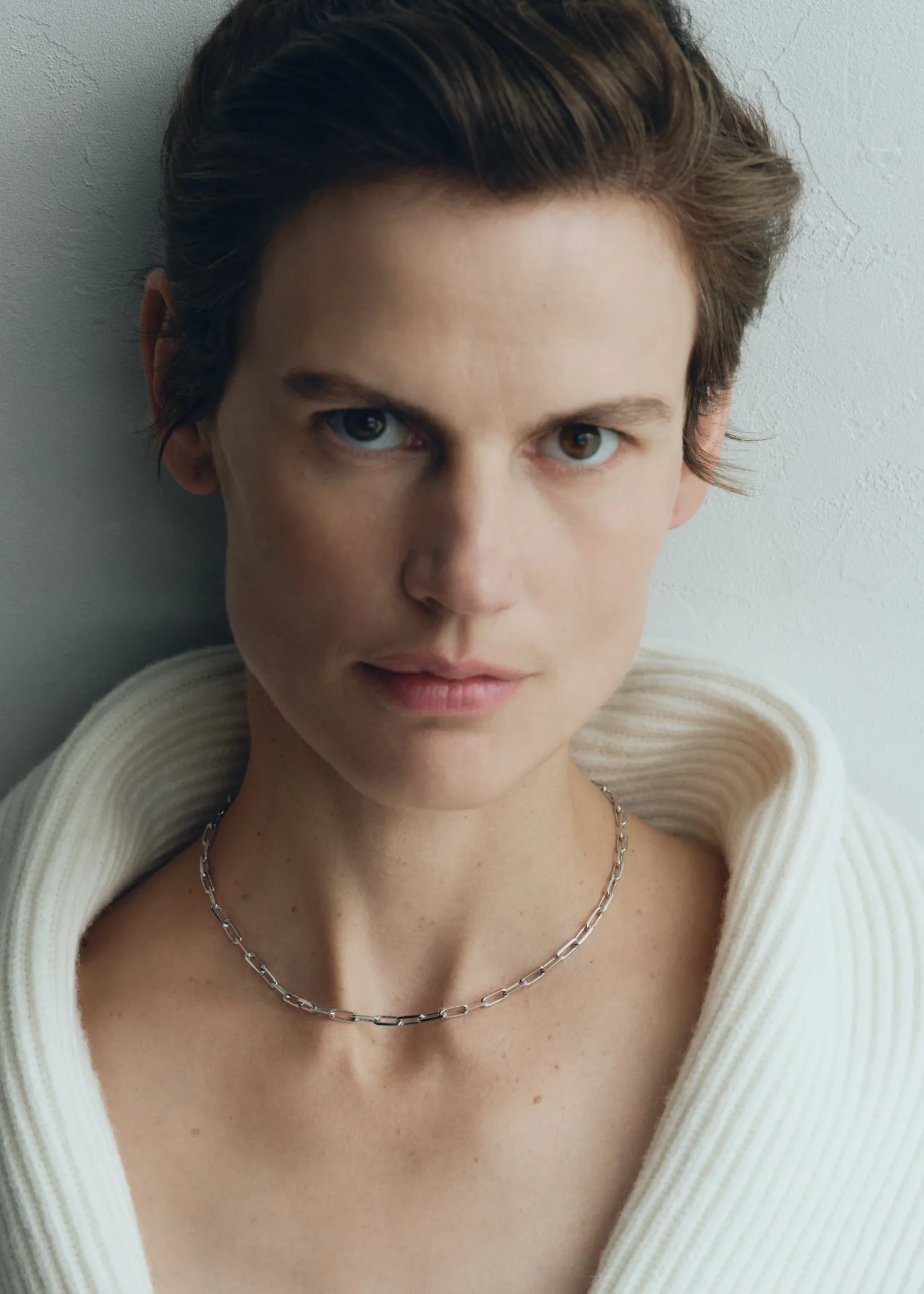 This slim chain necklace is an iteration from TOTEME’s first fine jewelry collection. It is crafted in Arezzo, Italy from recycled 18kt white gold with fine forzatina links that are carefully shaped with lozenge edges for a sparkling effect and sits just below the neck, bringing to mind the neckline of a crew T-shirt.