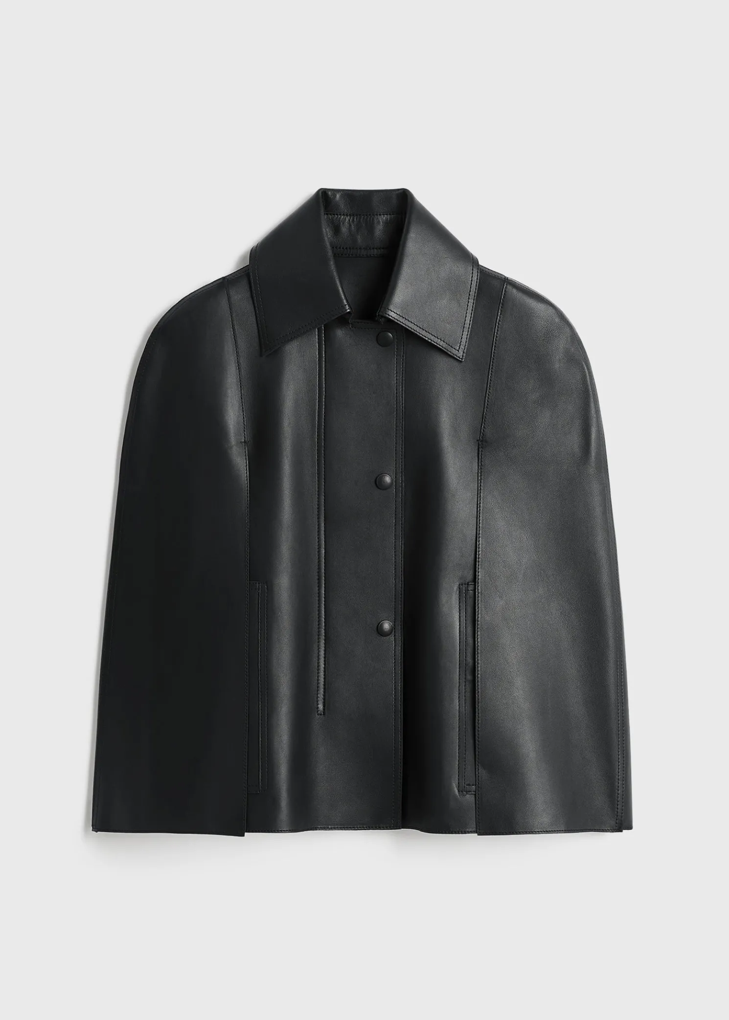 Directional TOTEME cape jacket crafted from double leather for a directional outline. It has front arm slits concealing practical welt pockets and fasten with snap buttons and a concealed metal zipper. Style it with slim trousers for an after-dark outing.