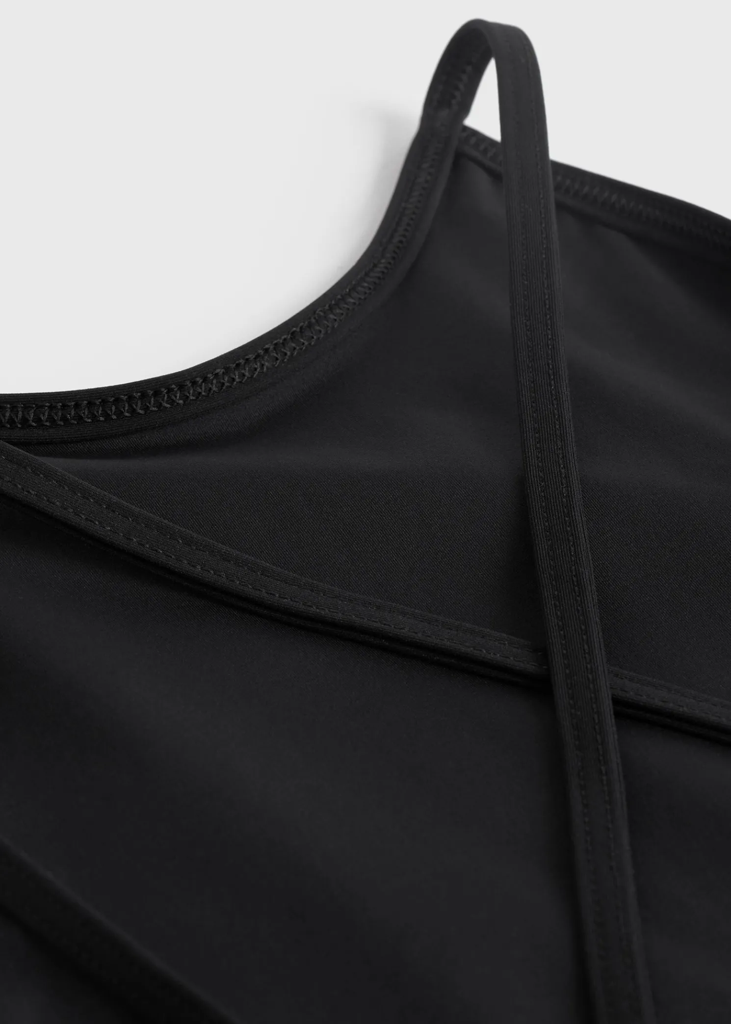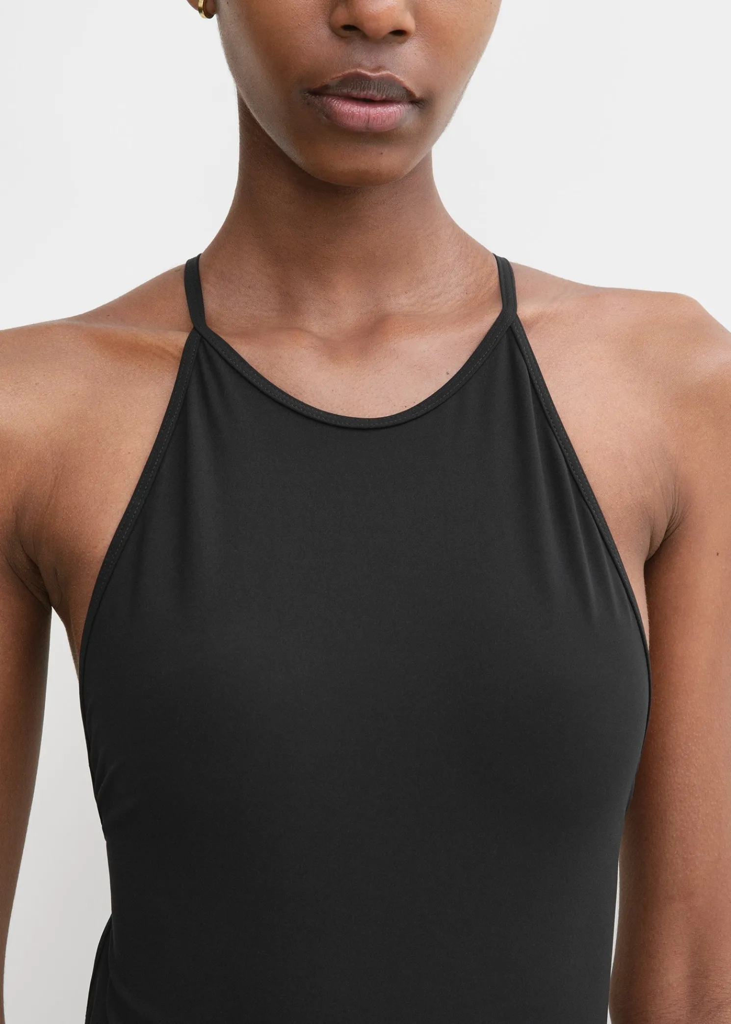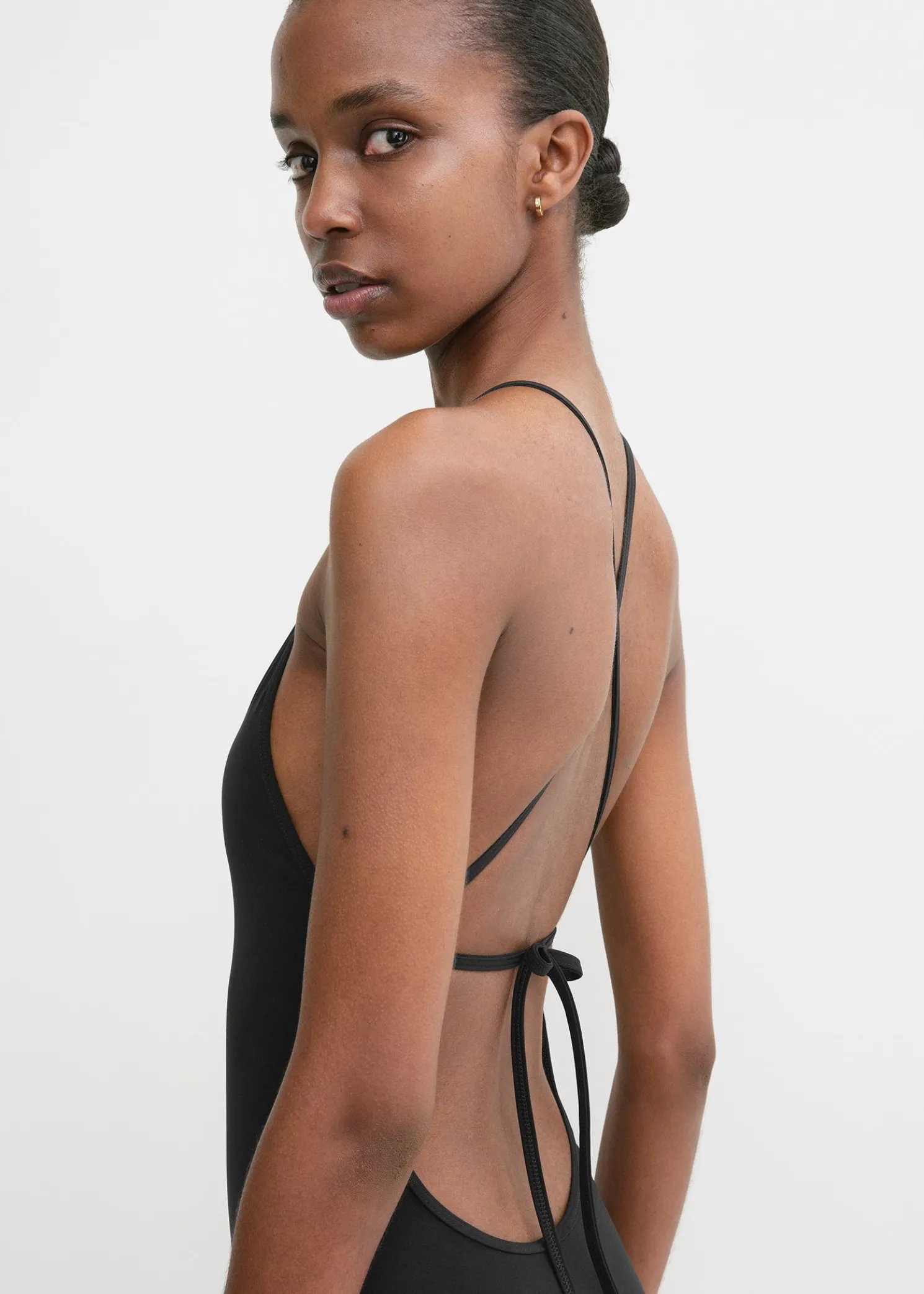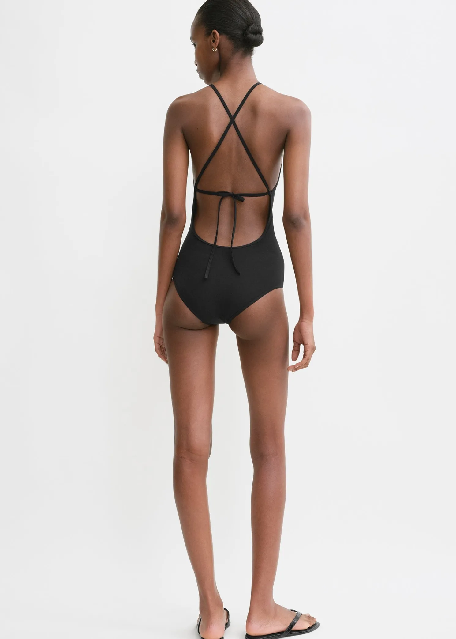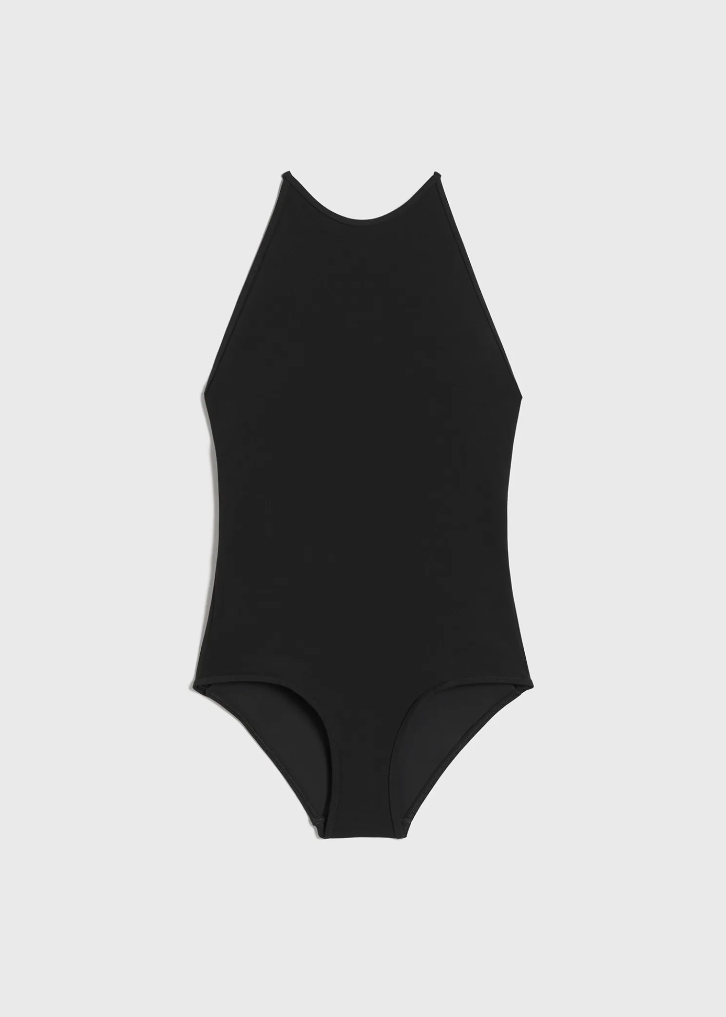 TOTEME swimsuit featuring a halterneck with slender straps that cross and fasten over the bare back for a personalized fit. It is made from stretch jersey that is lined at the base. Wear it with a cover-up or sarong.