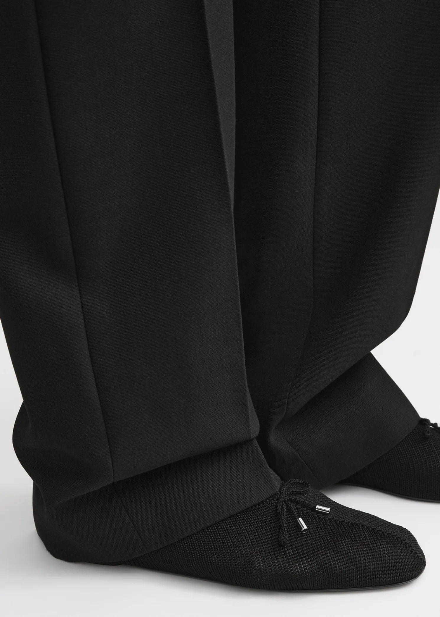 TOTEME ballerina flats knitted from viscose-blend yarns that stretch into a natural, foot-hugging shape. Made in Italy, they have an elasticated top edge with a decorative bow and silver-tone aglets and are set on a smooth leather insole. Let them peep below trousers and jeans.