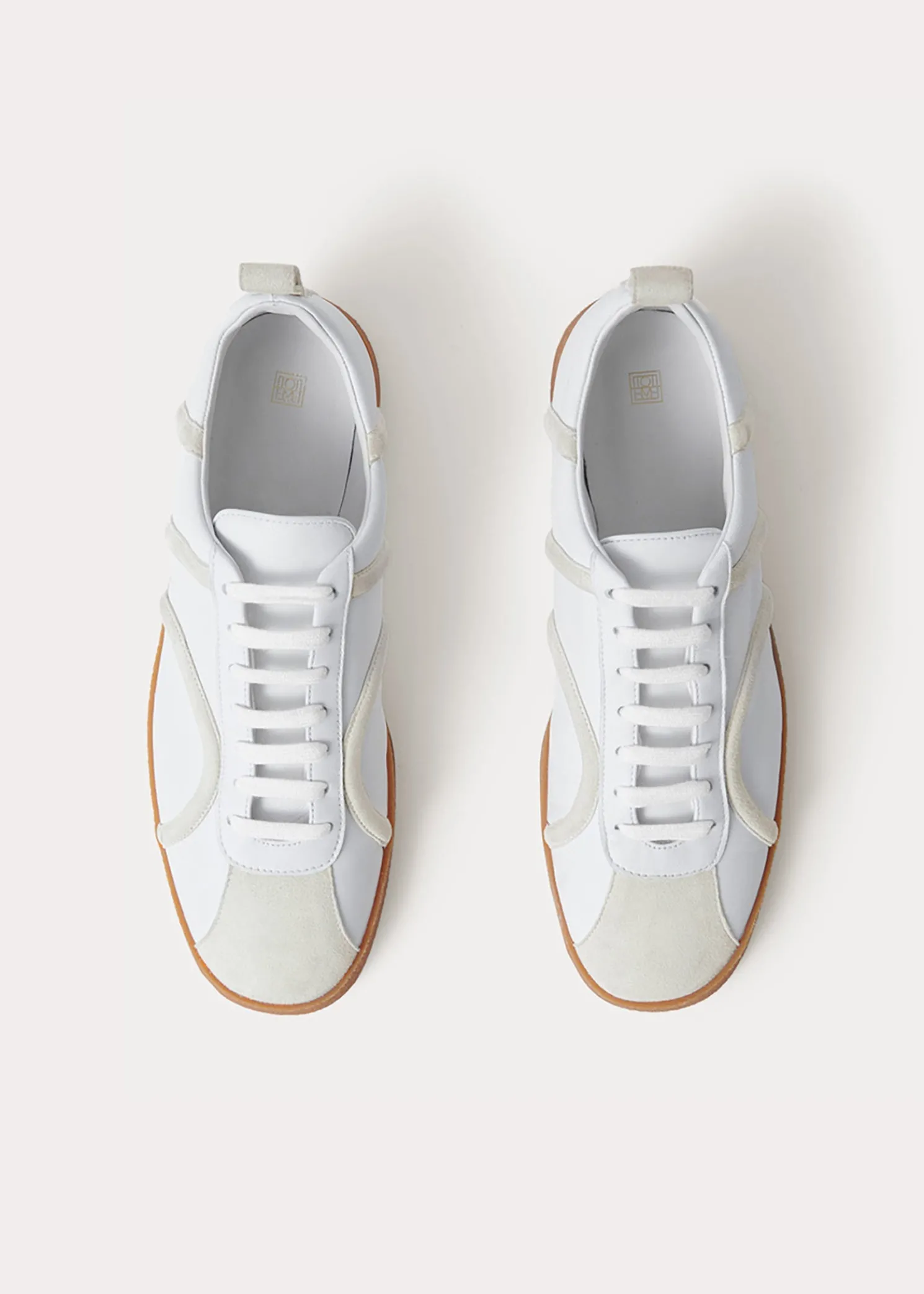 nThese sneakers are decorated with iterations of TOTEME’s monogram along the upper and sole. They’re handmade in Italy from off-white Nappa leather and eggshell suede to a round-toe silhouette featuring cotton laces, leather lining, and a tan rubber base. Style them with jeans or leggings.