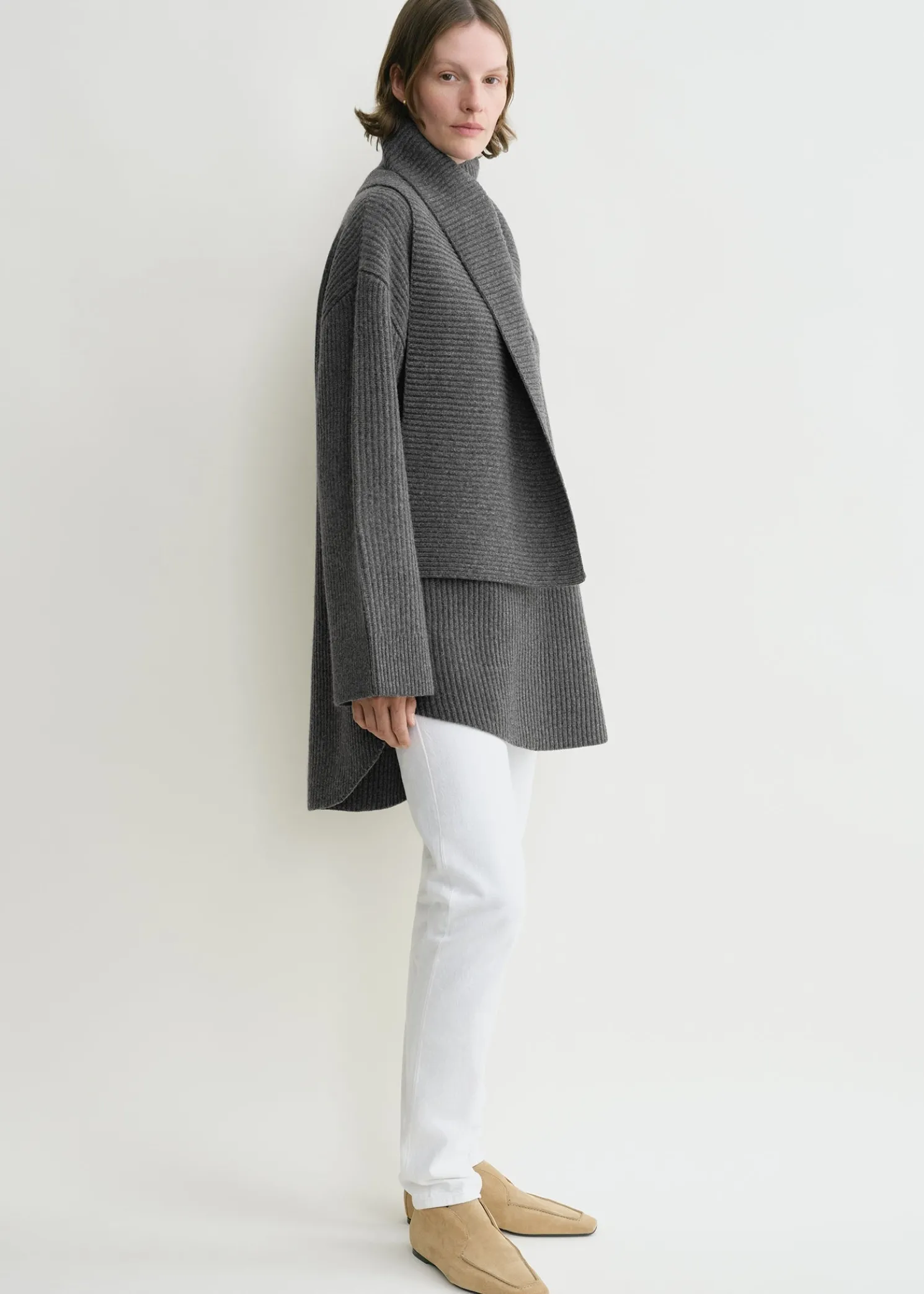 TOTEME sweater knitted from heavy and spongy wool with chunky ribbing. It has an oversized, longline silhouette with a curved hem that is fitted with a scarf at the neck for volume. Layer it over light pants.