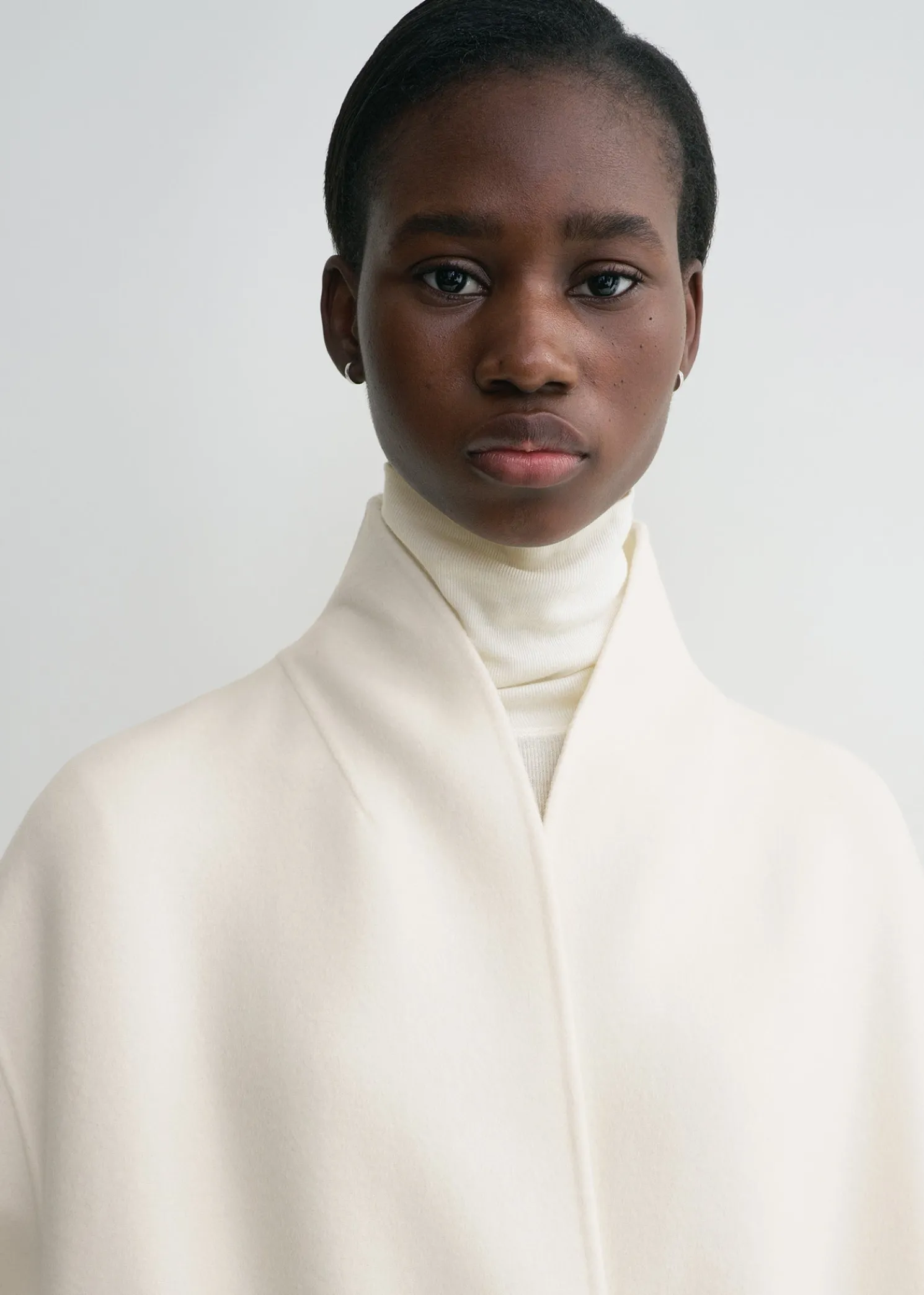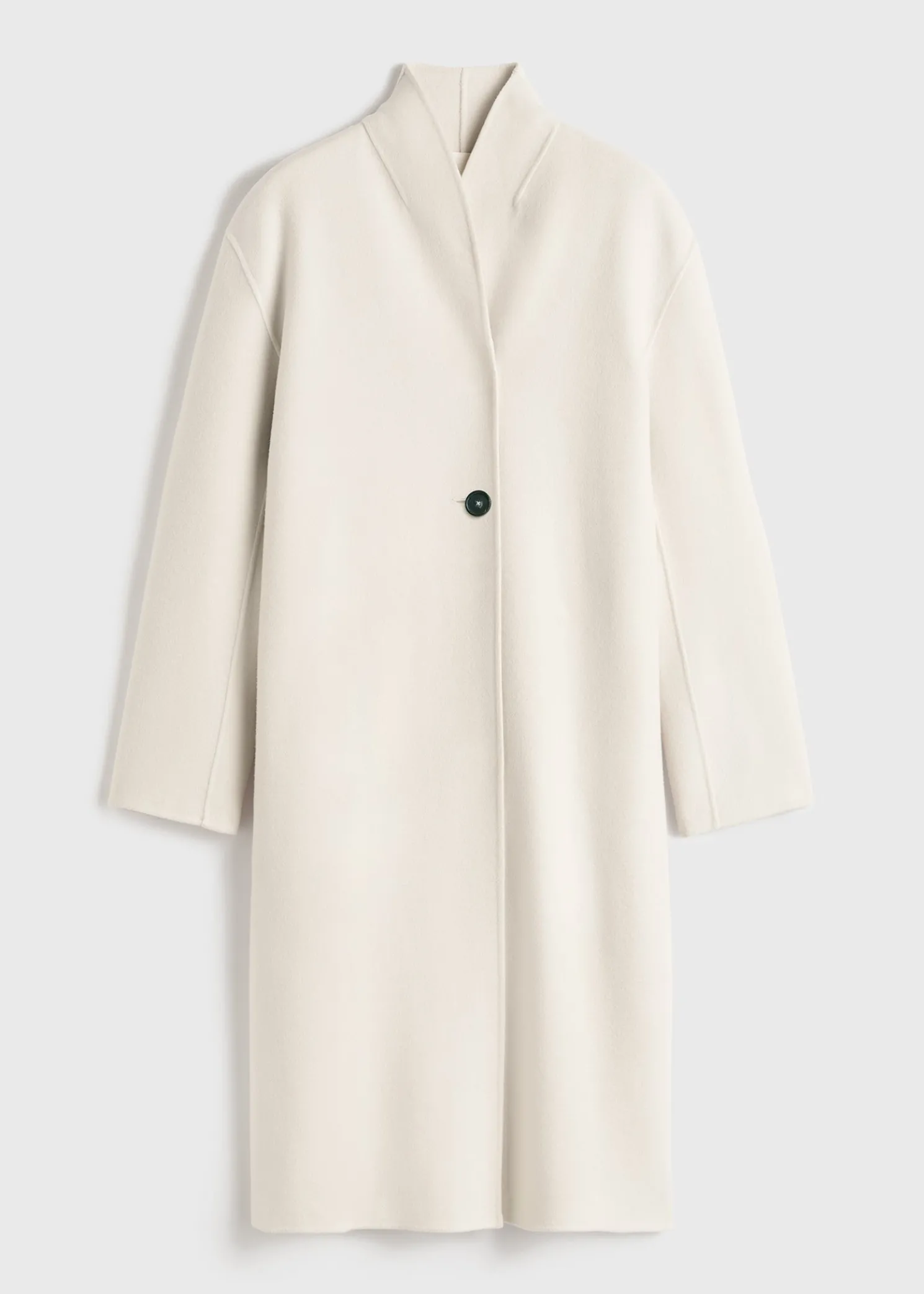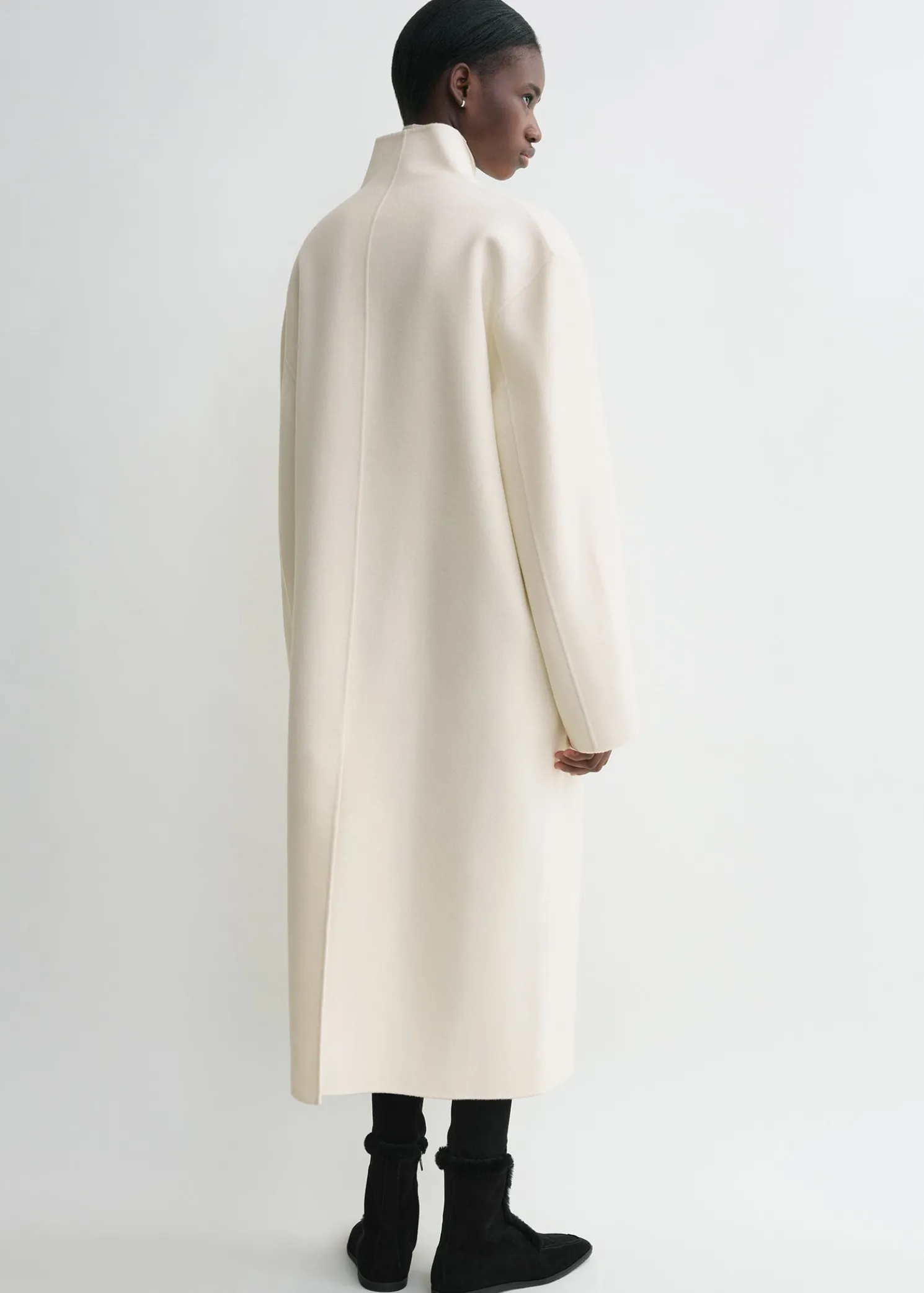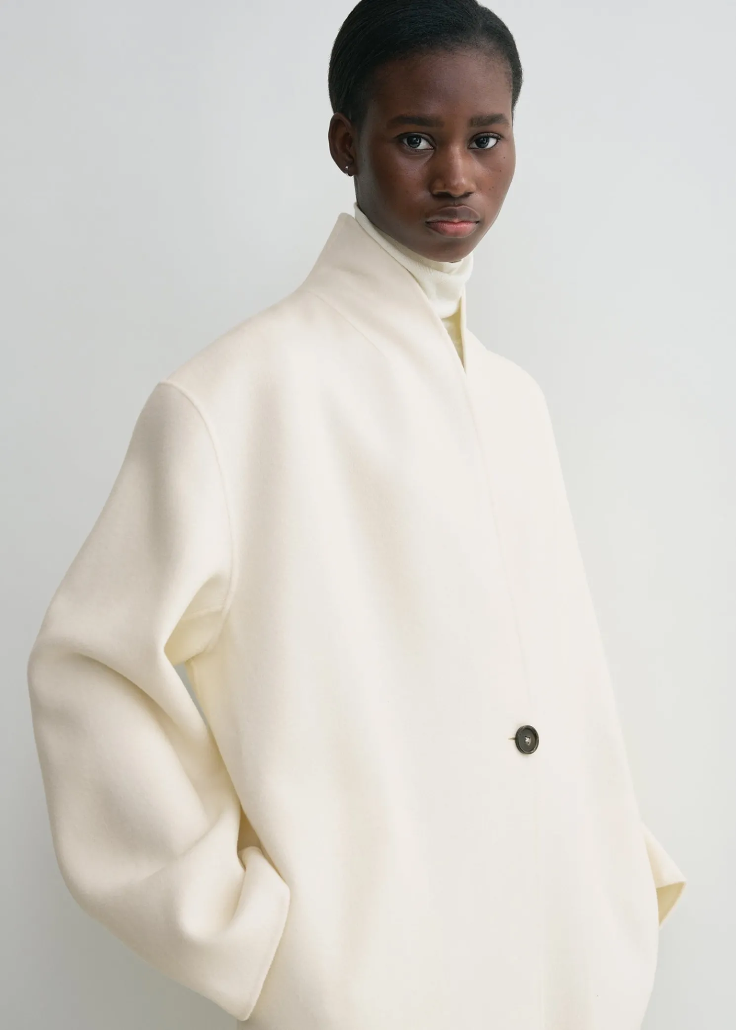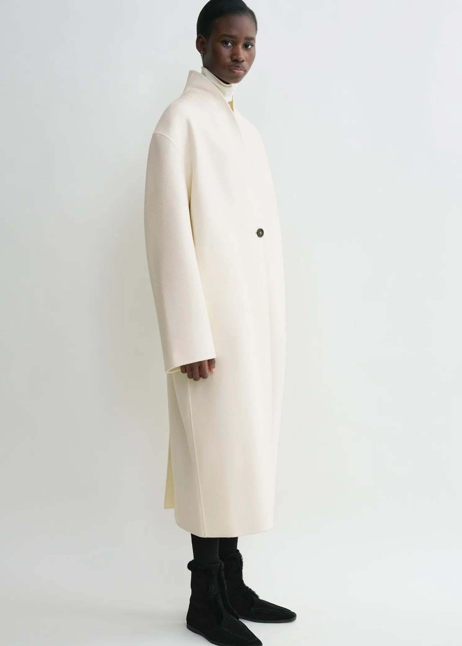 TOTEME coat outlined with a collarless, overlapped neckline that stands at the nape for a modern feel. Made from our signature wool doublé, it has a relaxed throw-on silhouette with a single-button front and side pockets.