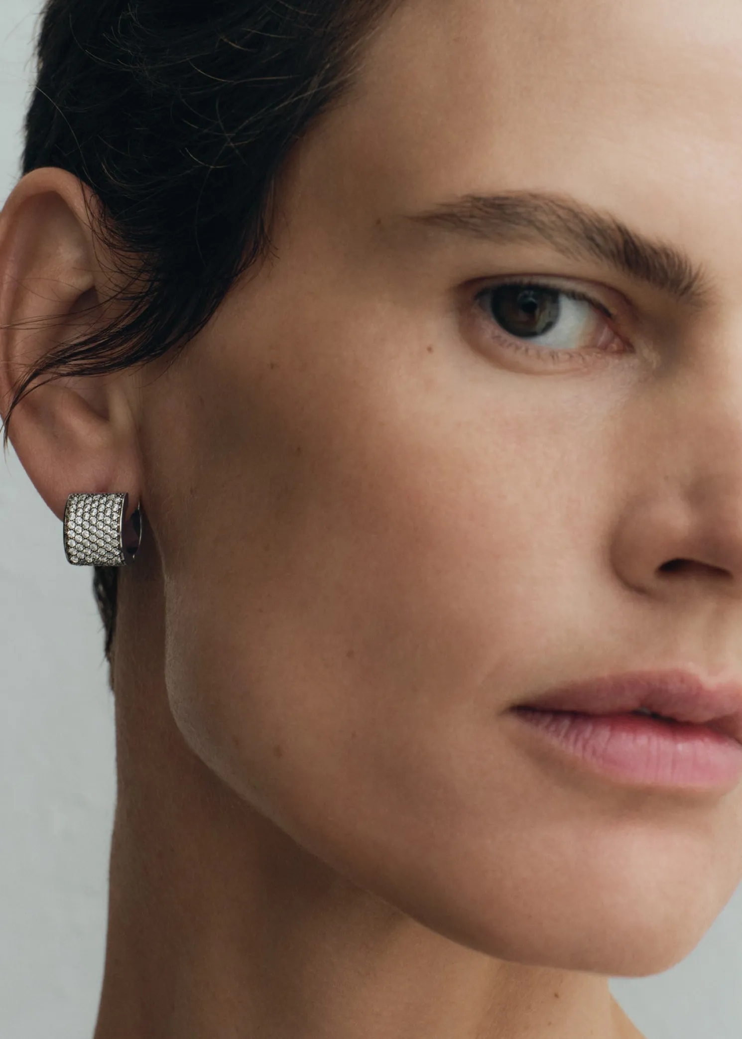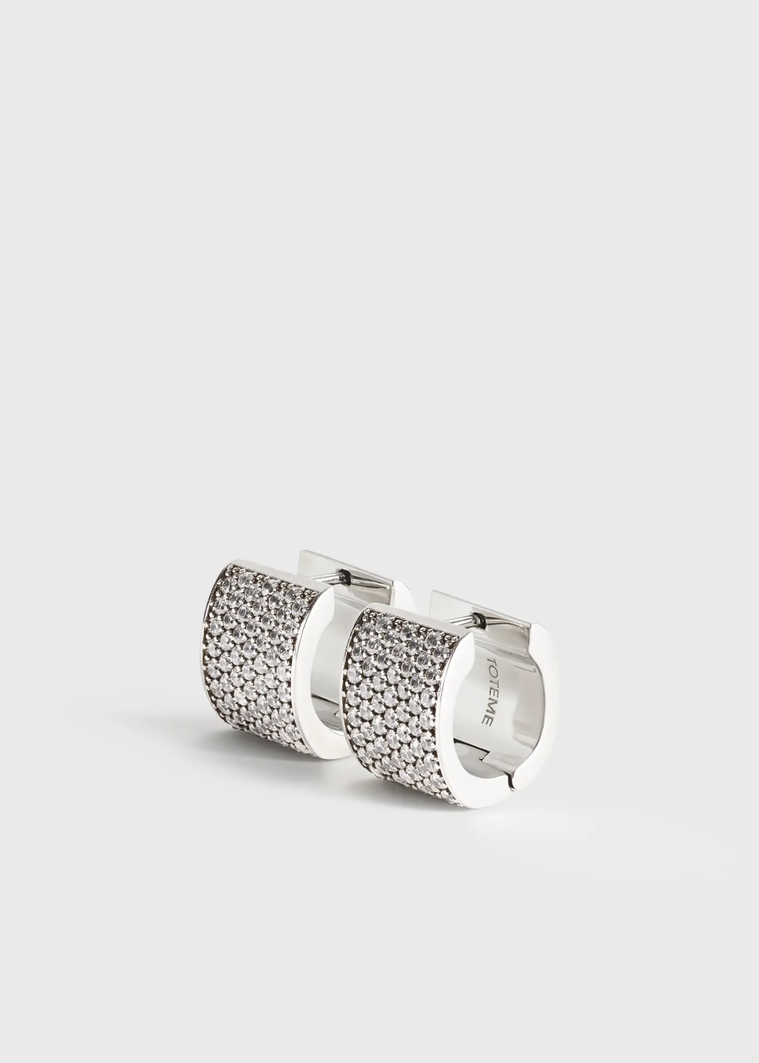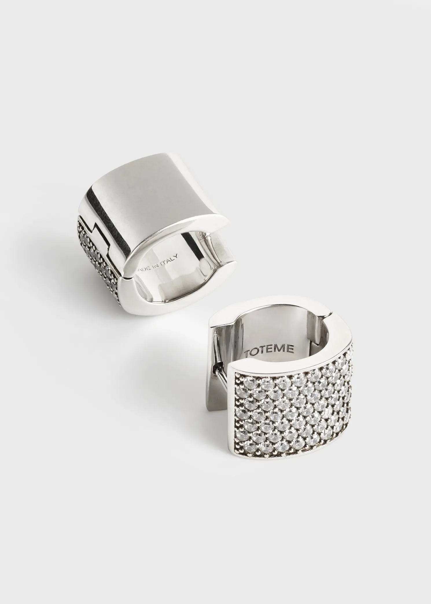 A slightly wider iteration from our signature jewelry collection, these TOTEME huggie hoops are pavé-set with 146 zircon stones for sparkling appeal. They are meticulously crafted in Italy from rhodium-plated brass with an asymmetric oval profile and fasten with an uncomplicated hinged mechanism.