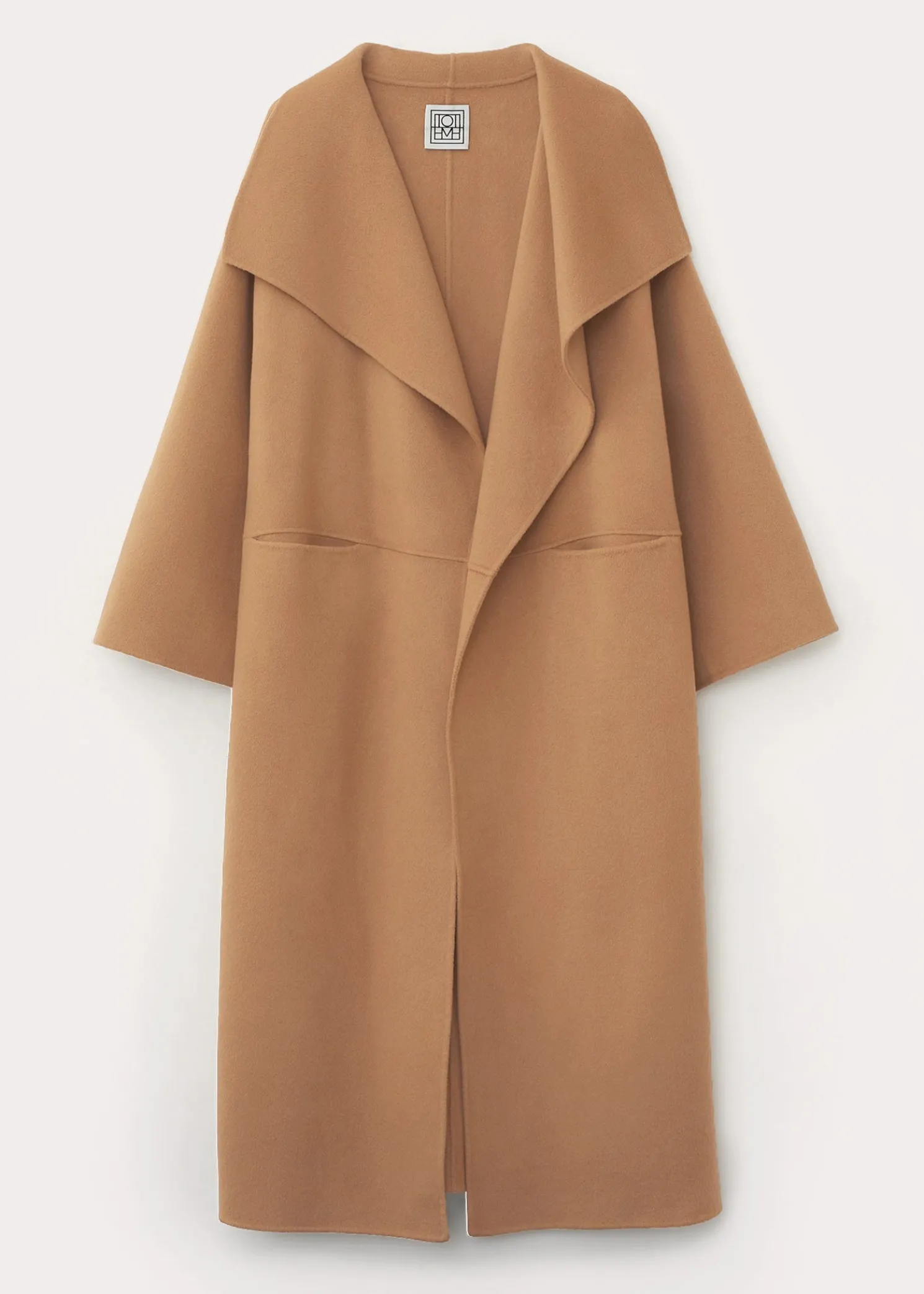 nSignature coat crafted from TOTEME’s soft doublé fabric – a blend of responsibly sourced wool and cashmere created by hand-stitching two fine layers together to achieve a double-faced finish with clean seams. It has an oversized silhouette with easy-to-style shawl lapels, dropped shoulders, and an open front which makes it perfect for layering, then is complete with inseam pockets and side slits. Coordinate it with the Long doublé scarf in the same color.