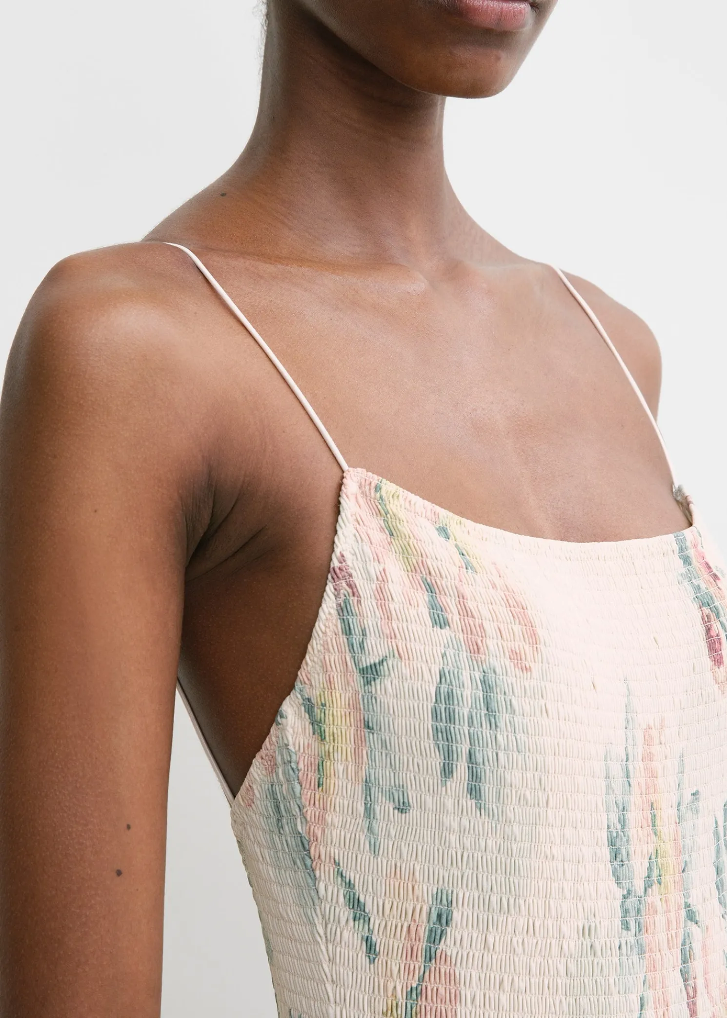Smocked TOTEME swimsuit made from jersey containing recycled polyamide yarns and a touch of elastane for a second-skin fit. It’s shaped to a modern silhouette with barely there straps, a low back and crotch lining. Complement the sun-kissed floral pattern with a tote and flip-flops.