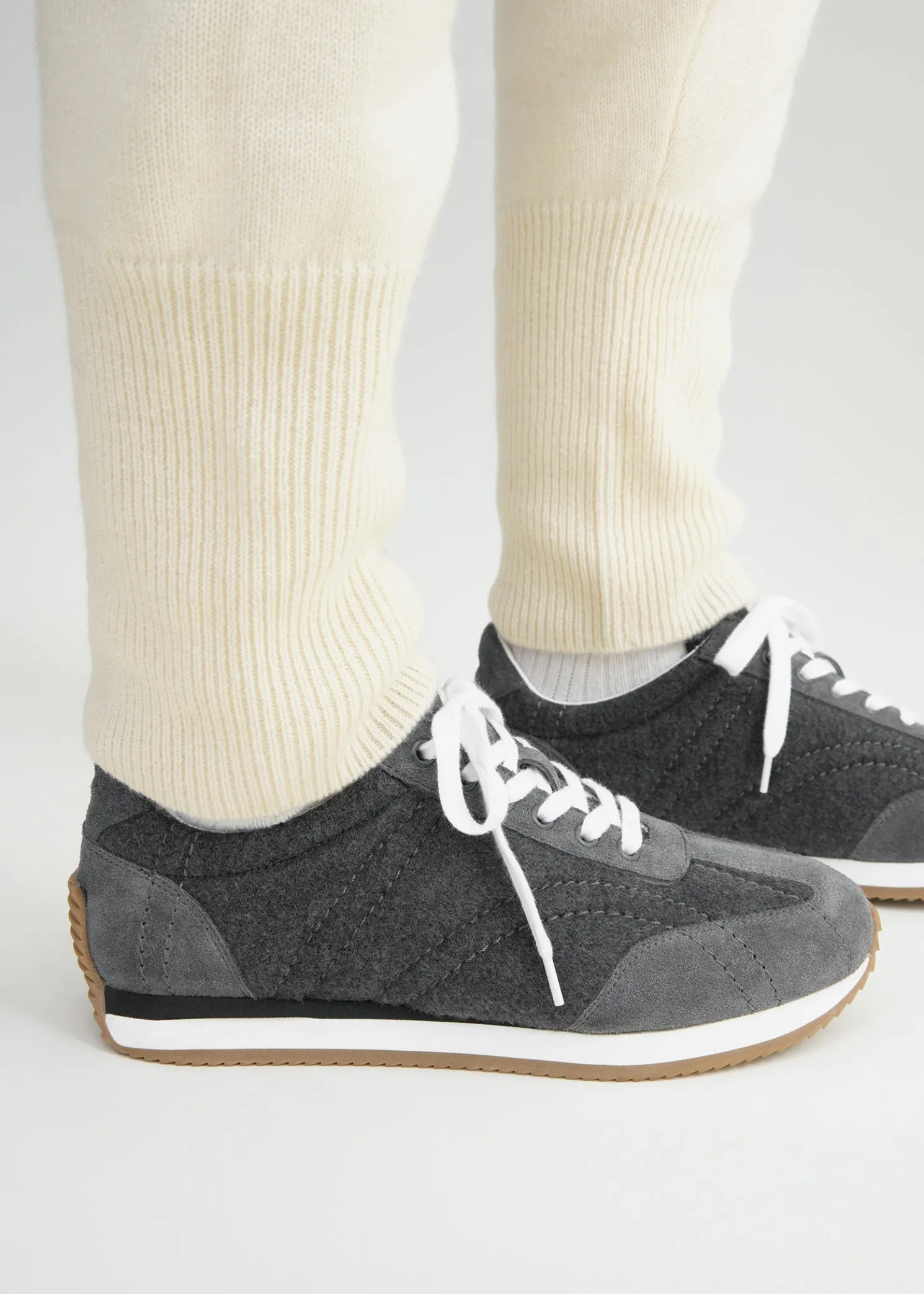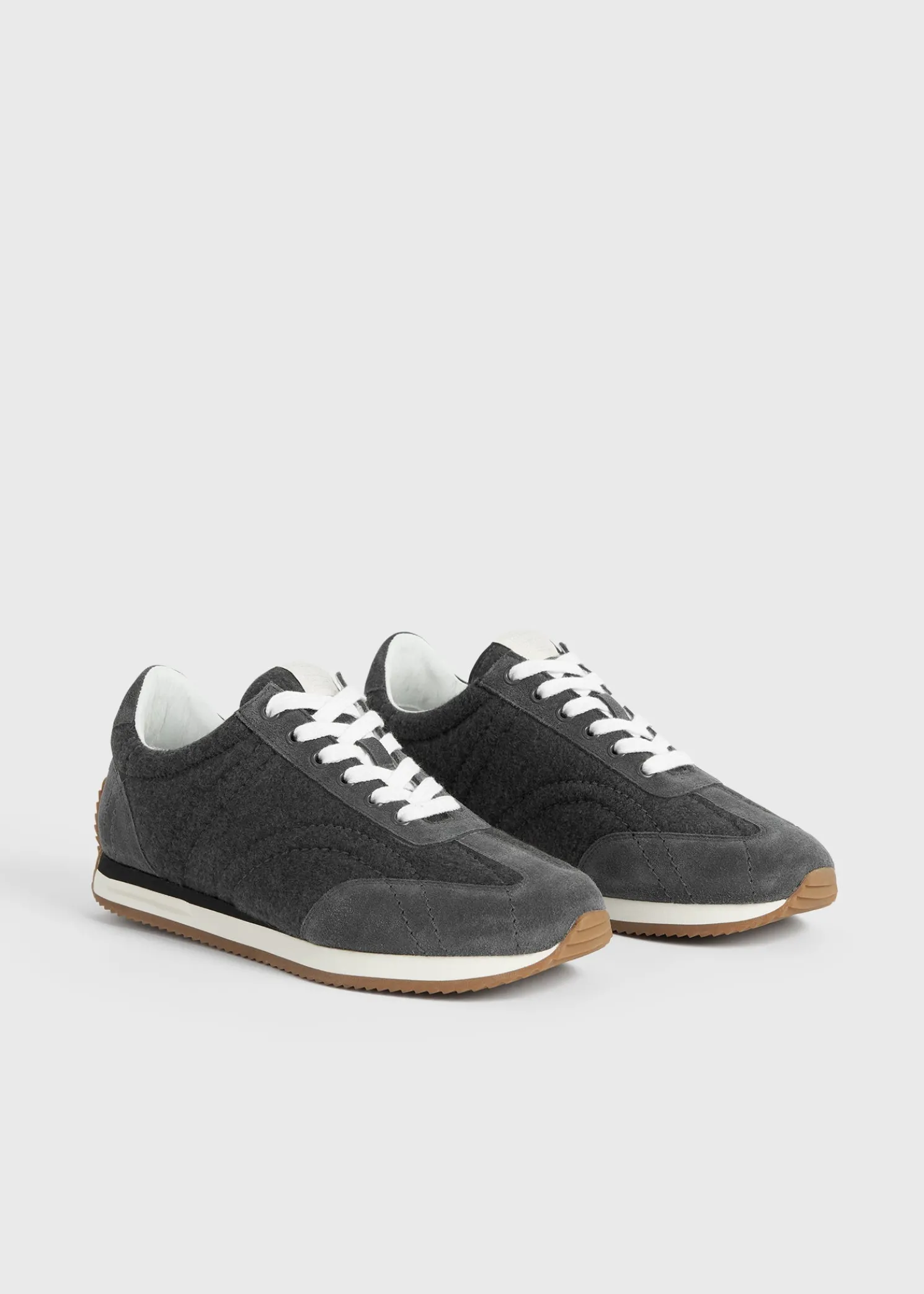 TOTEME sneakers reworked in a suede and flannel combination to evoke a wintry feel. They have white cotton laces and moisture-wicking terry lining, then are set on an anti-slip rubber sole. Wear them with a track suit after a workout.