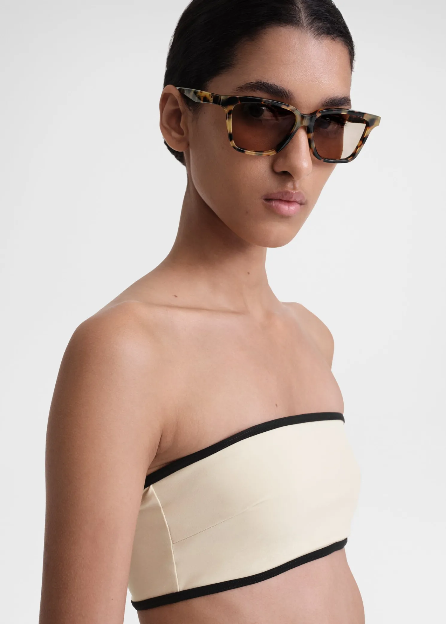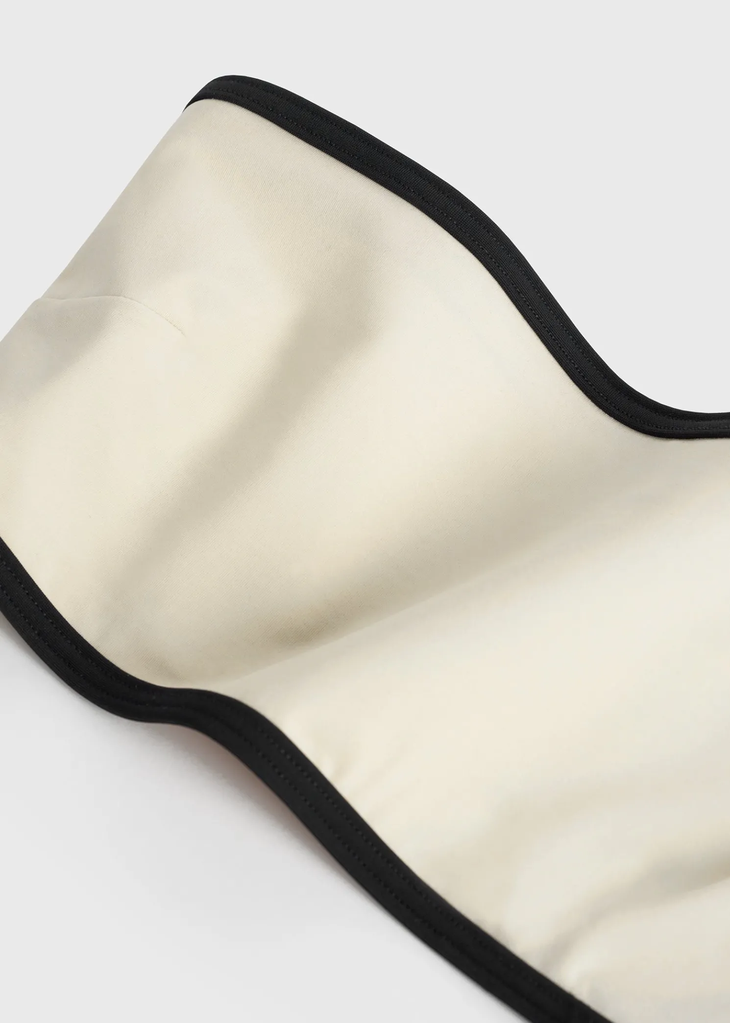 Minimalist bikini top inspired by the contrasting stripes on TOTEME’s Centered monogram silk scarf. It’s made from fully lined stretch jersey to a strapless bandeau silhouette that’s supported with a silicone trim inside. Wear it with the coordinating bikini bottoms or mix and match with the opposite color combination.