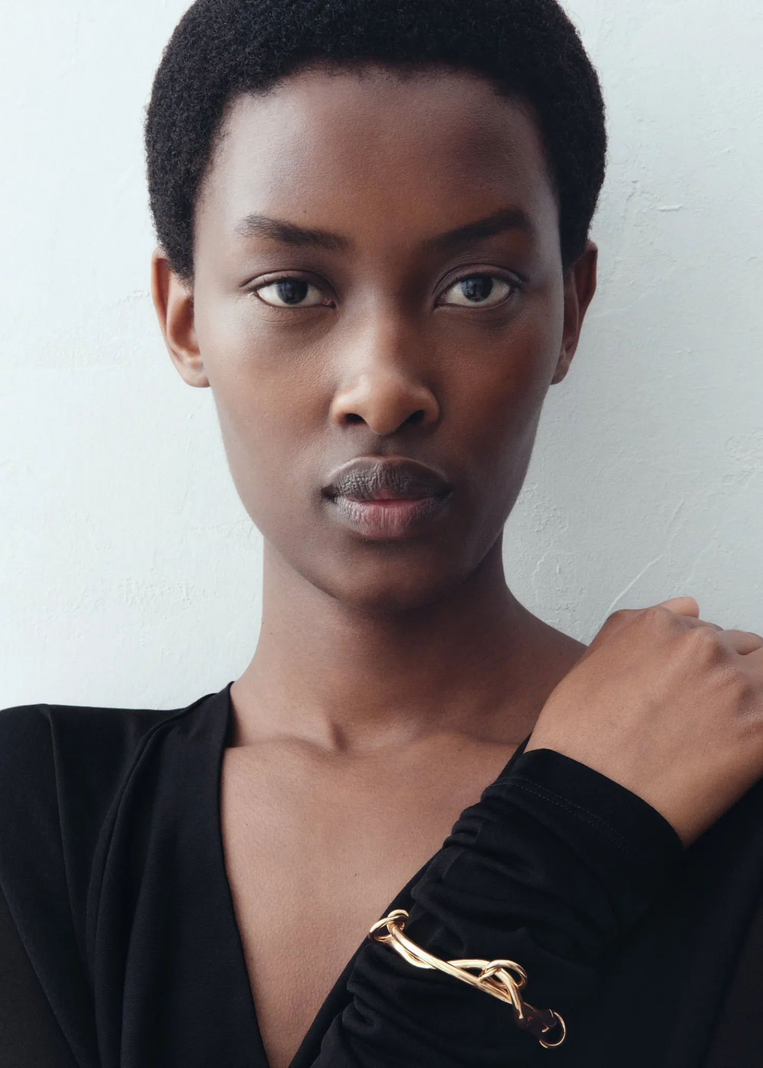 TOTEME cuff crafted in Italy with a sculptural swirling pattern that brings to mind intertwining vines. Made from polished gold-plated brass, it has multiple rings fixed in varying positions to imbue the piece with a sense of organic movement.