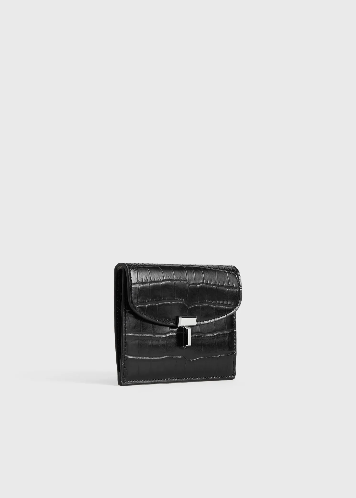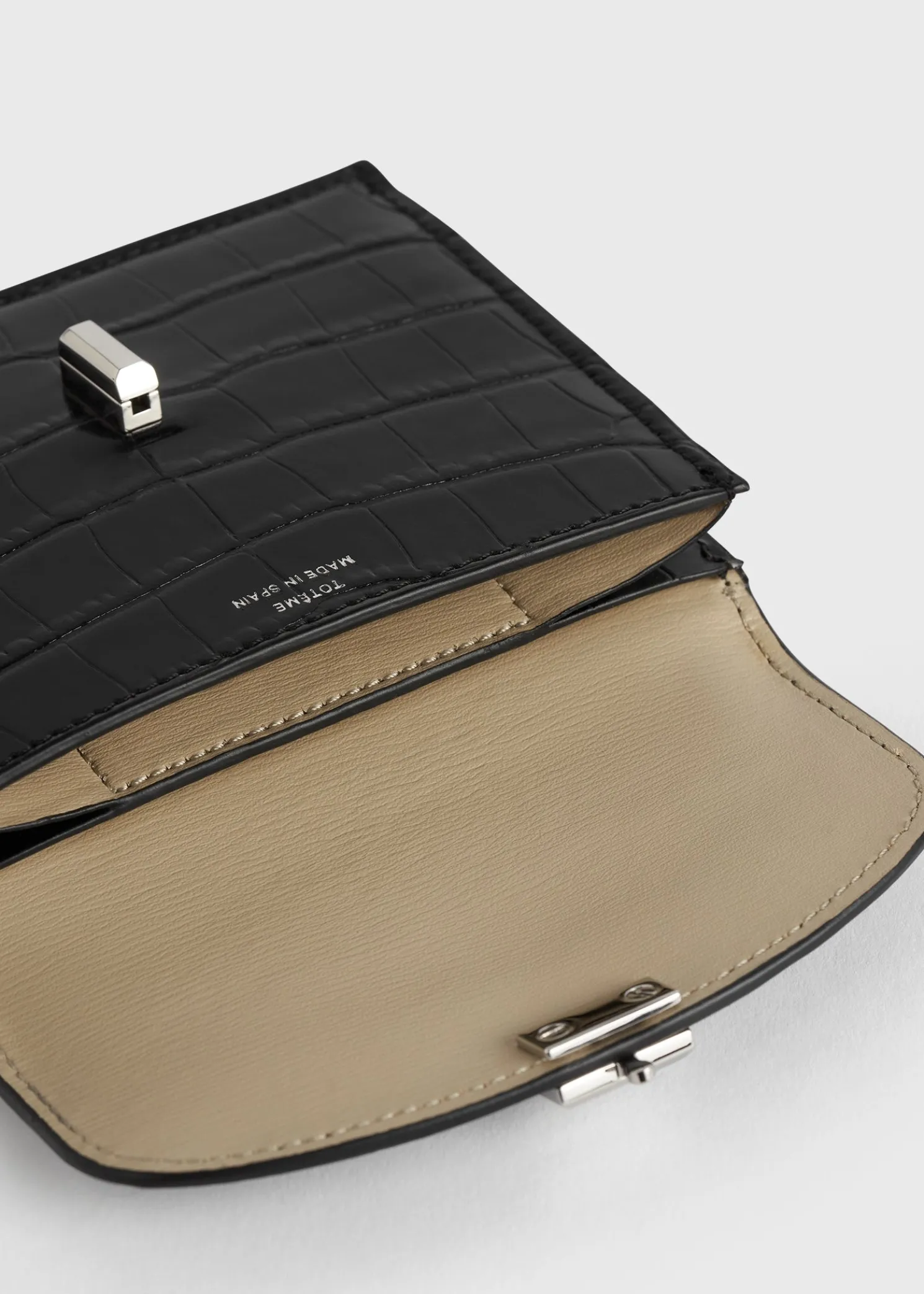 TOTEME’s T-Lock family is expanding into small leather goods, including this elegant cardholder. It is crafted from croco-embossed leather set with a metal clasp and fitted with multiple card slots.