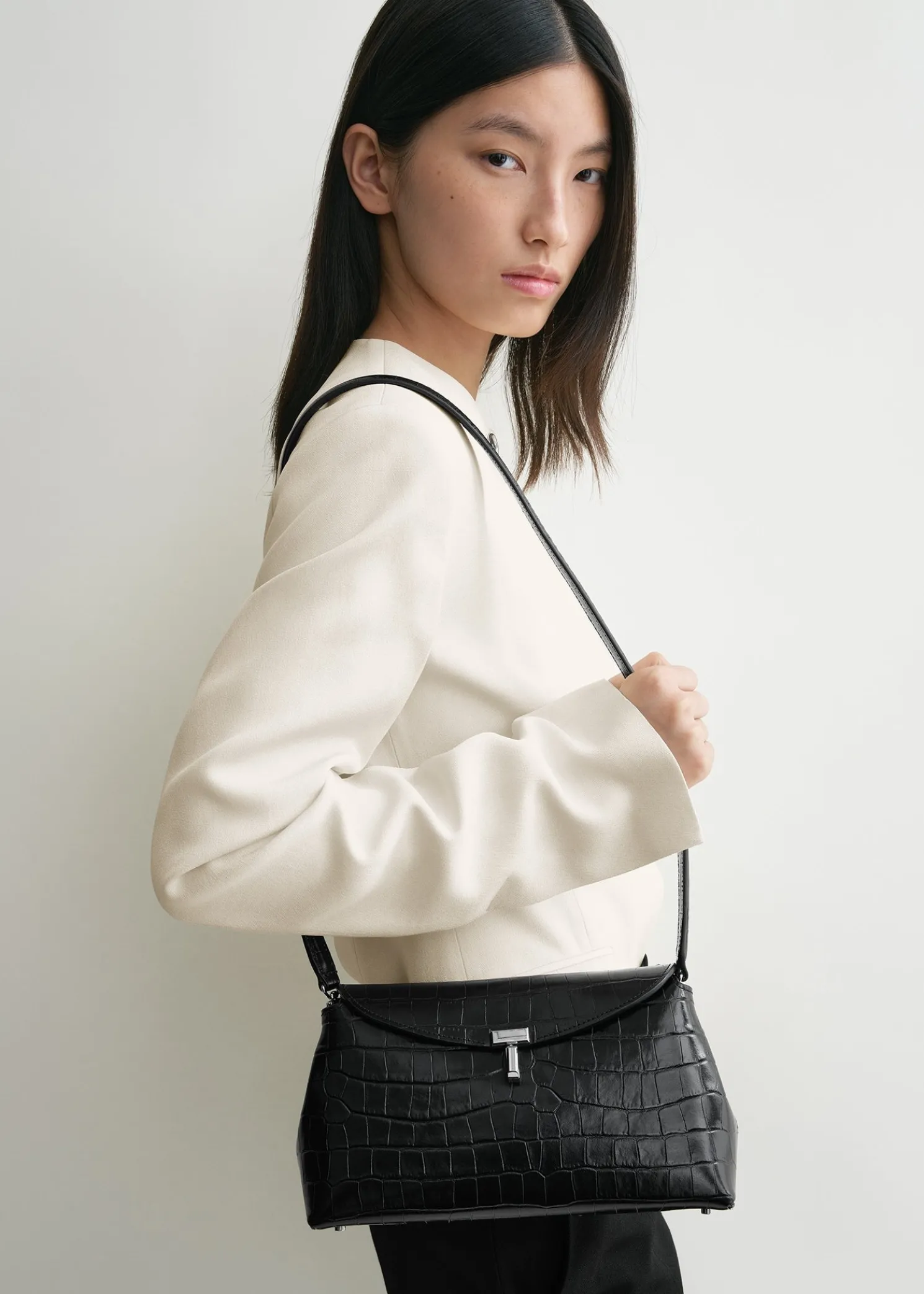 Sculptural TOTEME clutch bag named T-Lock after the silver-tone metal twist lock securing the curved top flap. It is crafted in Italy from crocodile-effect leather and fitted with an internal card slot. Hold it in your hand or carry it across the body using the optional strap.
