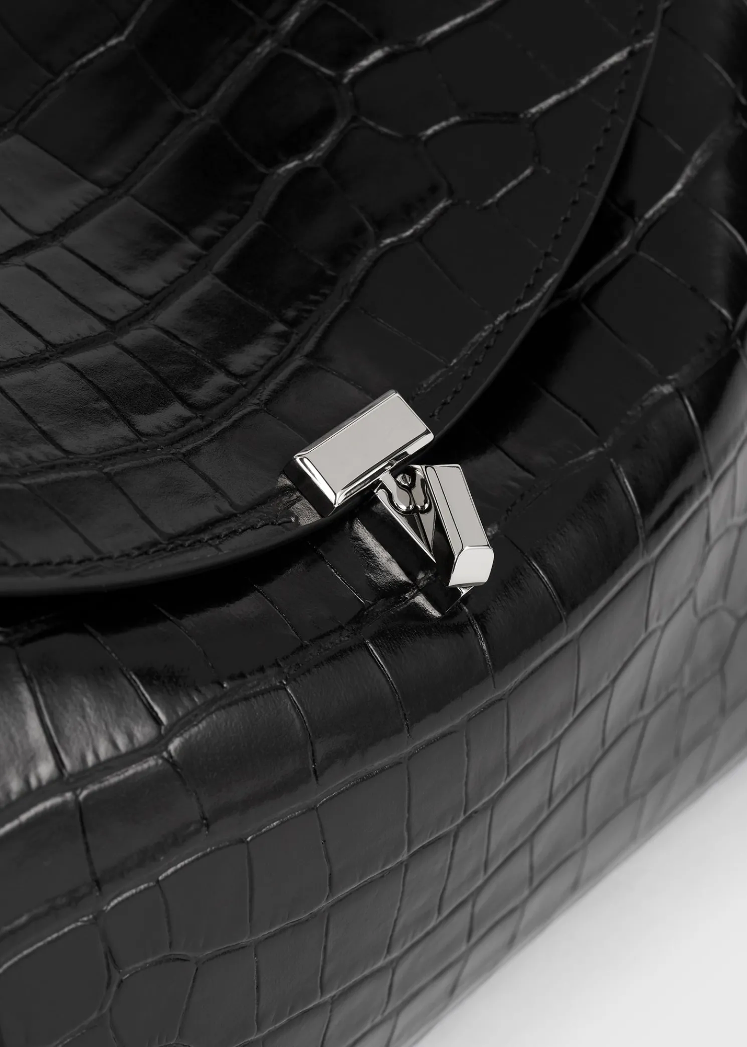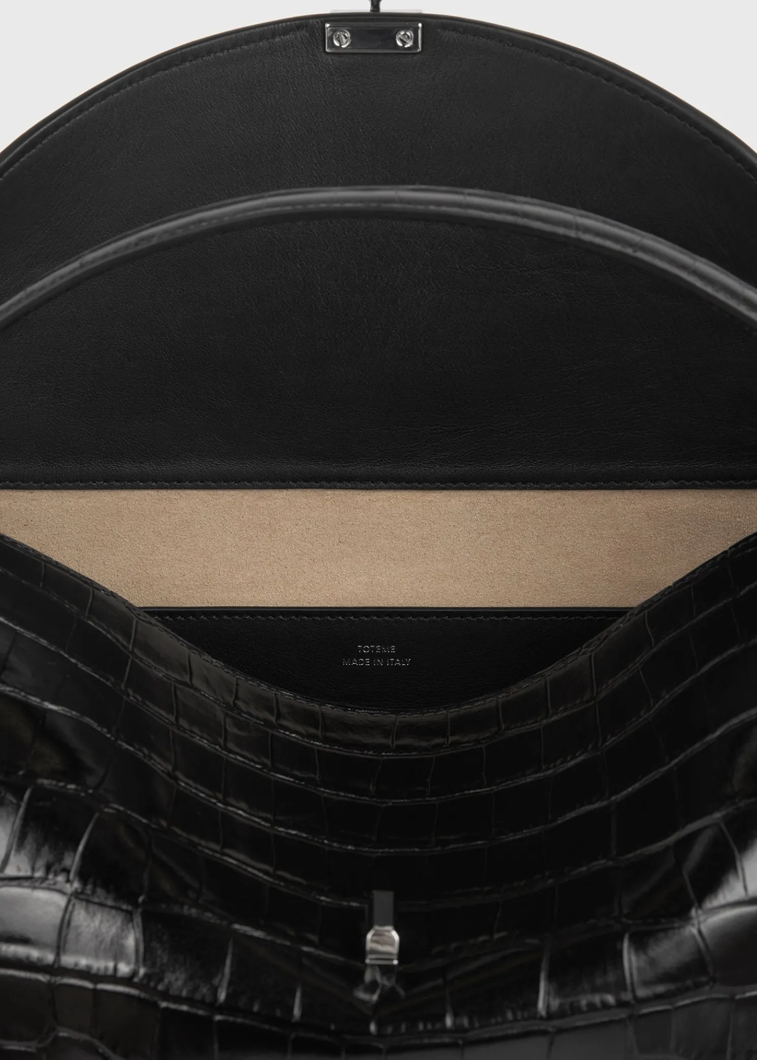 Everyday TOTEME bag outlined with a curved flap that complements the shape of the arm. It is crafted in Italy from crocodile-effect leather set with a silver-tone metal T-Lock, then fitted with two internal slip pockets. Carry it from the top handle or the detachable and adjustable strap for different styling options.