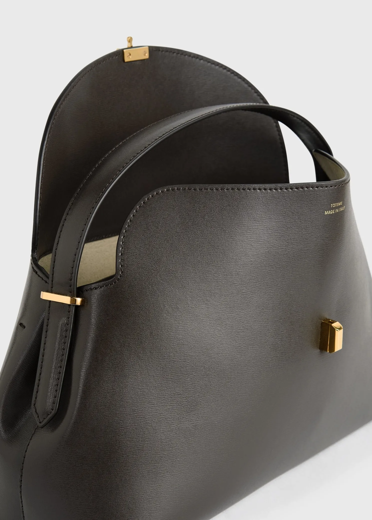 Everyday TOTEME bag sculpted with a curved top that complements the shape of the hand and arm. It is handcrafted in Italy from softly textured Palmellatta leather and finished with a metal T-Lock and protective feet, then lined in microsuede fitted with two leather slip pockets. Carry it from the top handle or from the detachable and adjustable shoulder strap for different styling options.