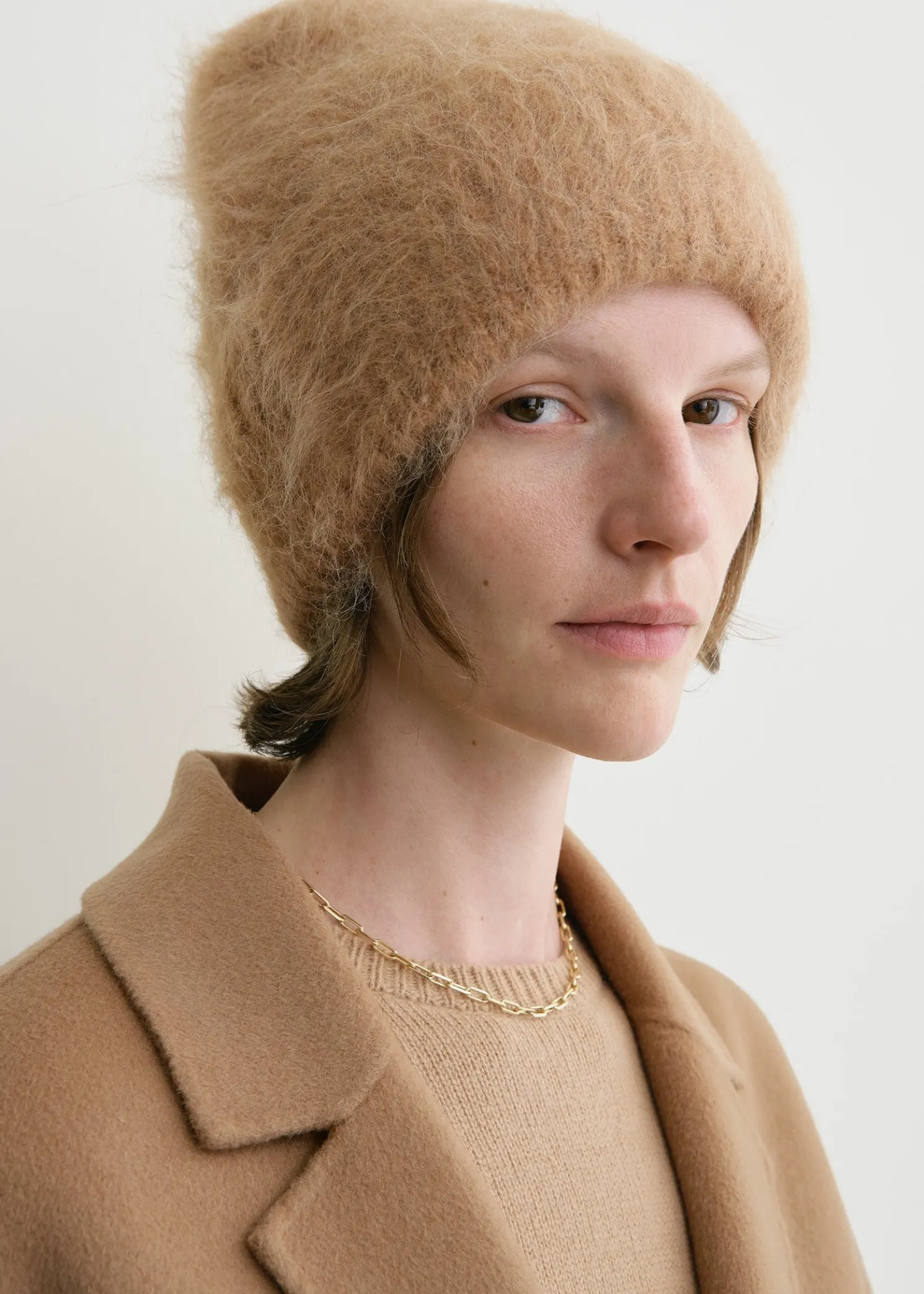 TOTEME beanie hat imagined as a warm winter set complete with the Boxy alpaca knit. It Is knitted from a fuzzy alpaca blend with a mélange effect and can be worn with the edge folded or extended.