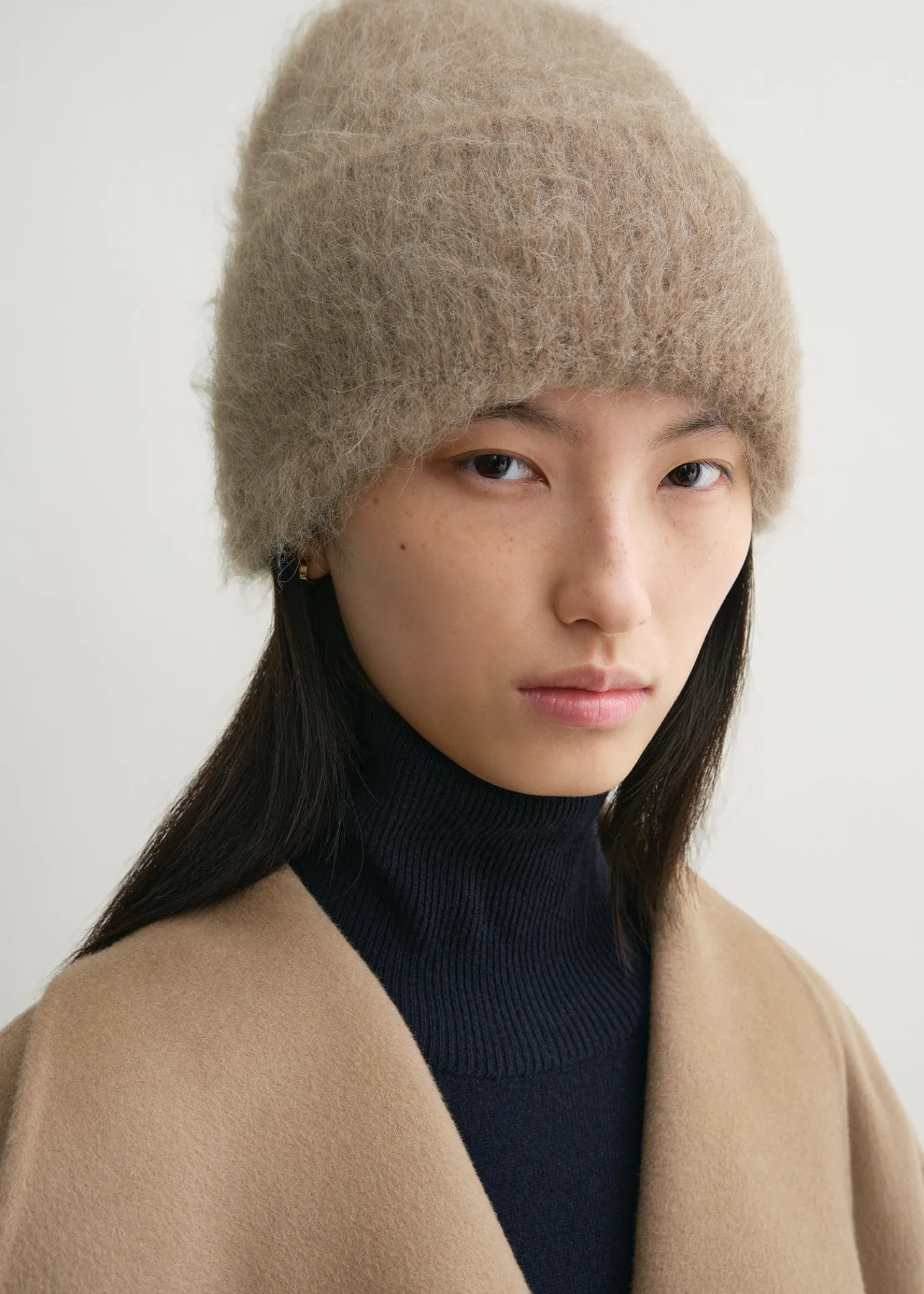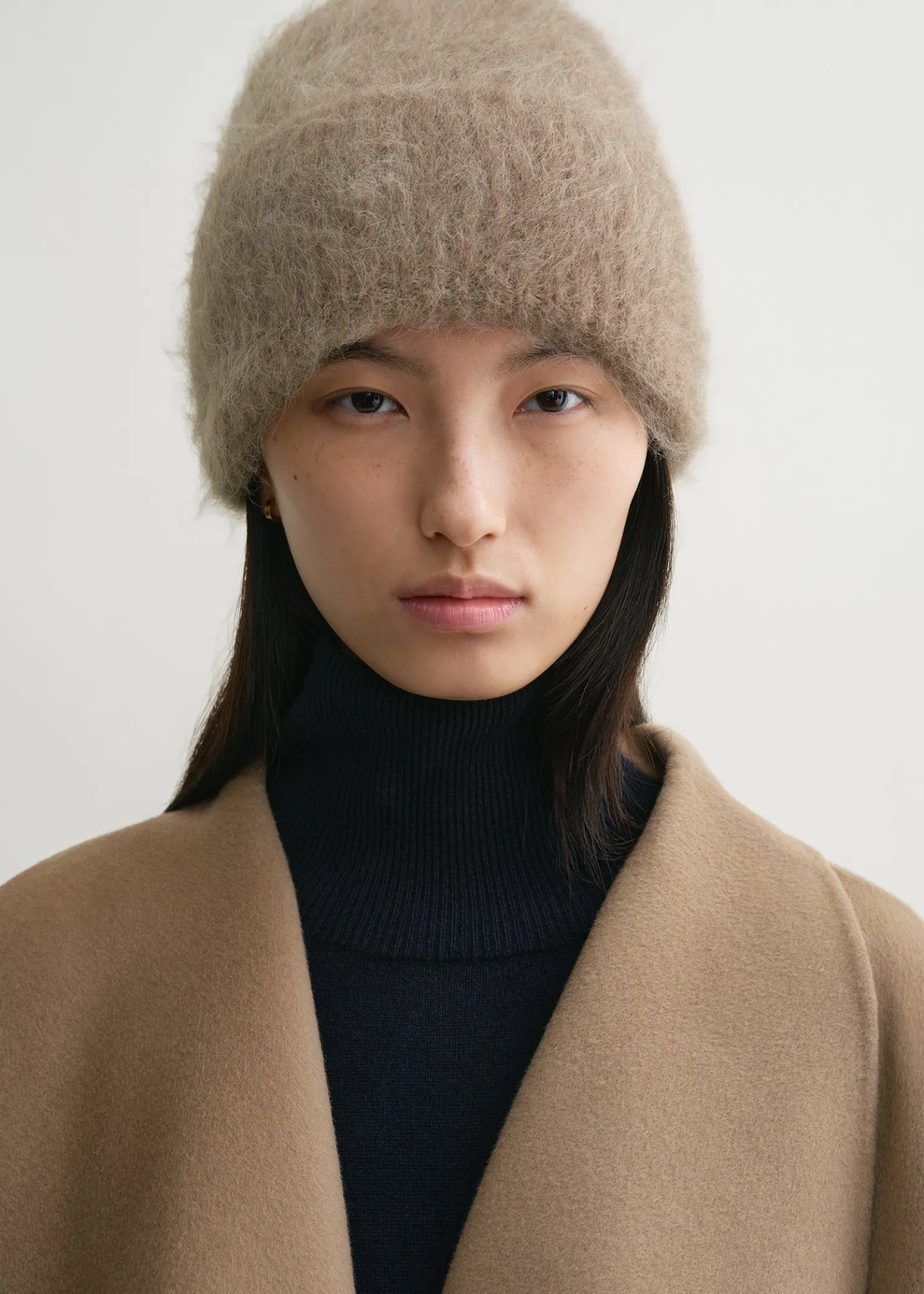 TOTEME beanie hat imagined as a warm winter set complete with the Boxy alpaca knit. It Is knitted from a fuzzy alpaca blend with a mélange effect and can be worn with the edge folded or extended.