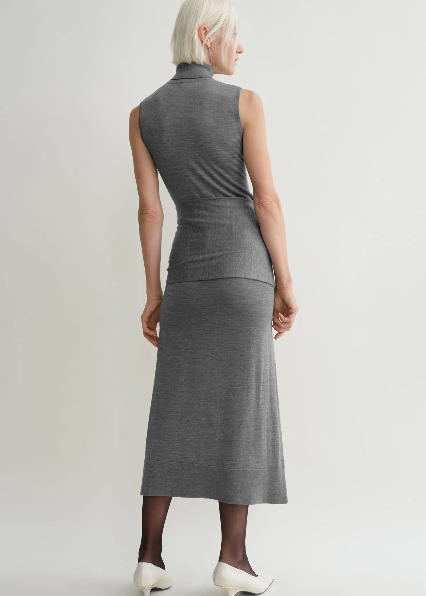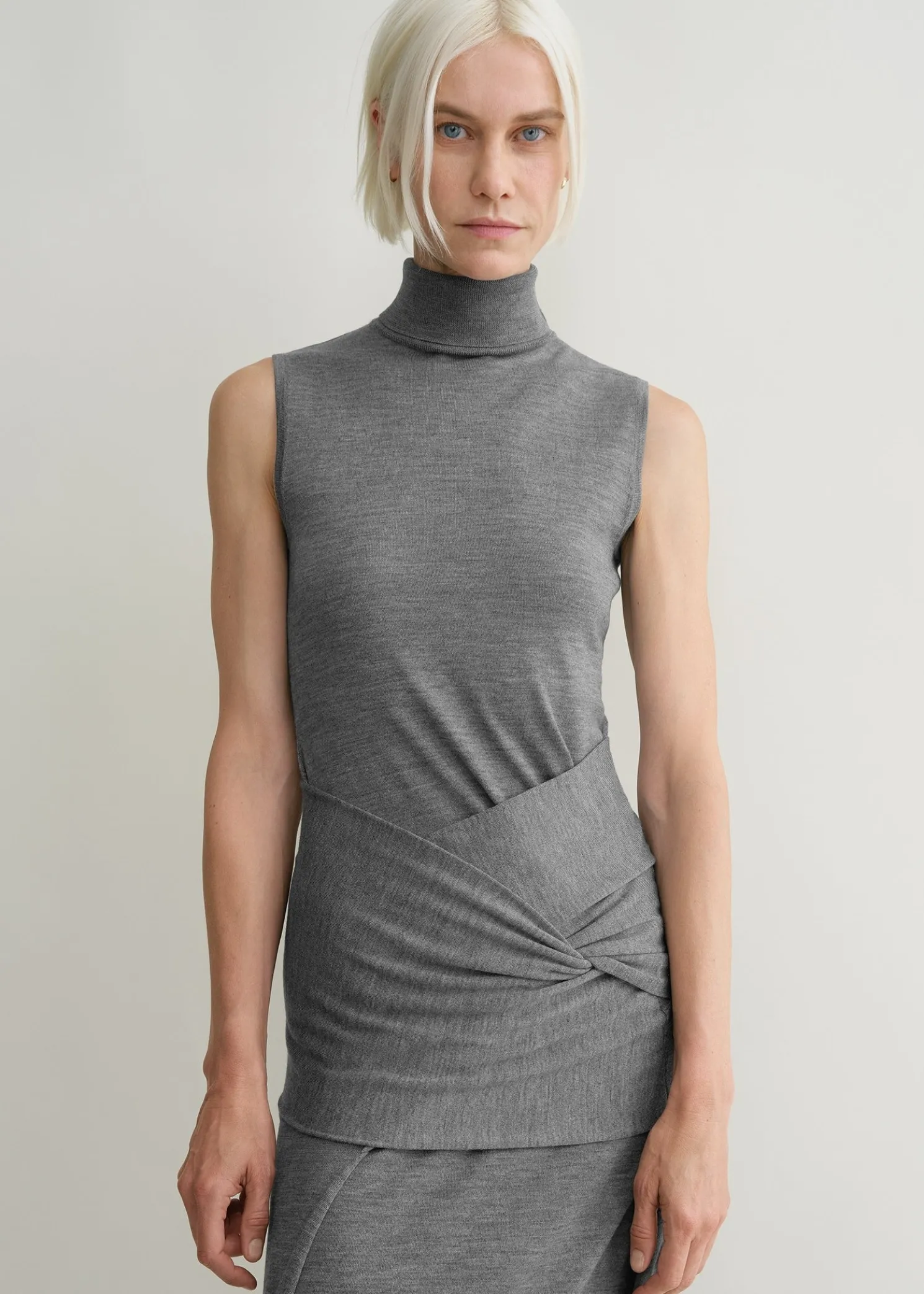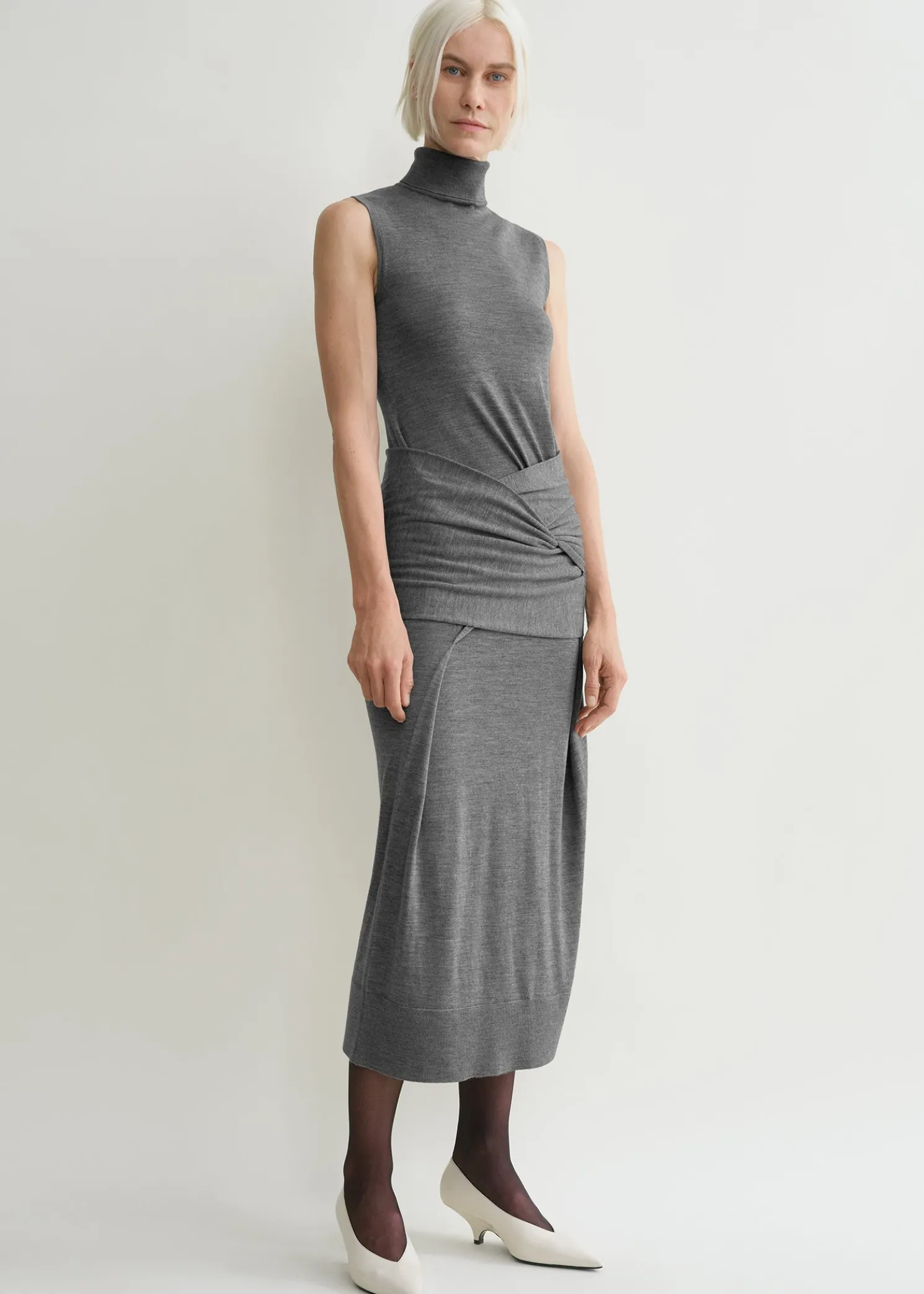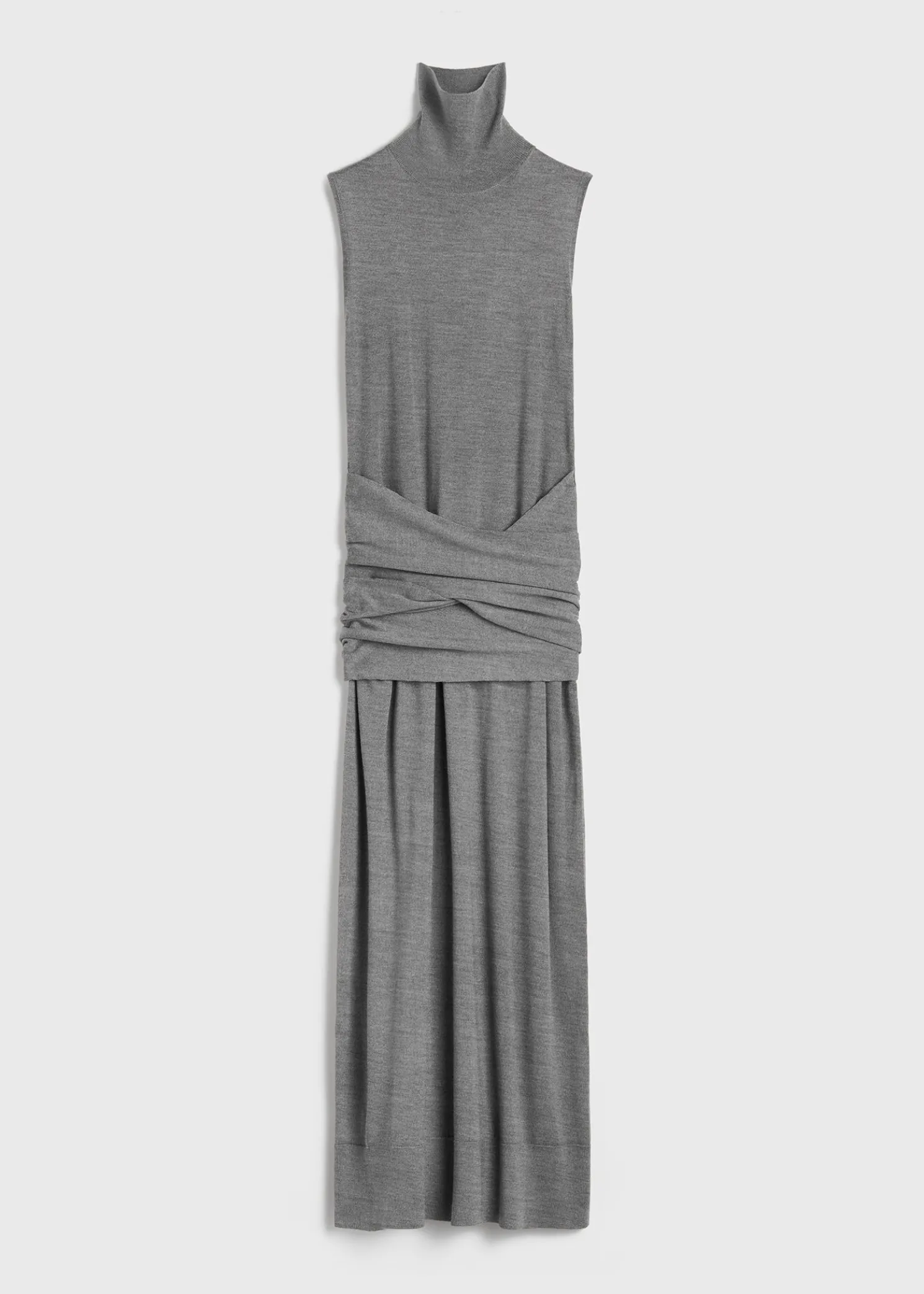 TOTEME winter dress with attached twisted panels that wrap around the waist for sculptural draping. It is knitted from light merino wool and silk to a long sleeveless silhouette with a turtleneck. Style it with pumps for a cocktail party.