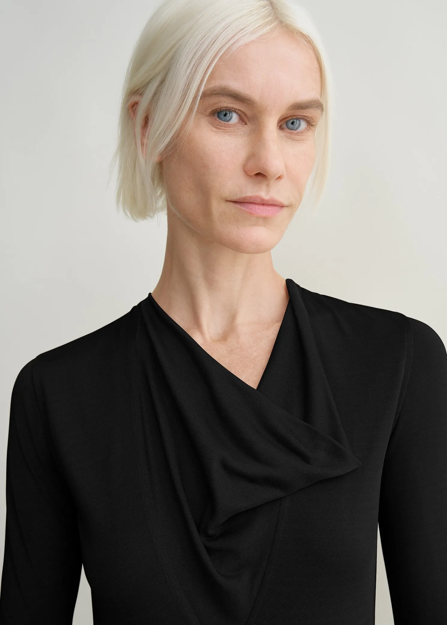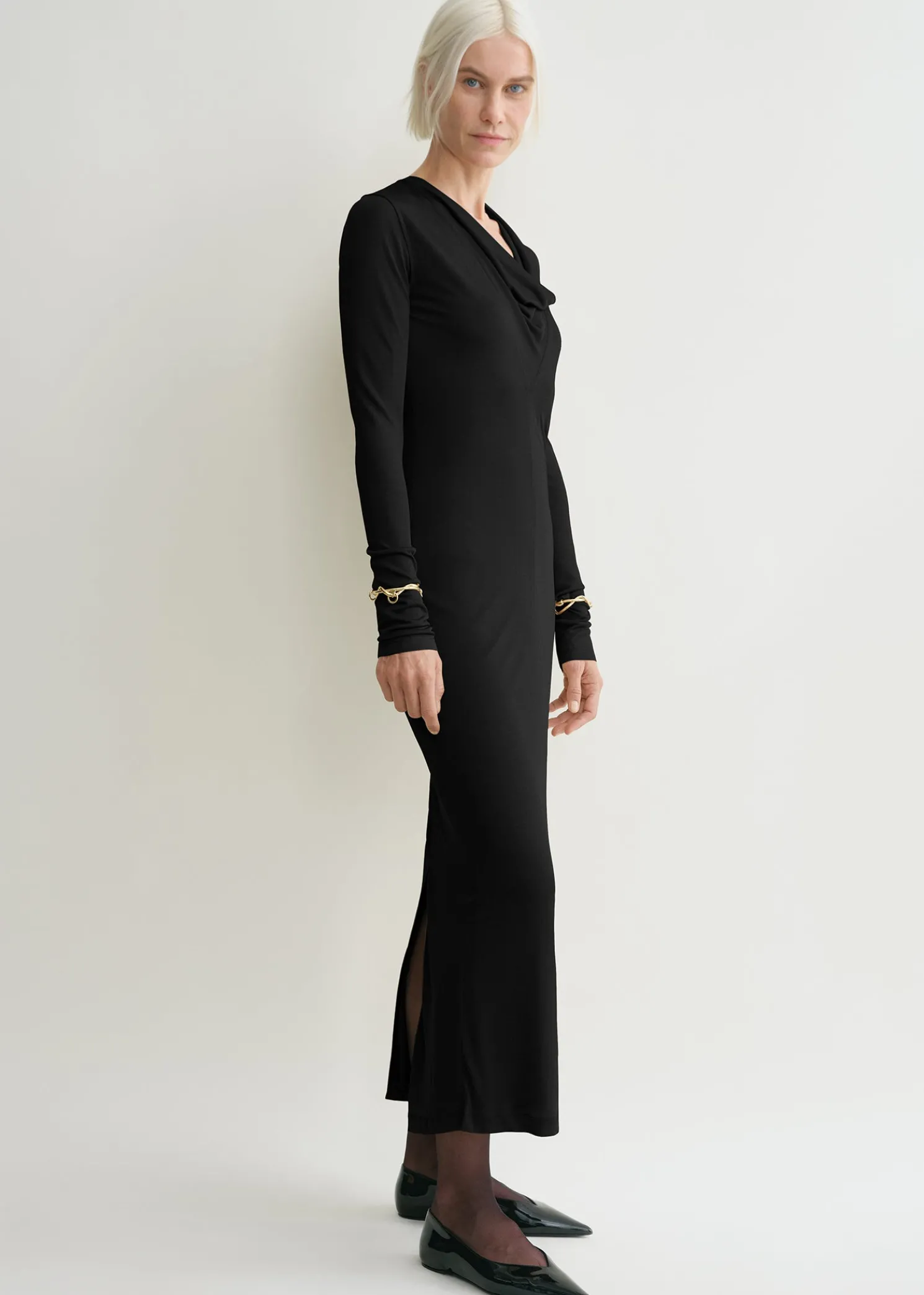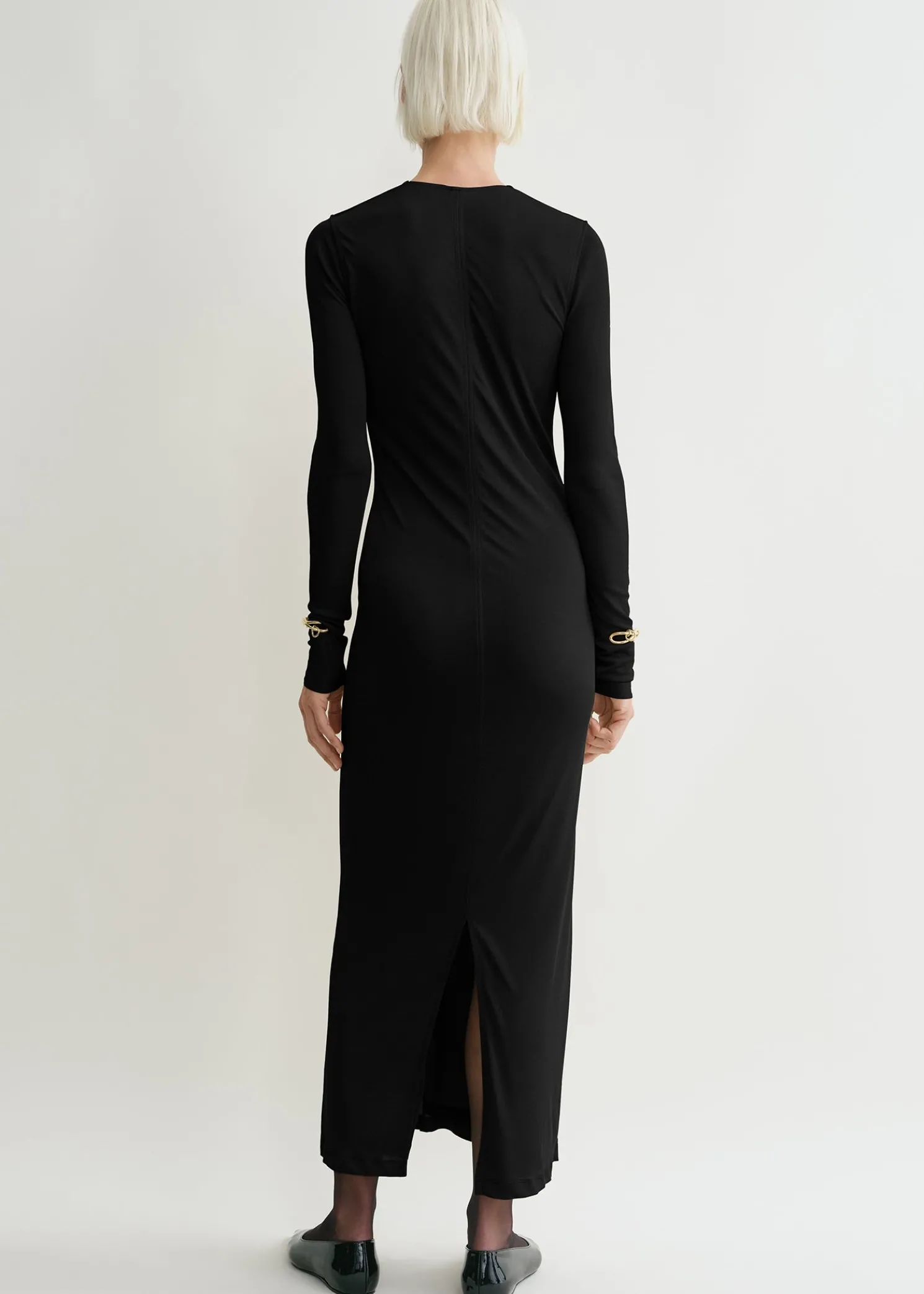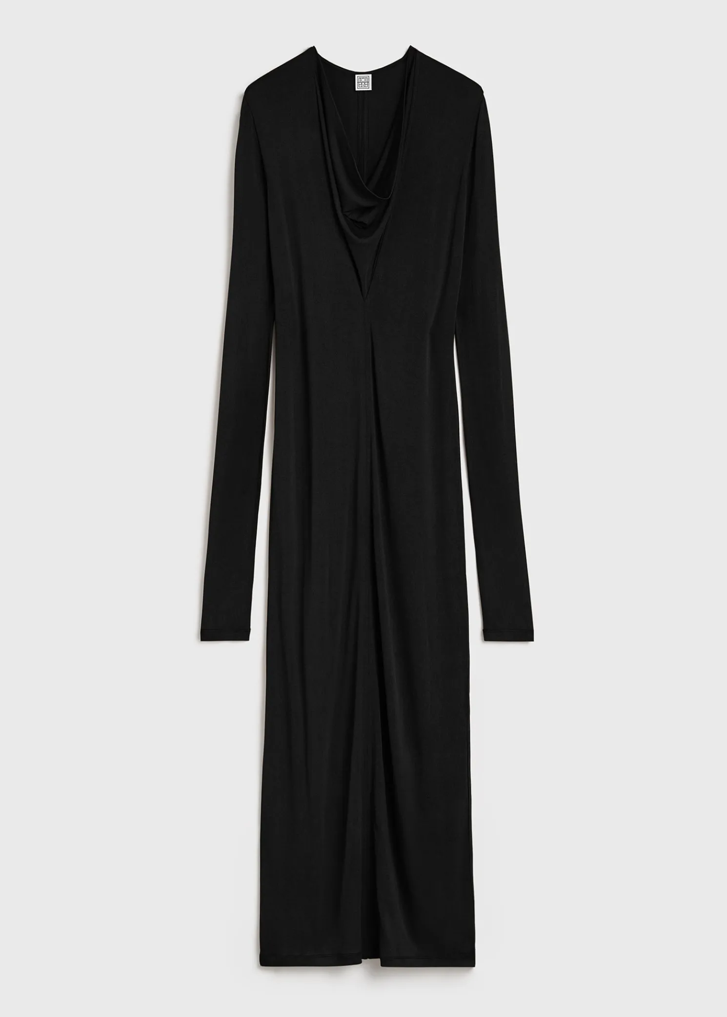 TOTEME dress in semi-sheer, double-layered jersey as a nod to the season’s transparency theme. It has a deep V-neckline with a sewn-in panel that drapes like a cowl neckline and is framed by extra-long sleeves that slouch at the wrists. Wear it with pumps to dine out.