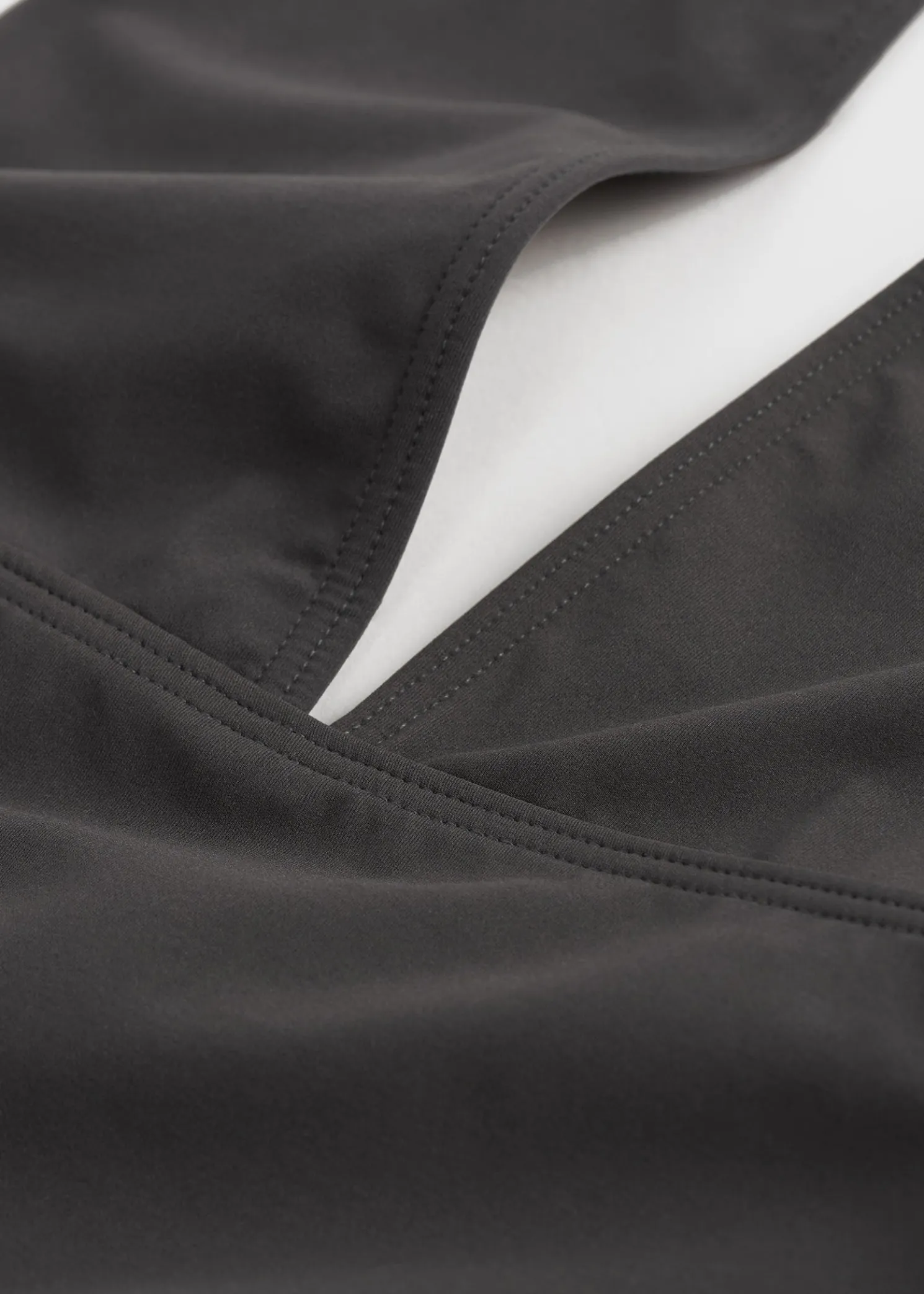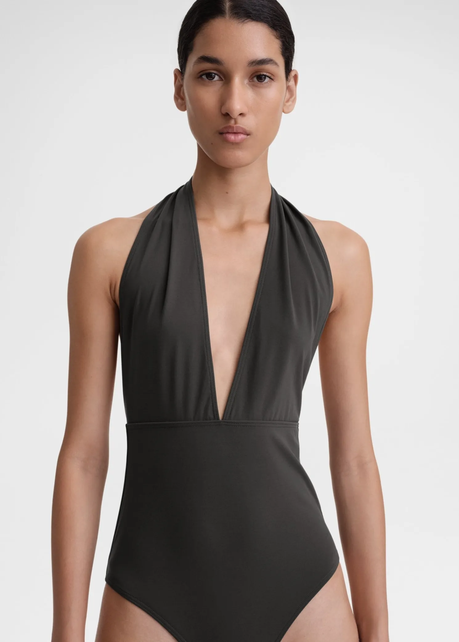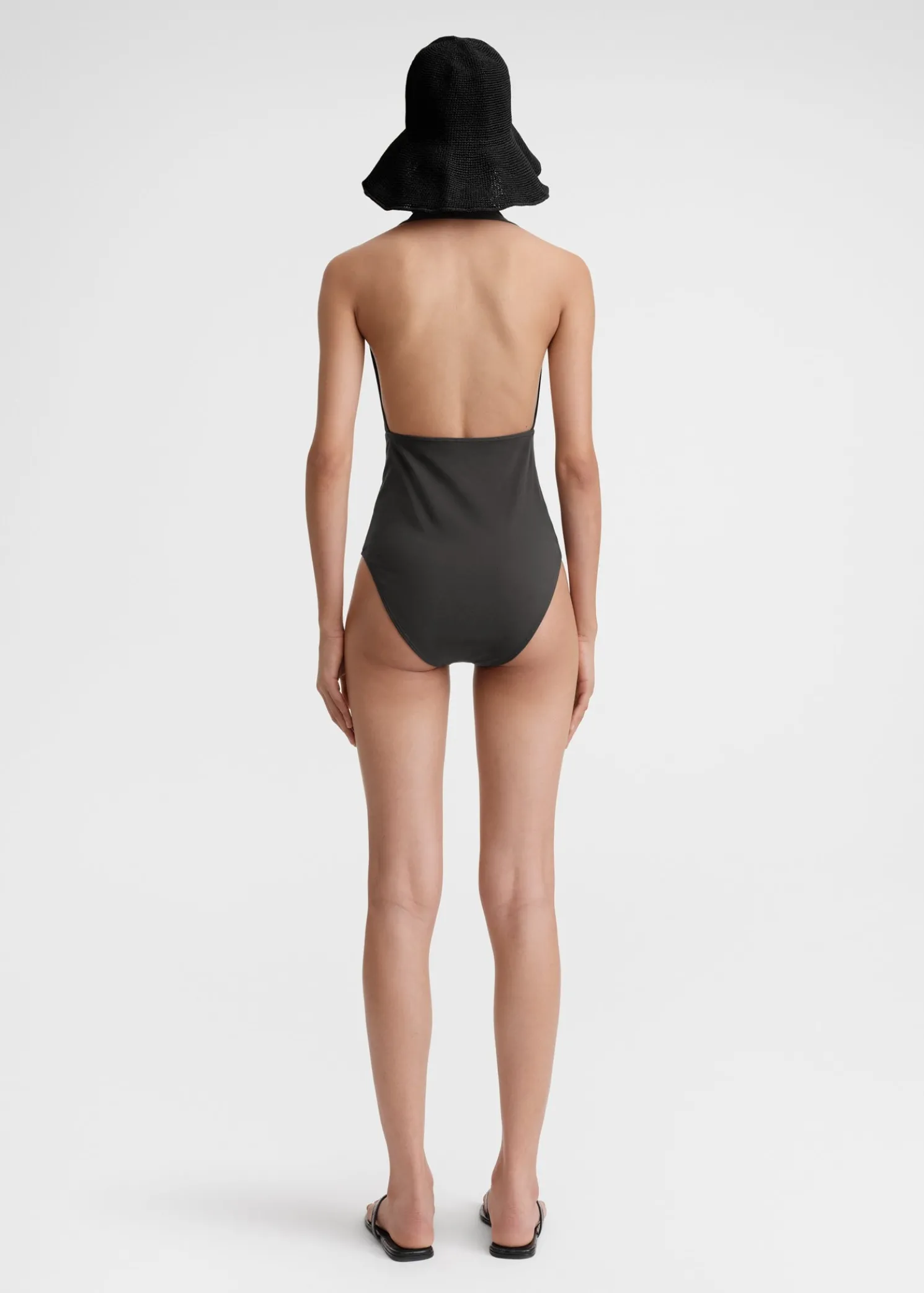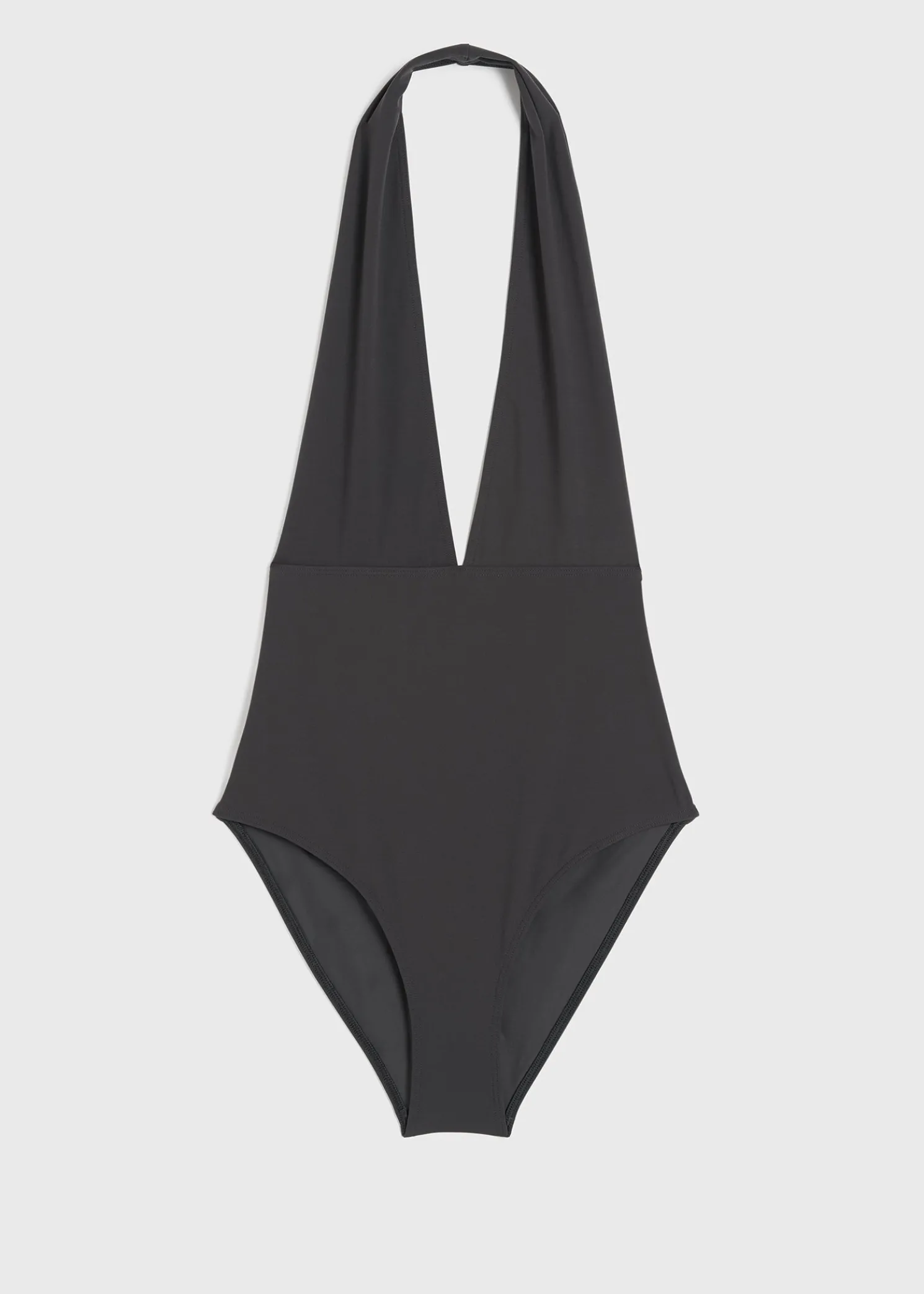 TOTEME swimsuit defined with a plunging halterneck matched with a low back. It’s made from stretch jersey with recycled fibers and has medium-high legs as well as full tonal lining. Add a scarf and sunglasses to relax by the pool.