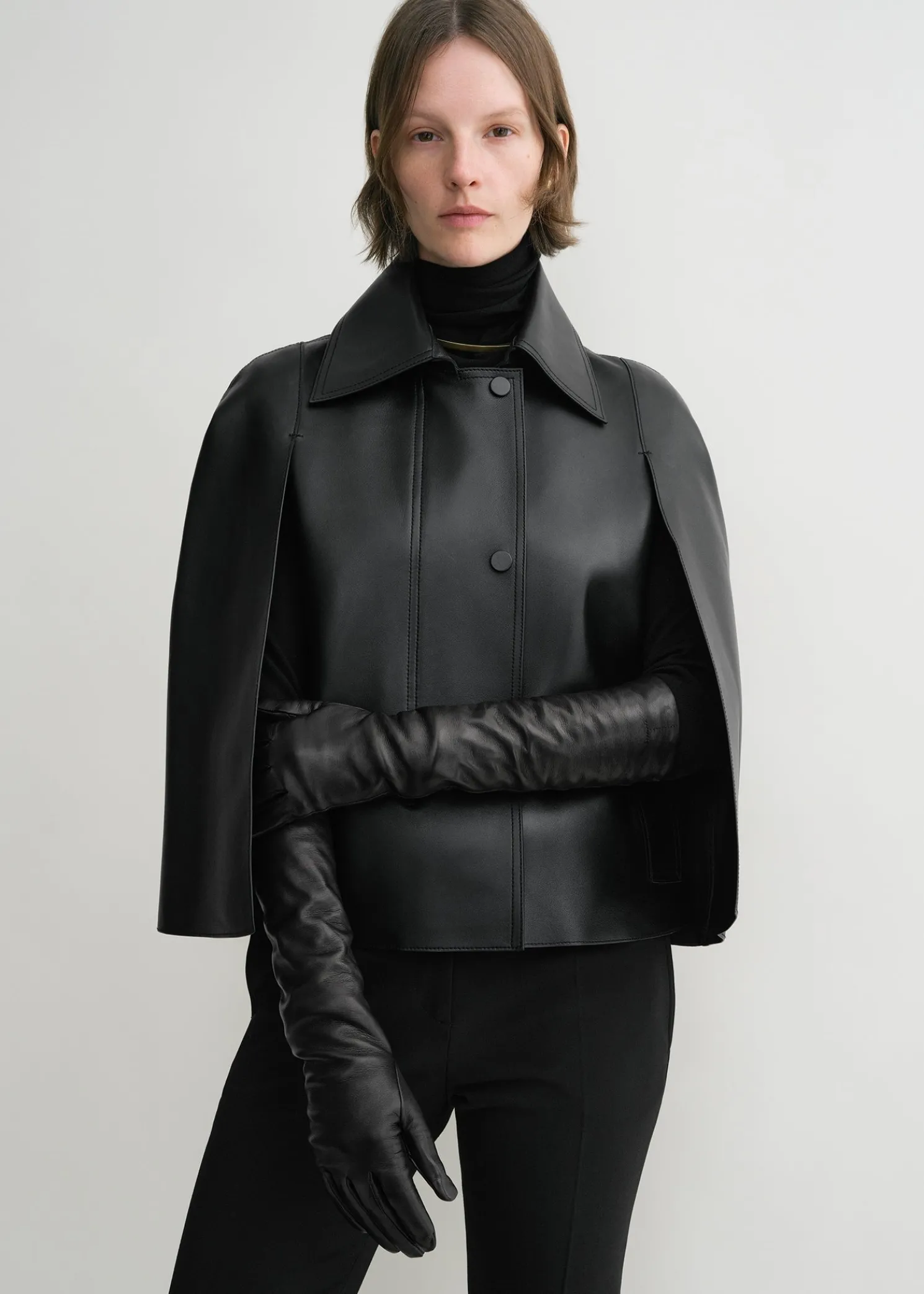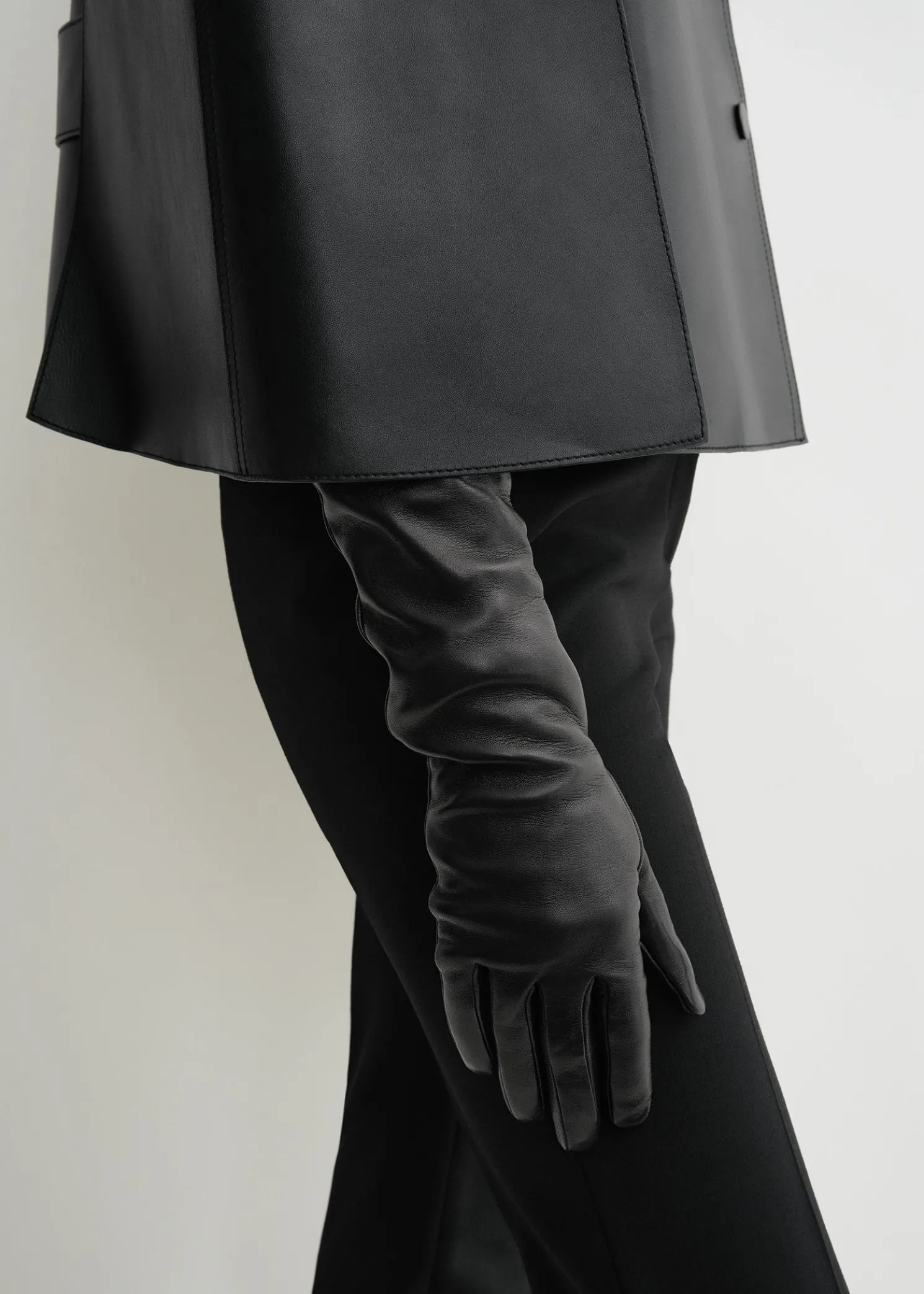 TOTEME gloves expertly crafted from butter-soft Nappa leather with a fine one-layer construction. They have an elongated silhouette discreetly stitched at the cuff with a refined letter T and are lined with knitted wool and cashmere fibers. Wear them to elevate winter looks. n