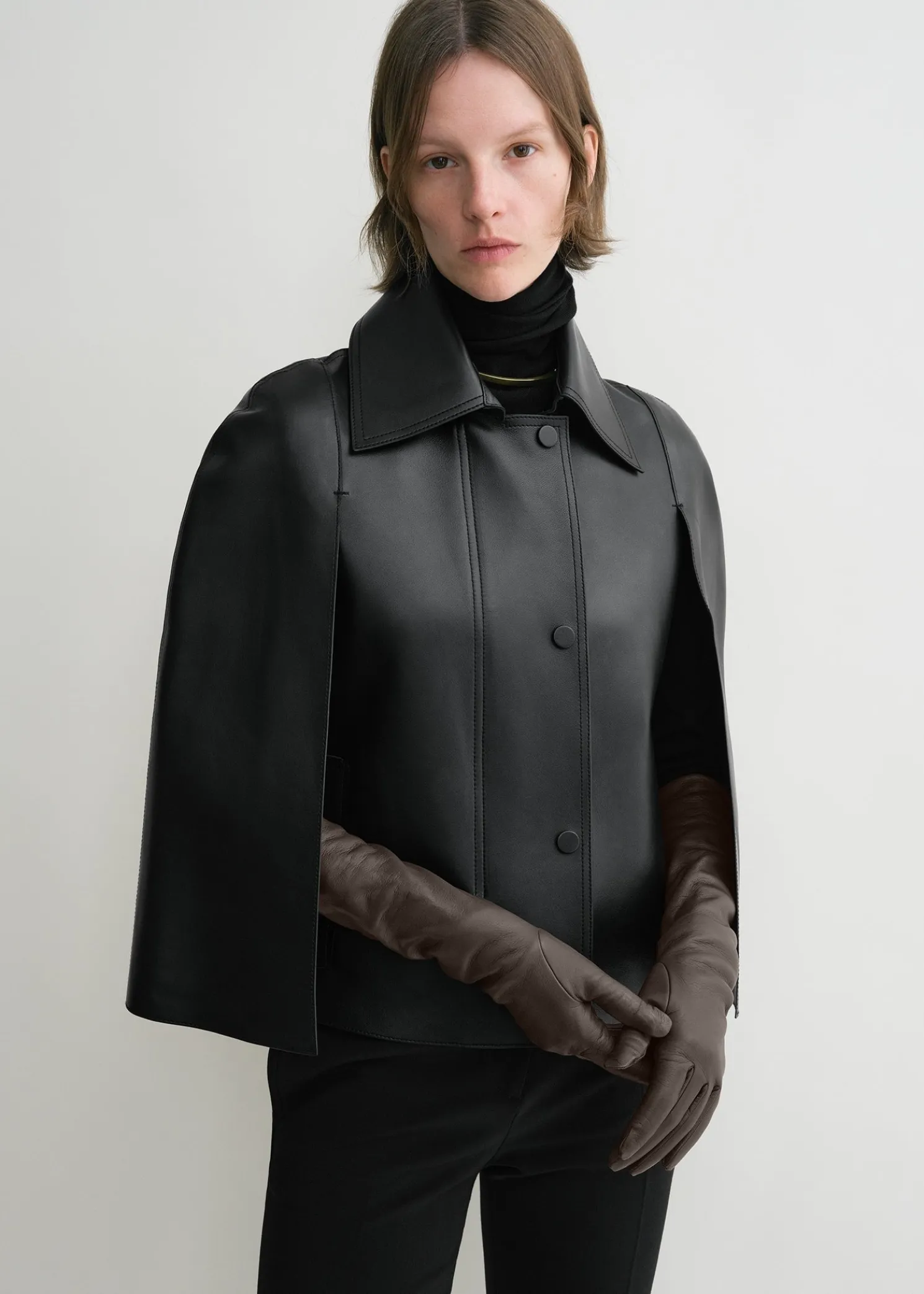 TOTEME gloves expertly crafted from butter-soft Nappa leather with a fine one-layer construction. They have an elongated silhouette discreetly stitched at the cuff with a refined letter T and are lined with knitted wool and cashmere fibers. Wear them to elevate winter looks. n