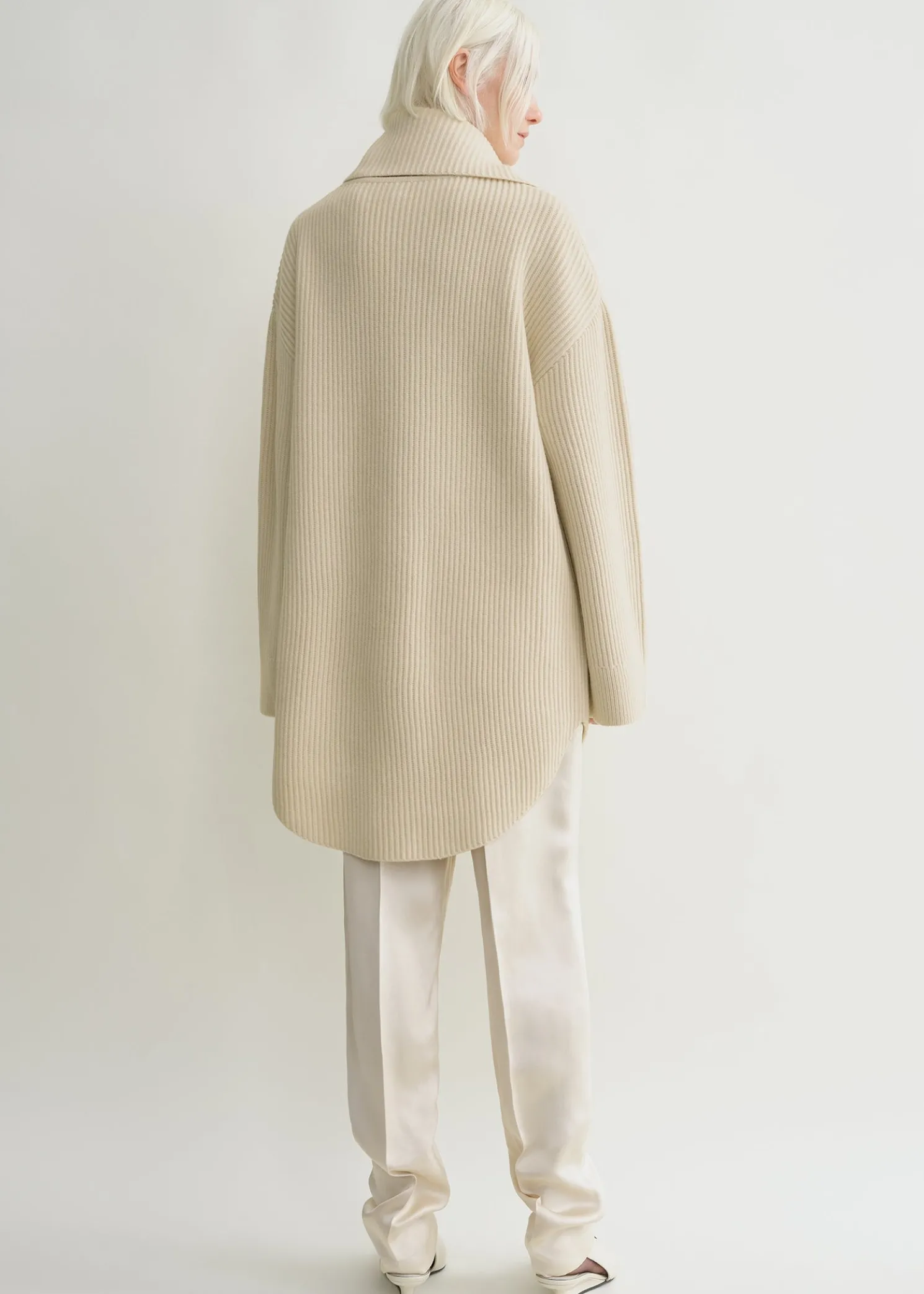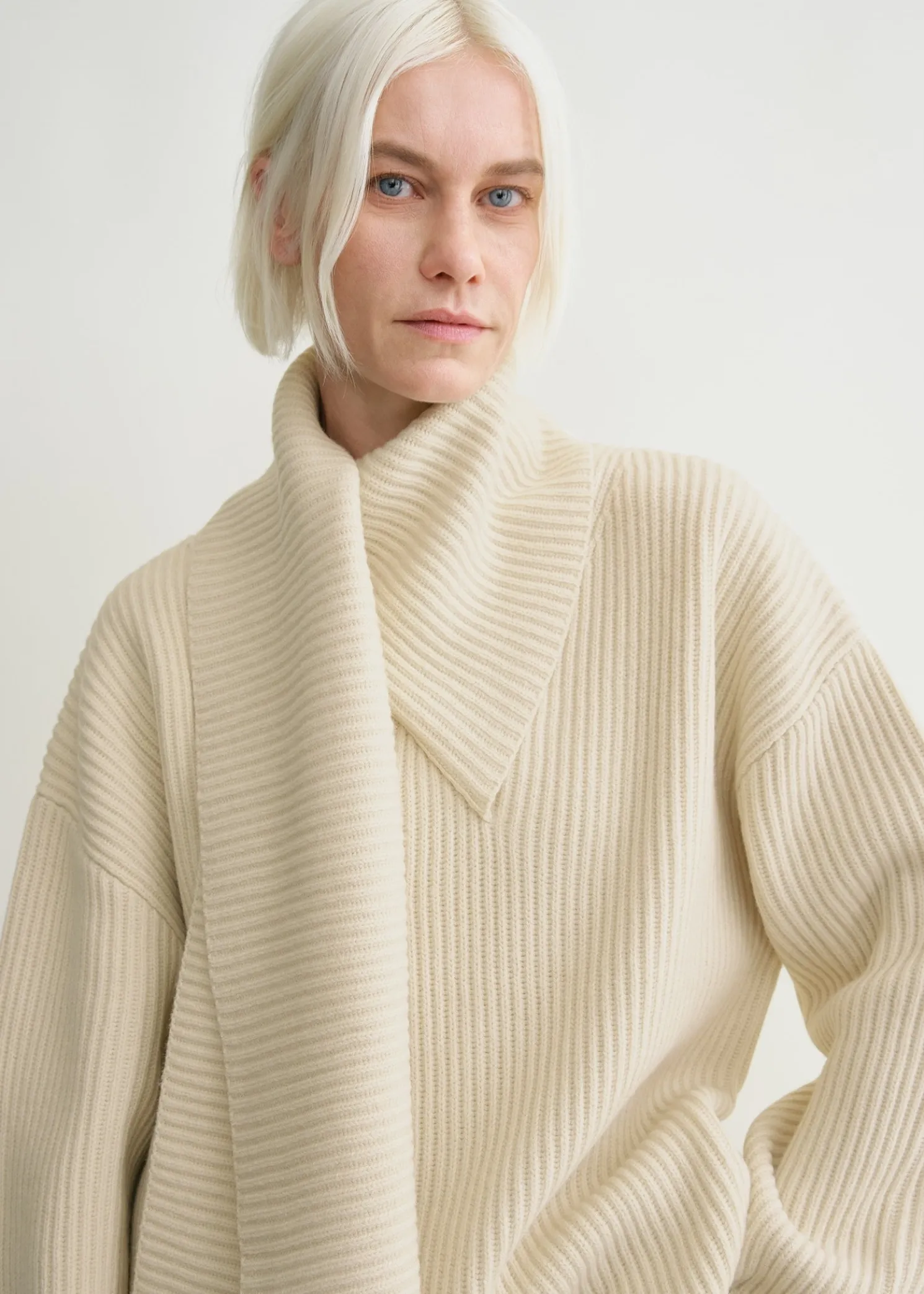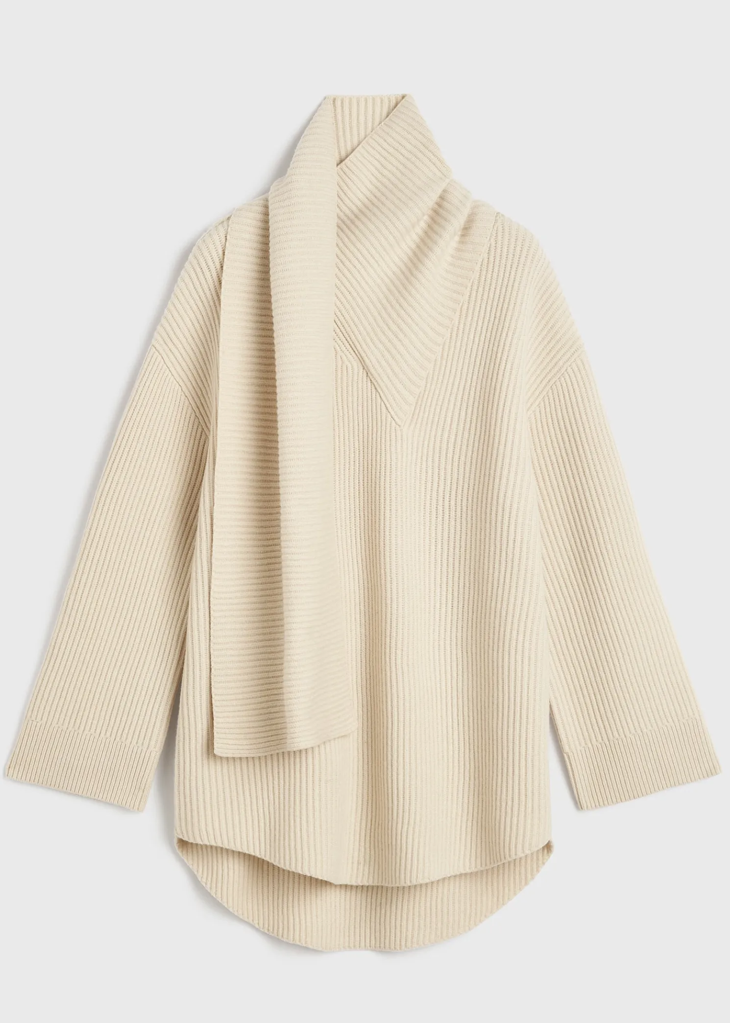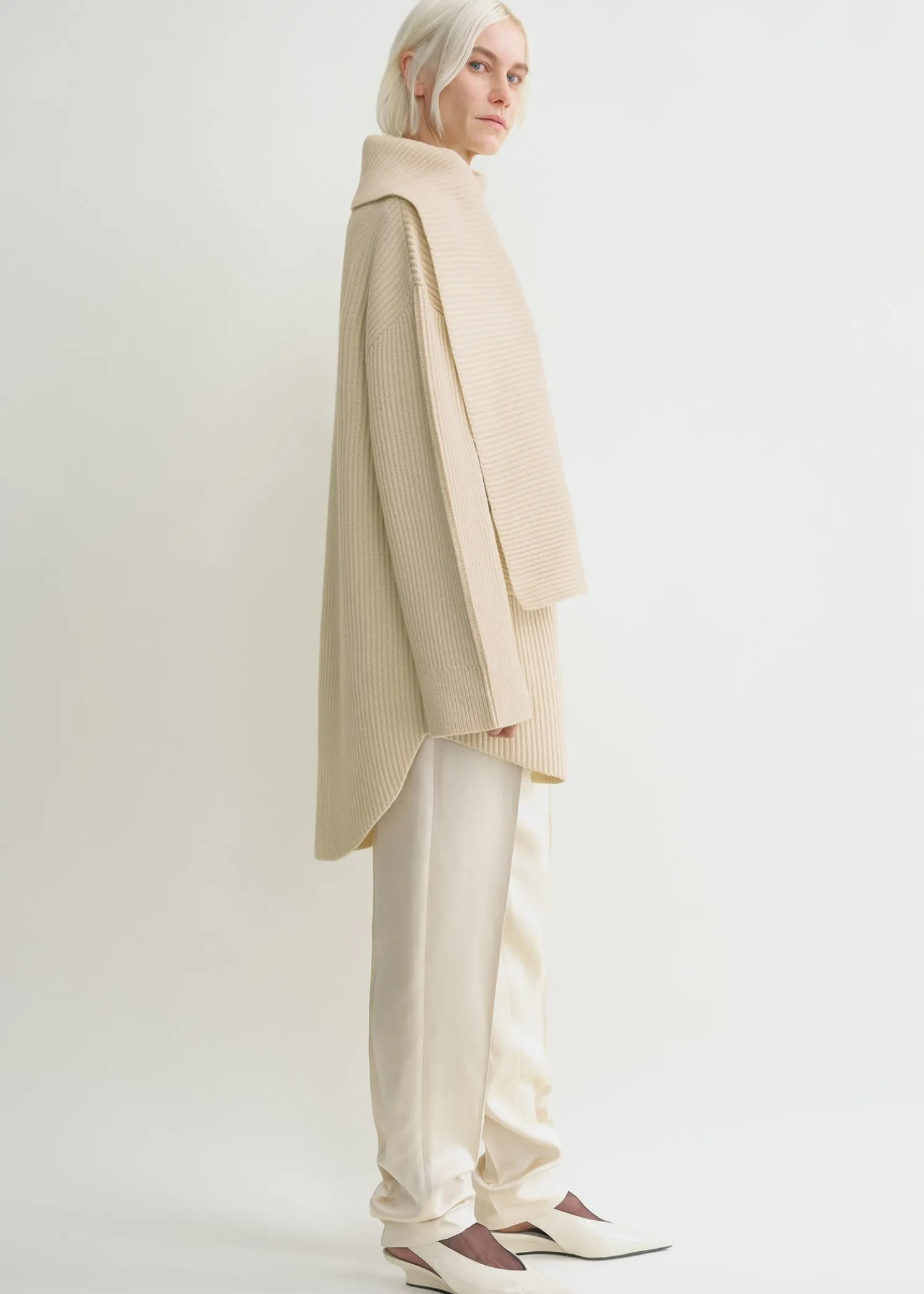 TOTEME sweater knitted from heavy and spongy wool with chunky ribbing. It has an oversized, longline silhouette with a curved hem that is fitted with a scarf at the neck for volume. Style it with tonal separates.