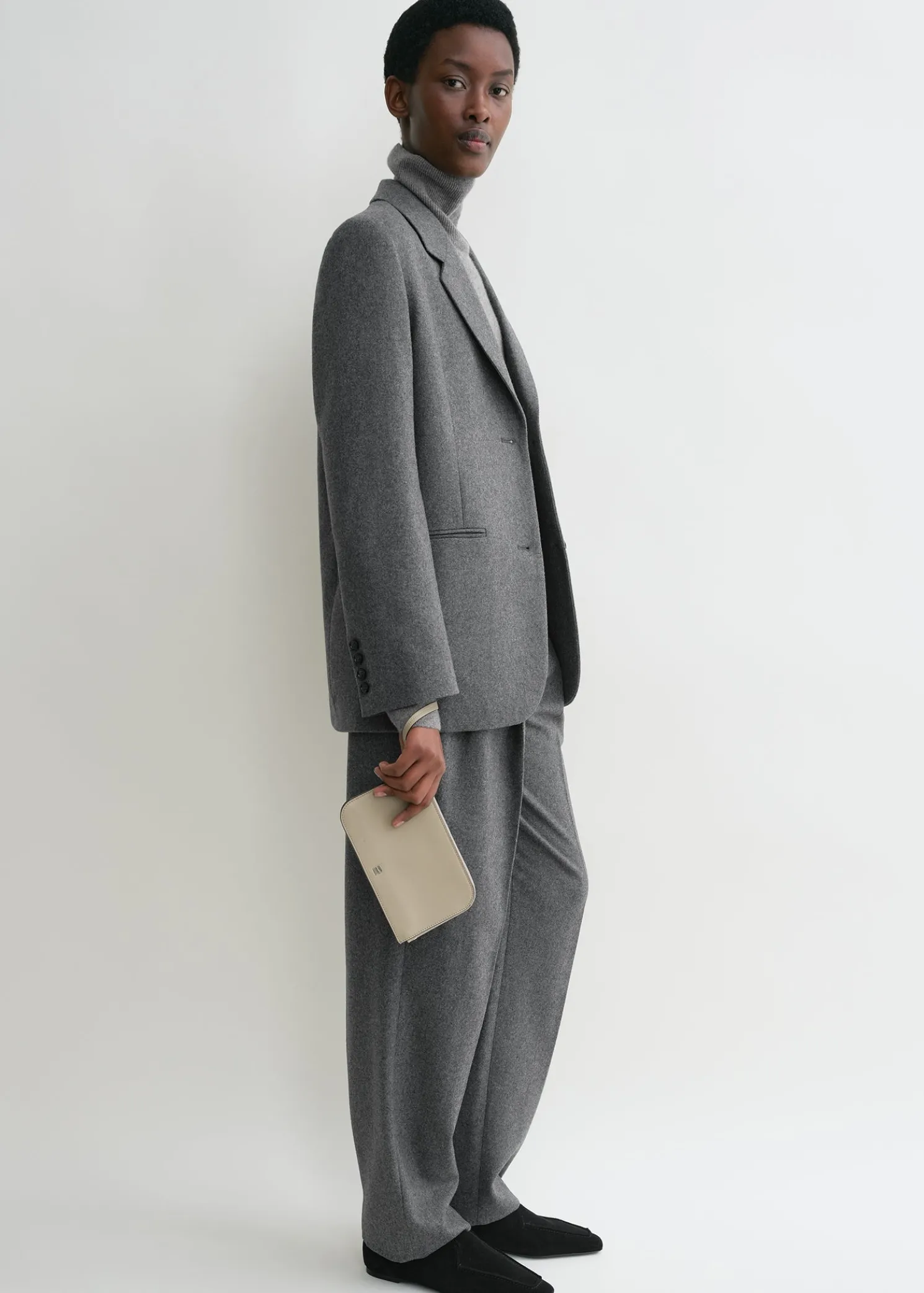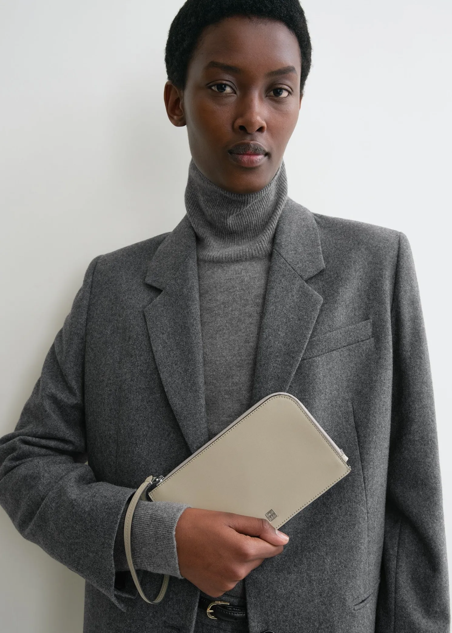 TOTEME pouch that doubles as an everyday purse and evening bag. It’s crafted in Spain from smooth leather and opens with an elegant silver-tone zipper that matches the small monogram plaque. Let it dangle playfully from the wristlet strap.
