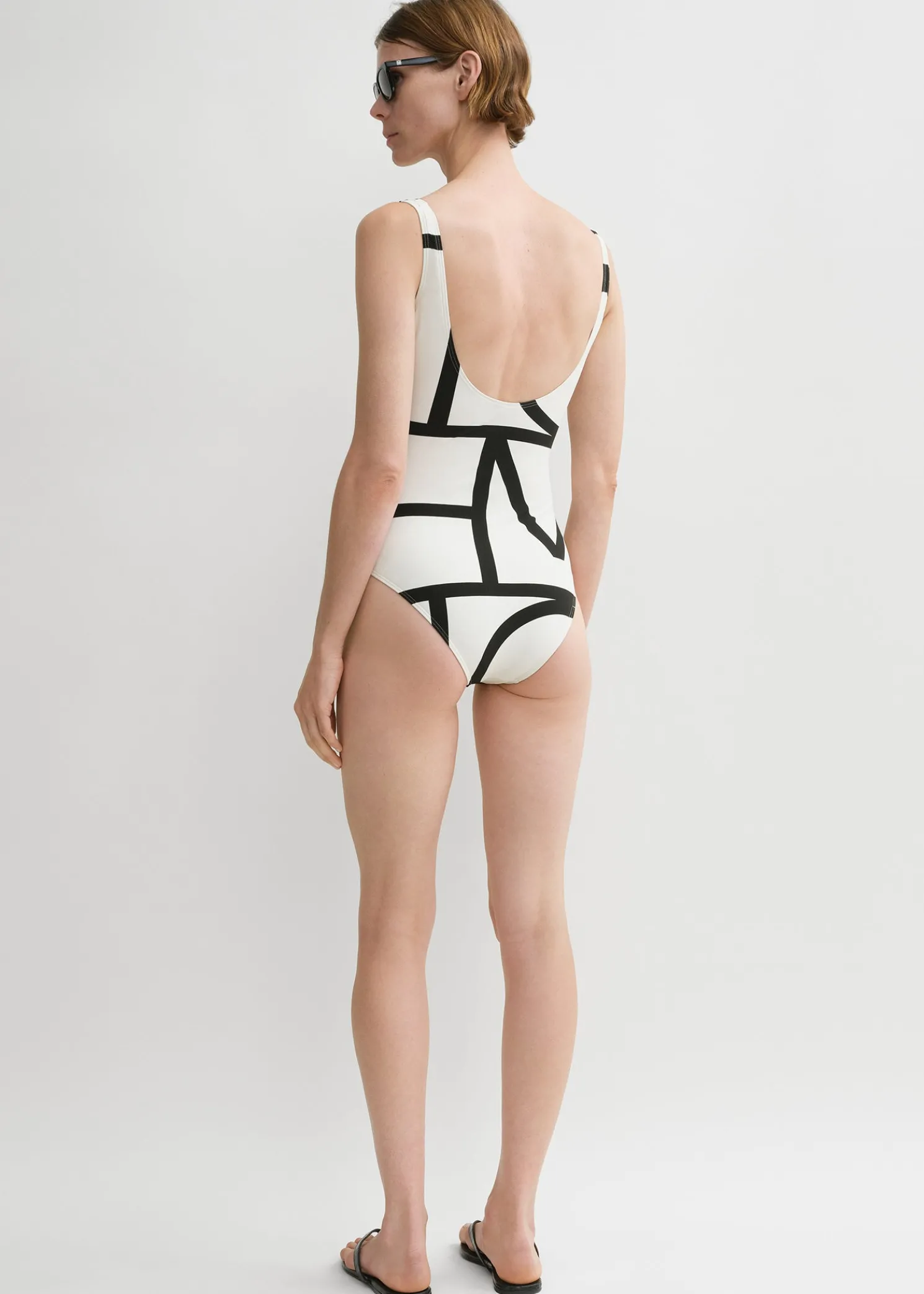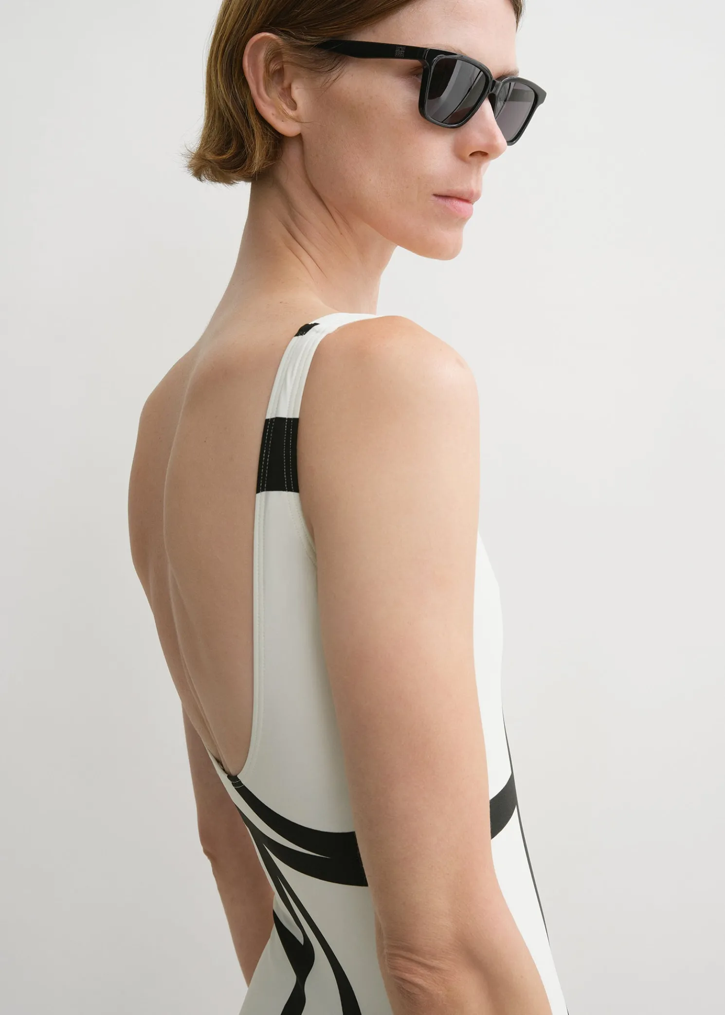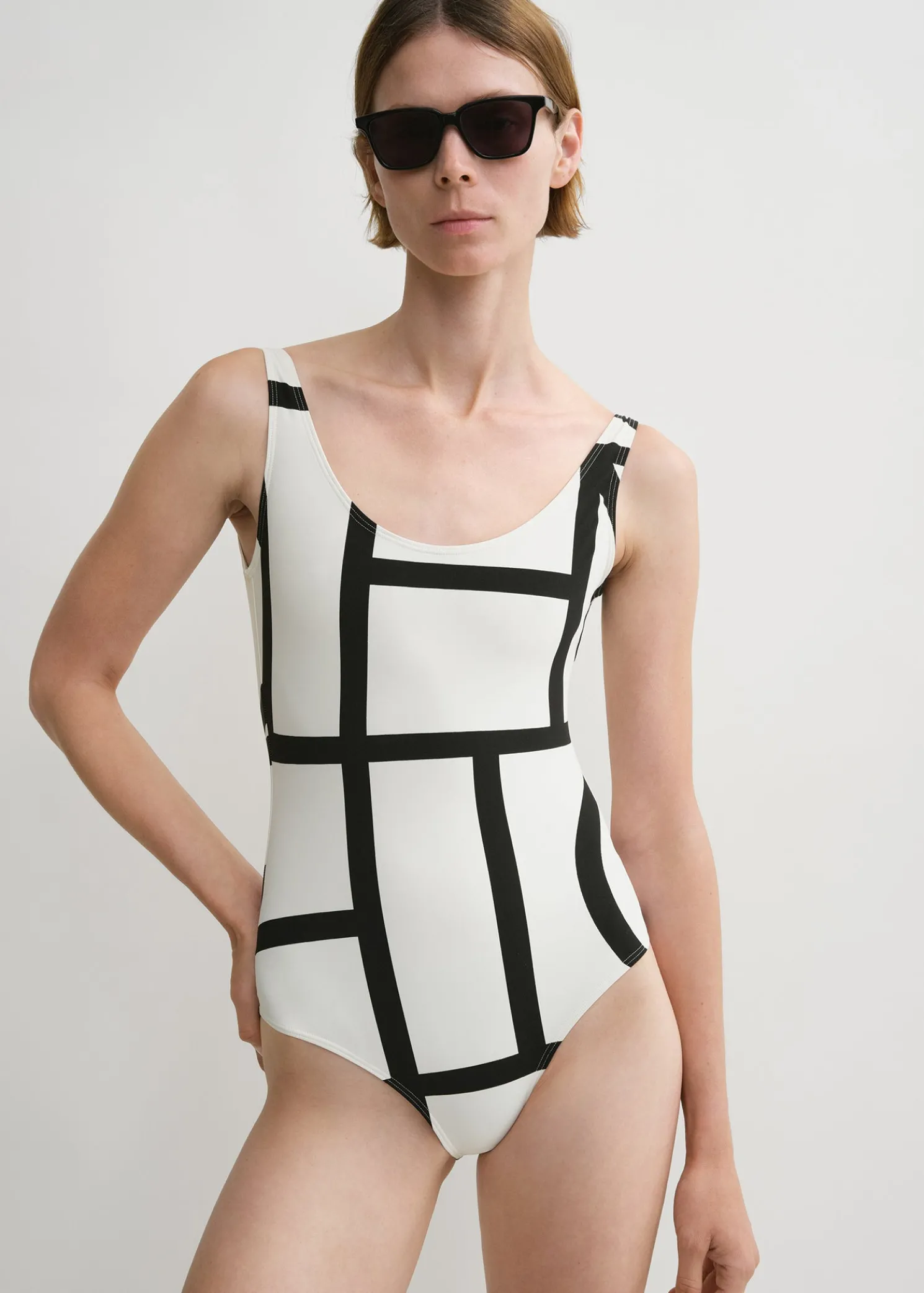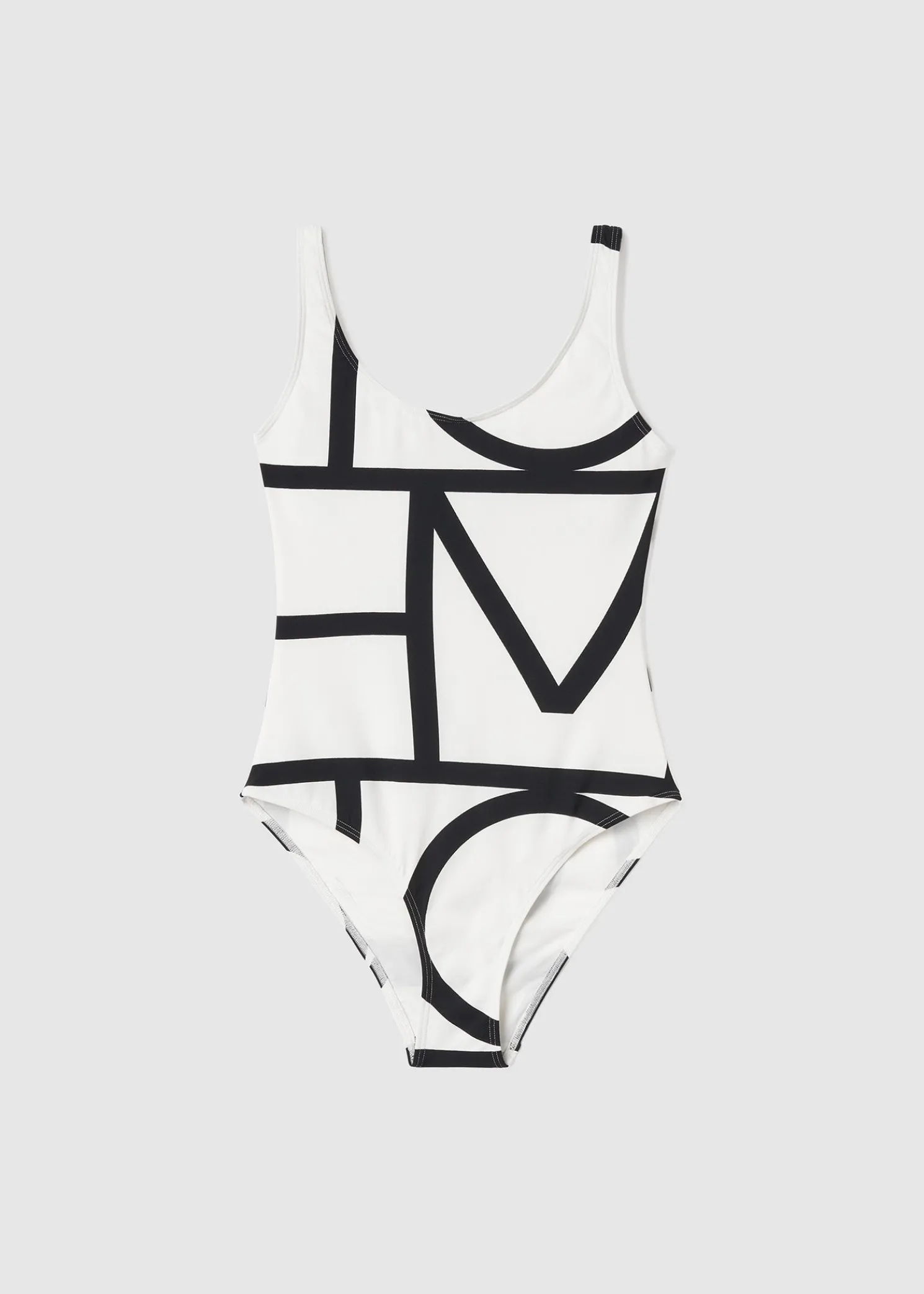 nnThis swimsuit is printed with TOTEME’s signature monogram pattern in tofu and black. It’s made in Portugal from four way-stretch, recycled-polyamide jersey which protects against sun rays, and is shaped to a classic silhouette with a deep U-back. Pack it with the Monogram jacquard beach towel for your next vacation.