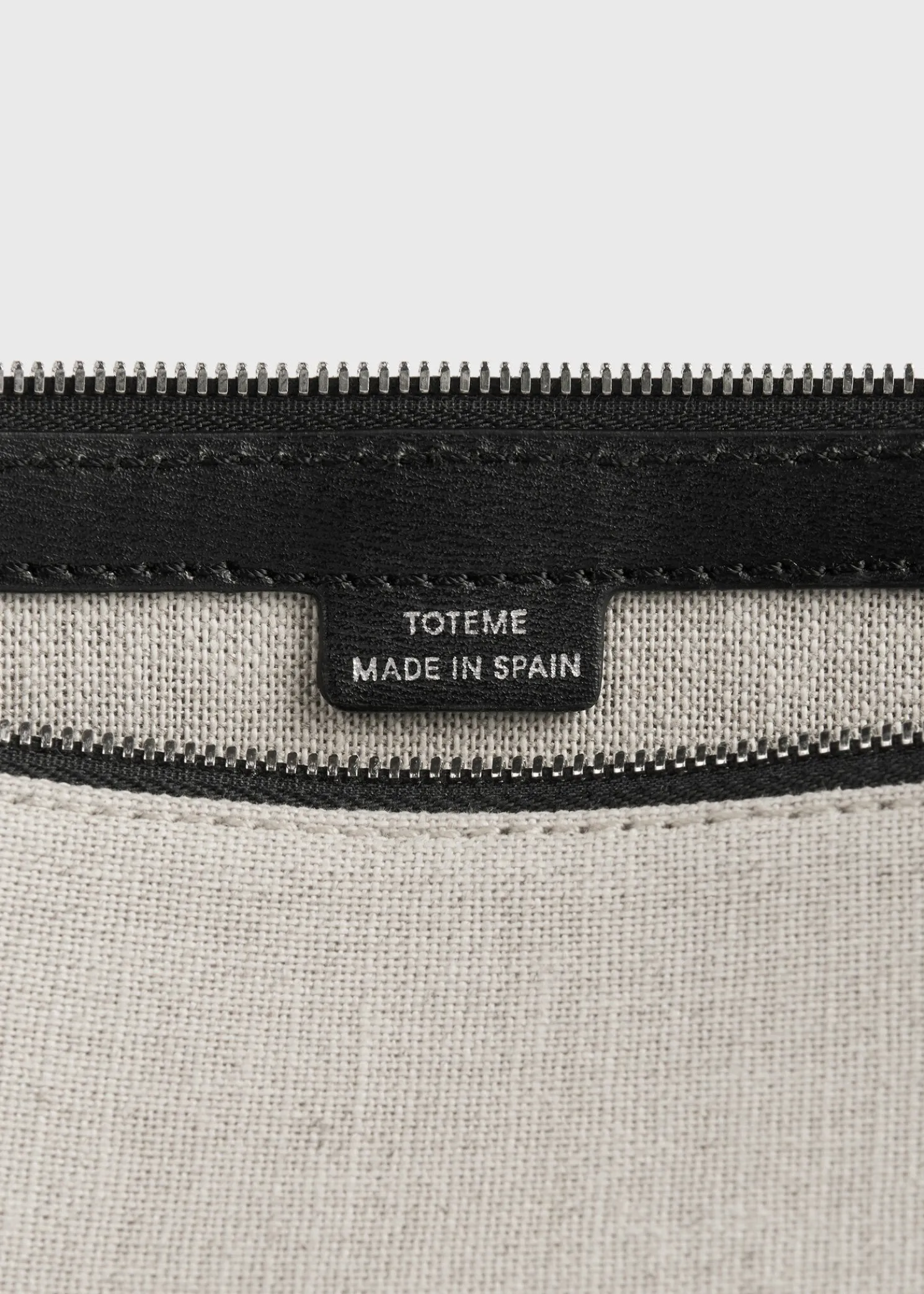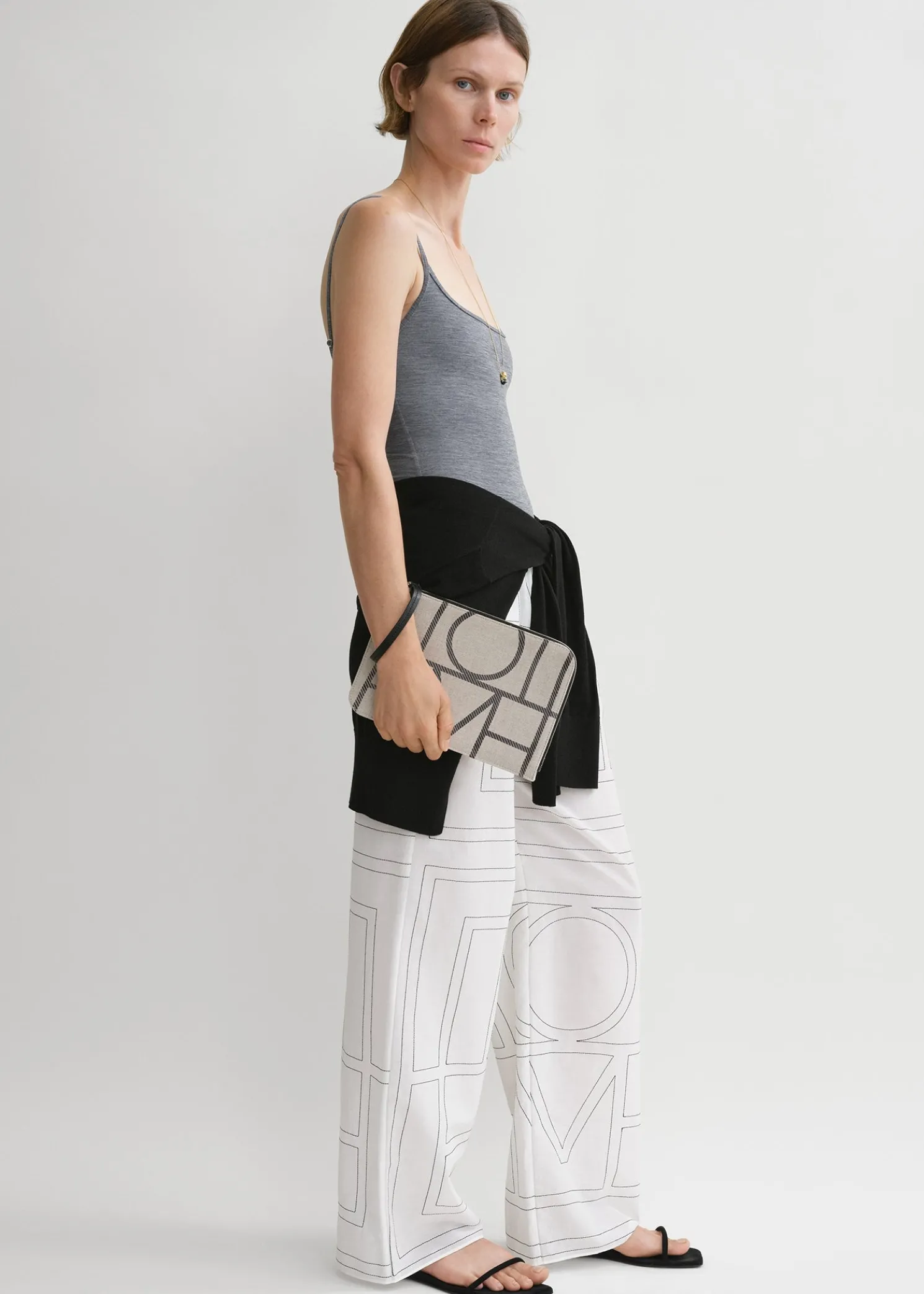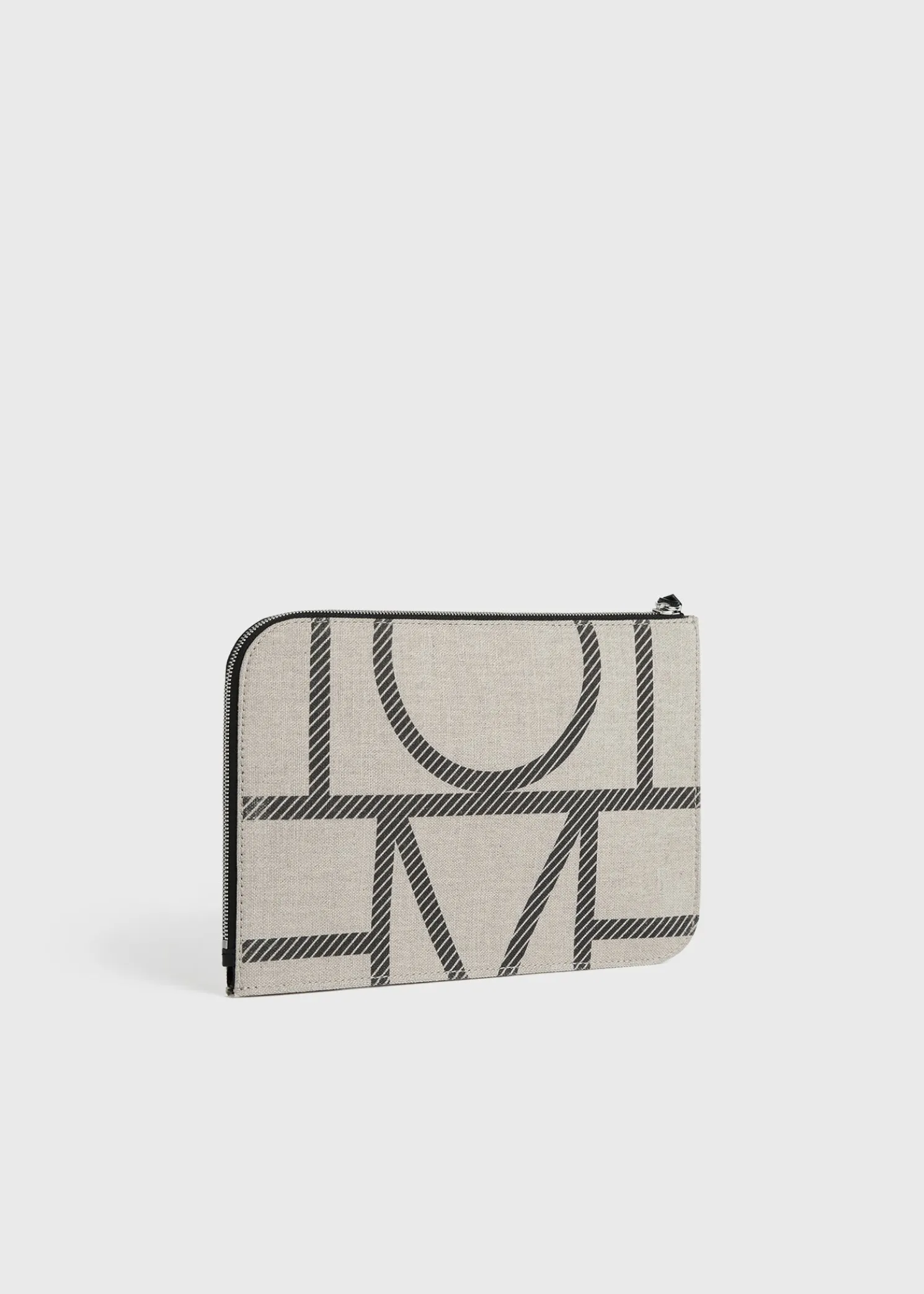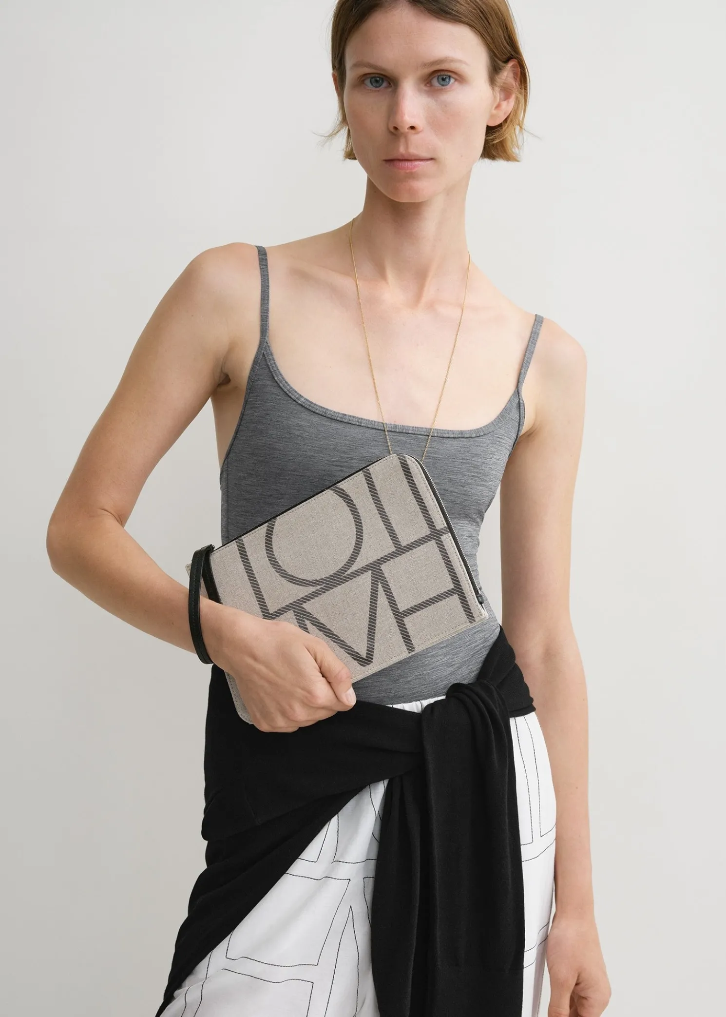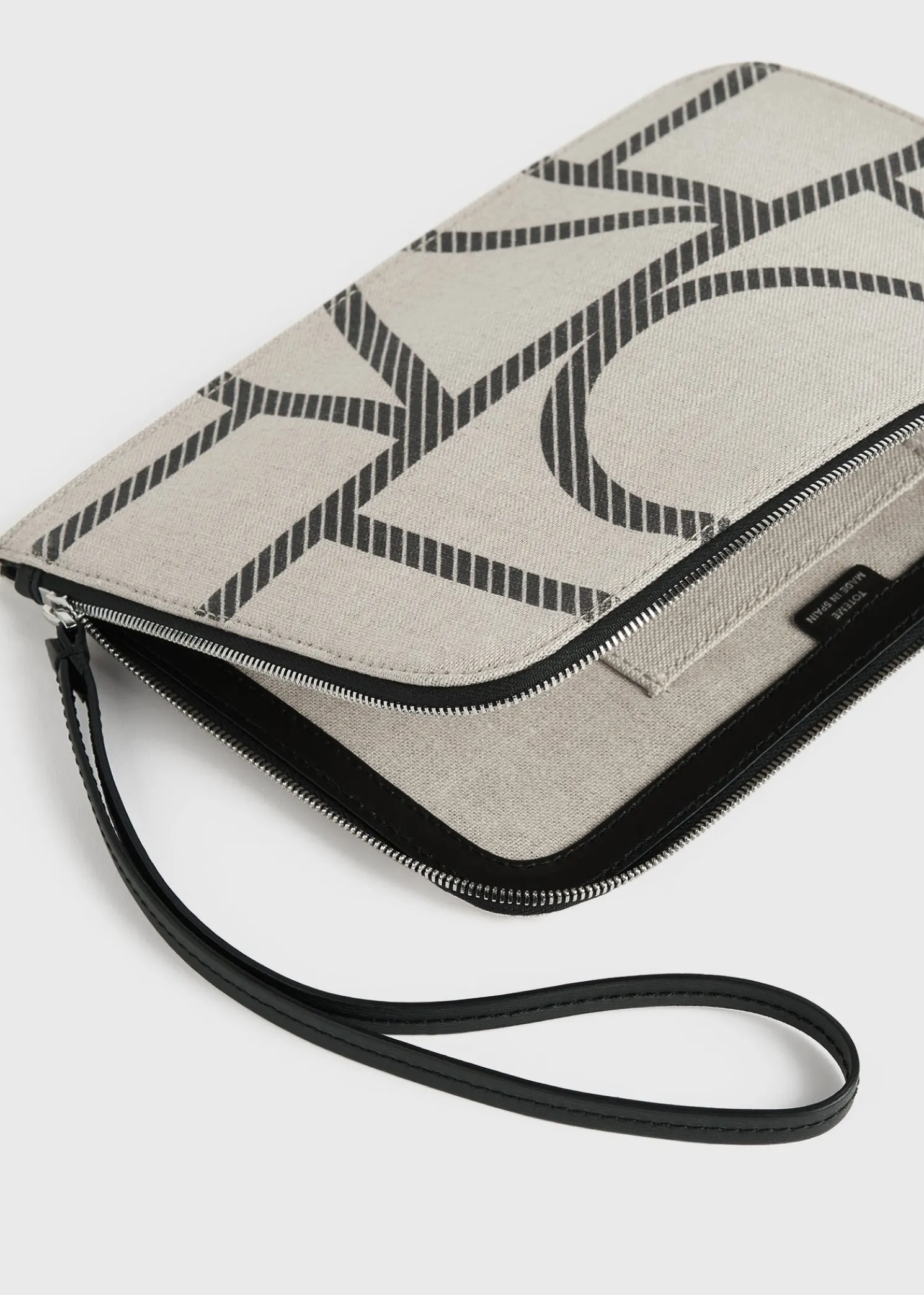 TOTEME pouch printed with a scaled-up iteration of our distinctive monogram. It is made from durable canvas with a black leather wristlet strap and zipper and an internal card slot. Use it to accessorize summer looks.