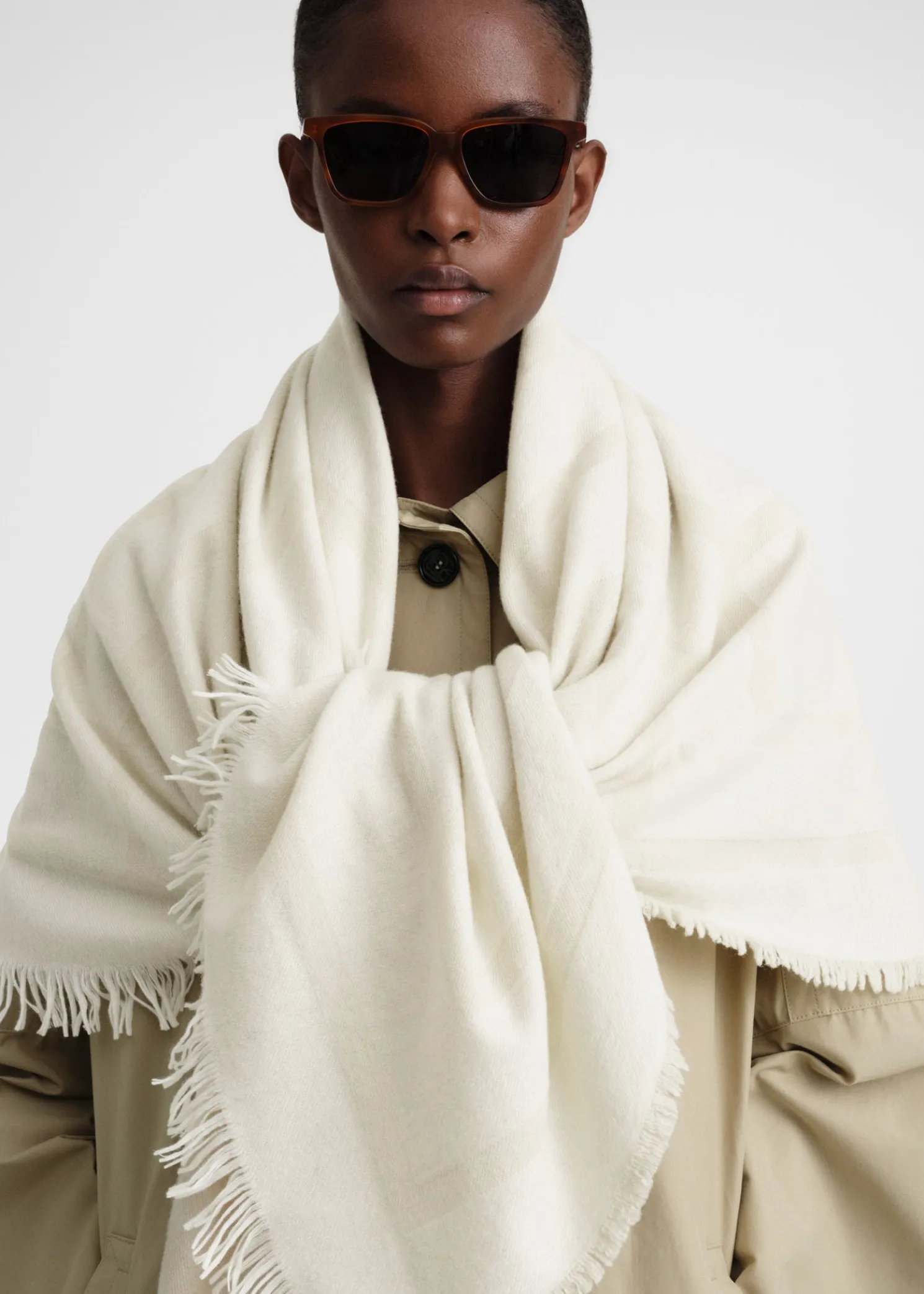nnTOTEME blanket scarf woven in Italy from soft wool and cashmere yarns. It has a monogram jacquard, lightly frayed edges, and measures 140x140cm. Wrap it around your coat, wear it over your shoulders, or take it on your next weekend getaway.
