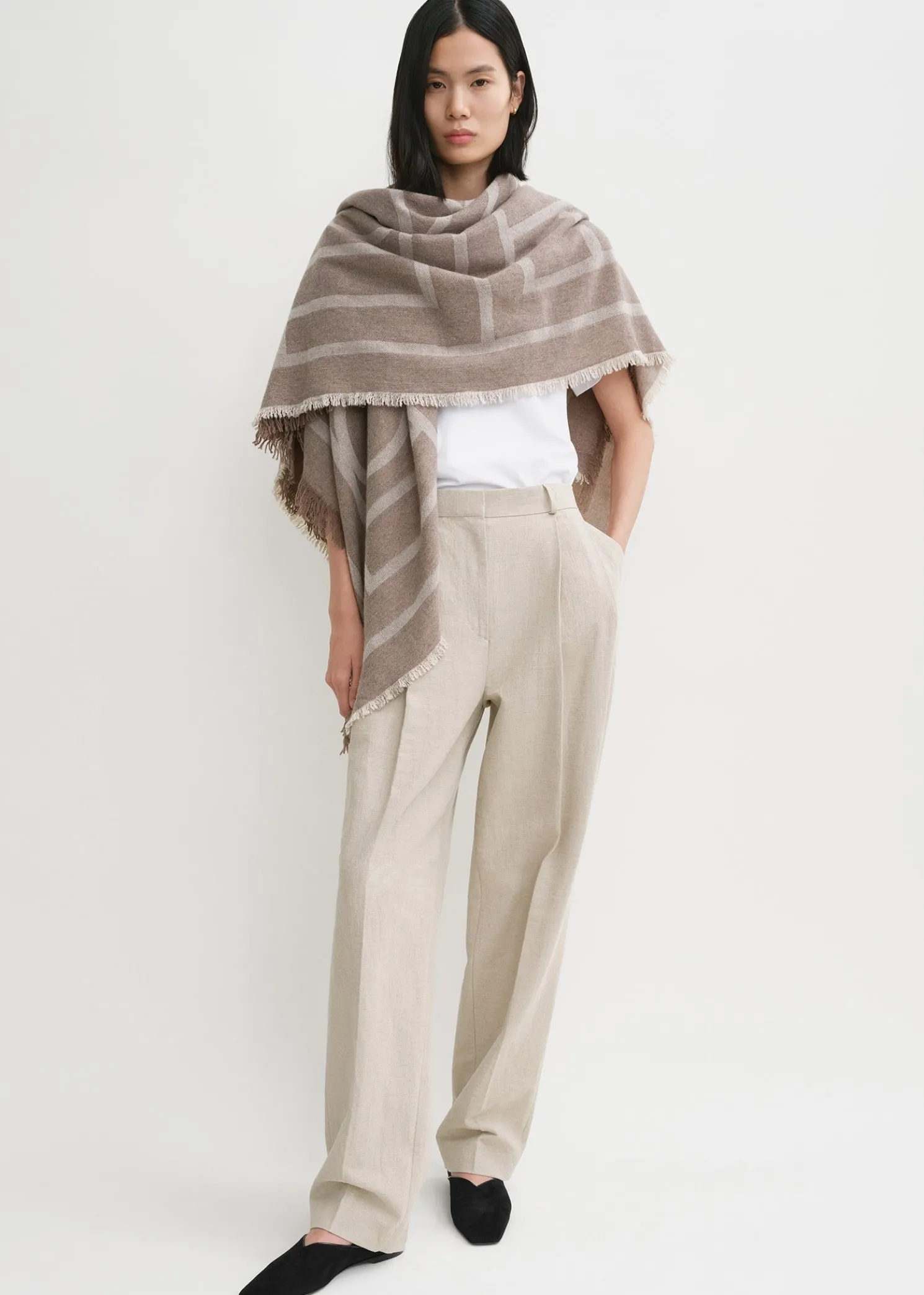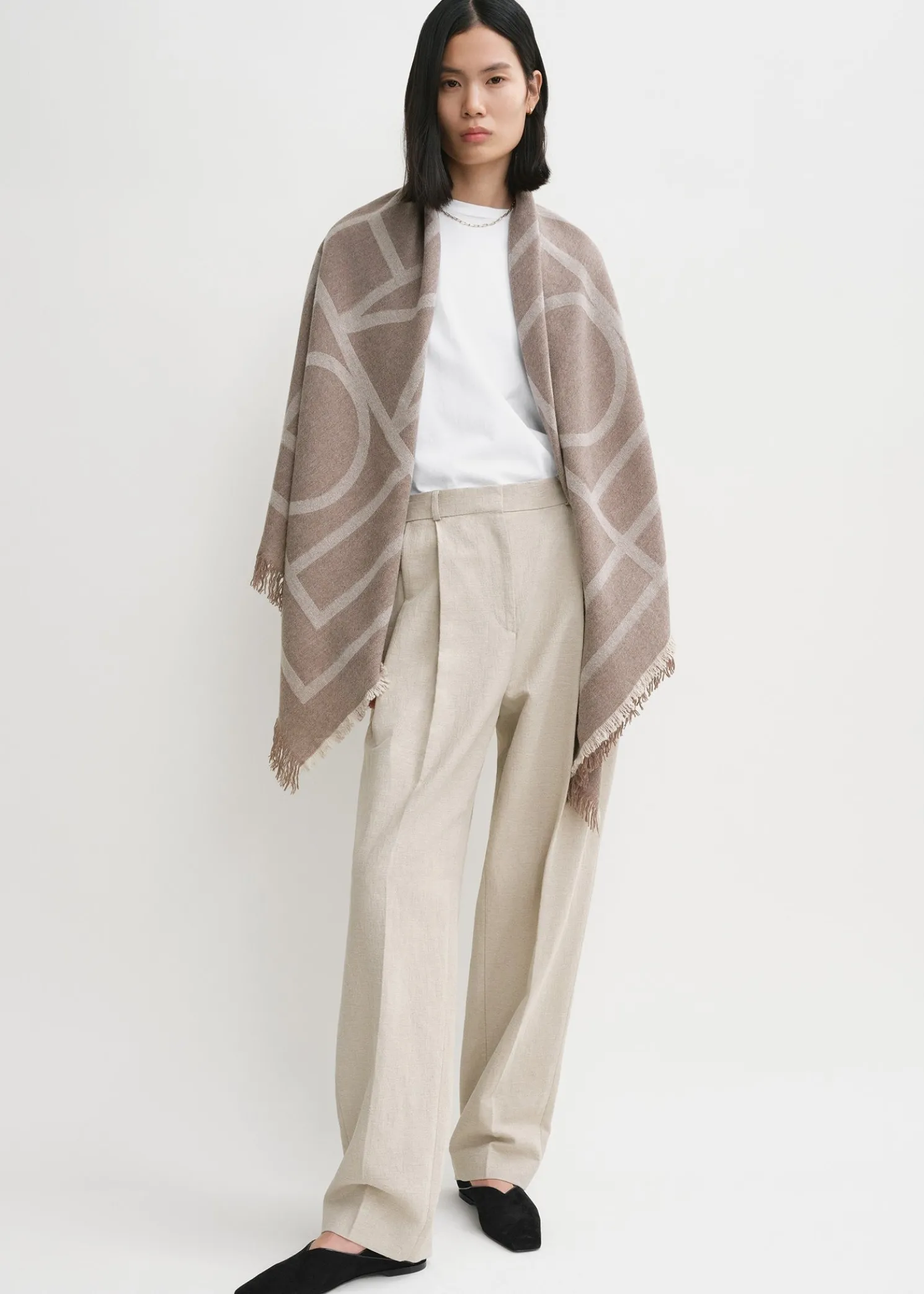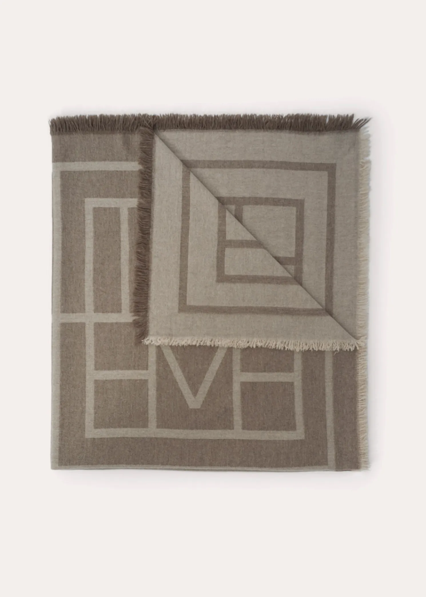nnTOTEME blanket scarf woven in Italy from soft wool and cashmere yarns. It has a monogram jacquard, lightly frayed edges, and measures 140x140cm. Wrap it around your neck or rest it over your shoulders.