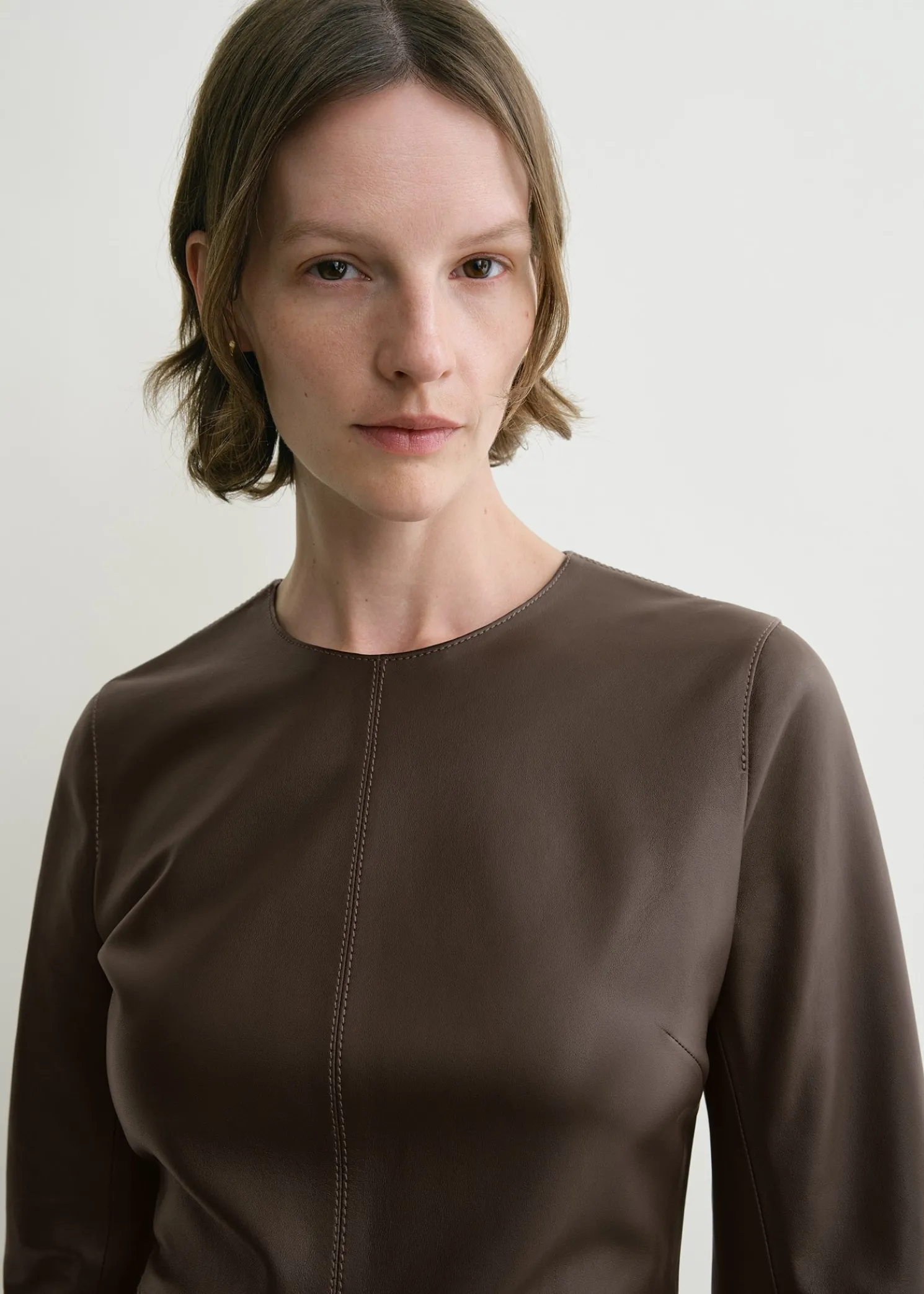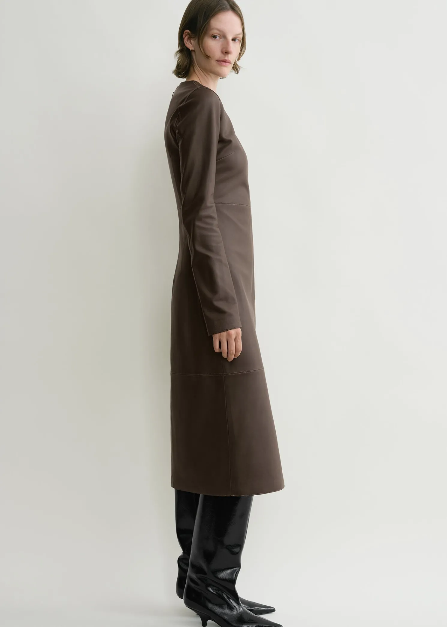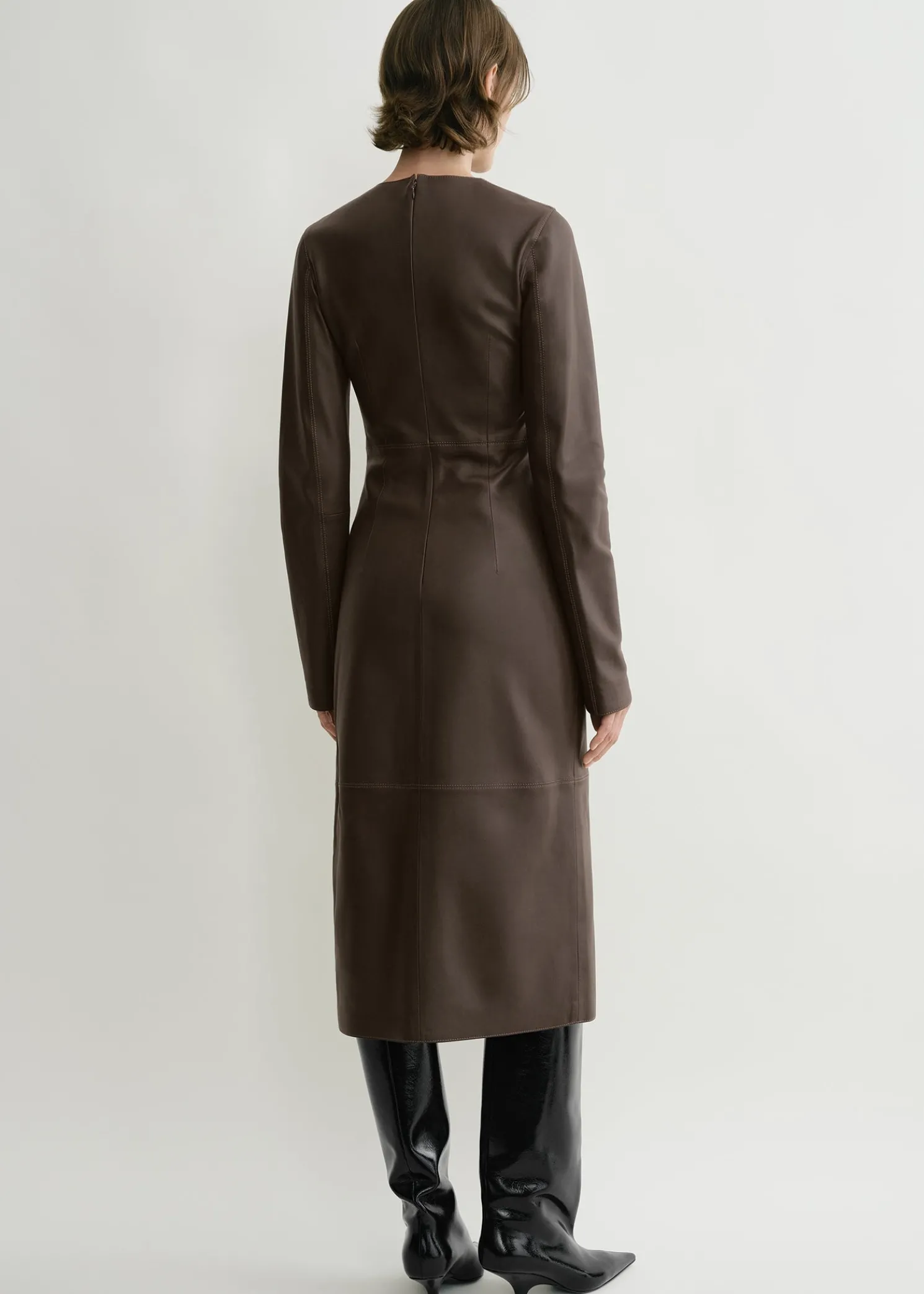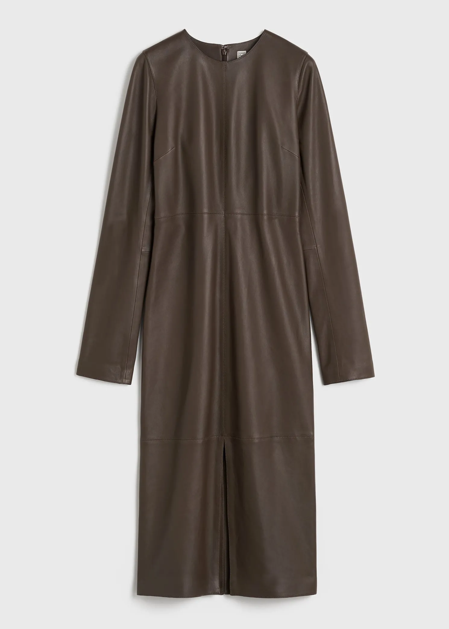 TOTEME dress with a minimalist paneled midi construction that hugs the body into a slim silhouette. It is made from supple leather with a front slit and fastens with a concealed back zipper. Simply add boots for after-work drinks.