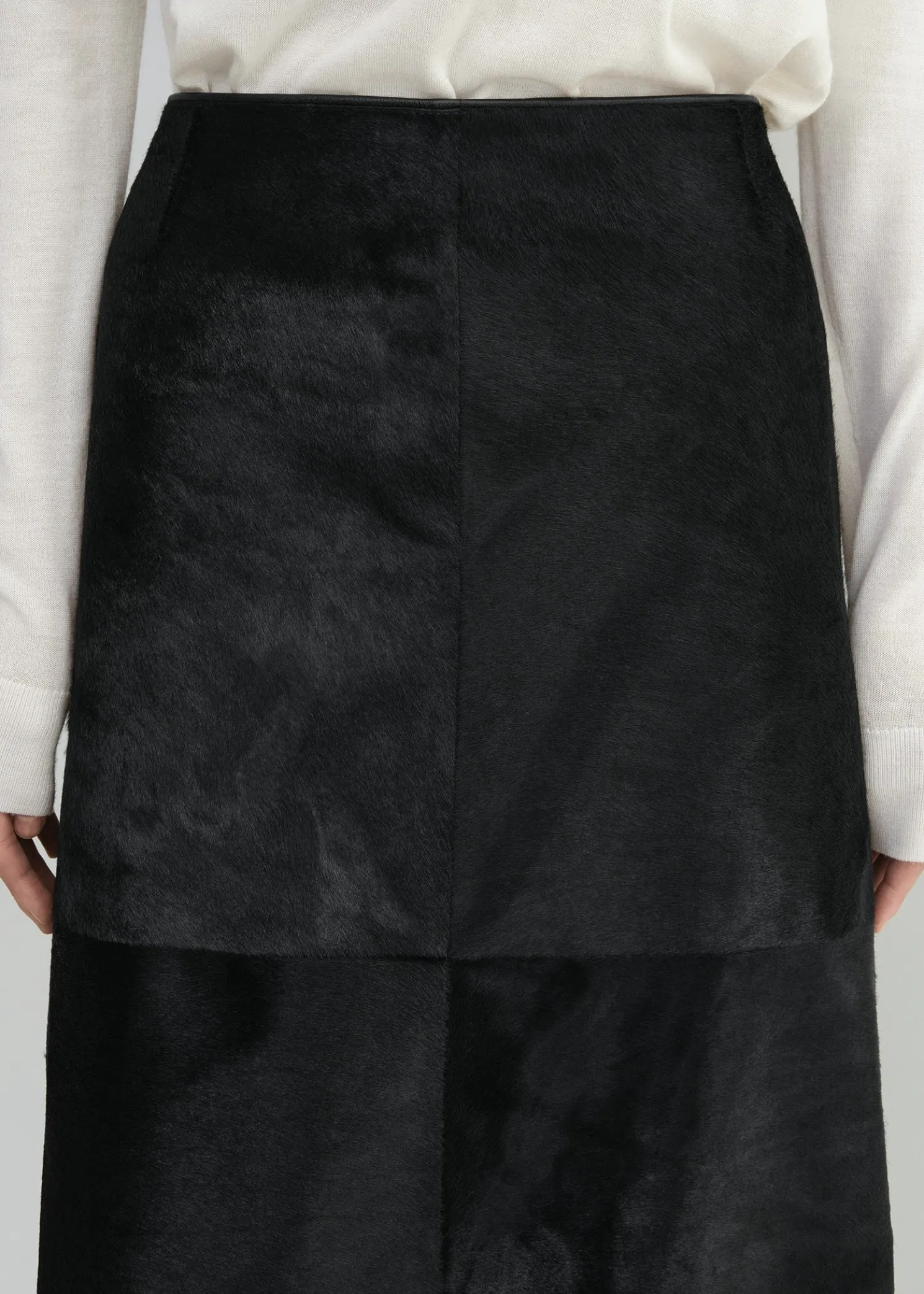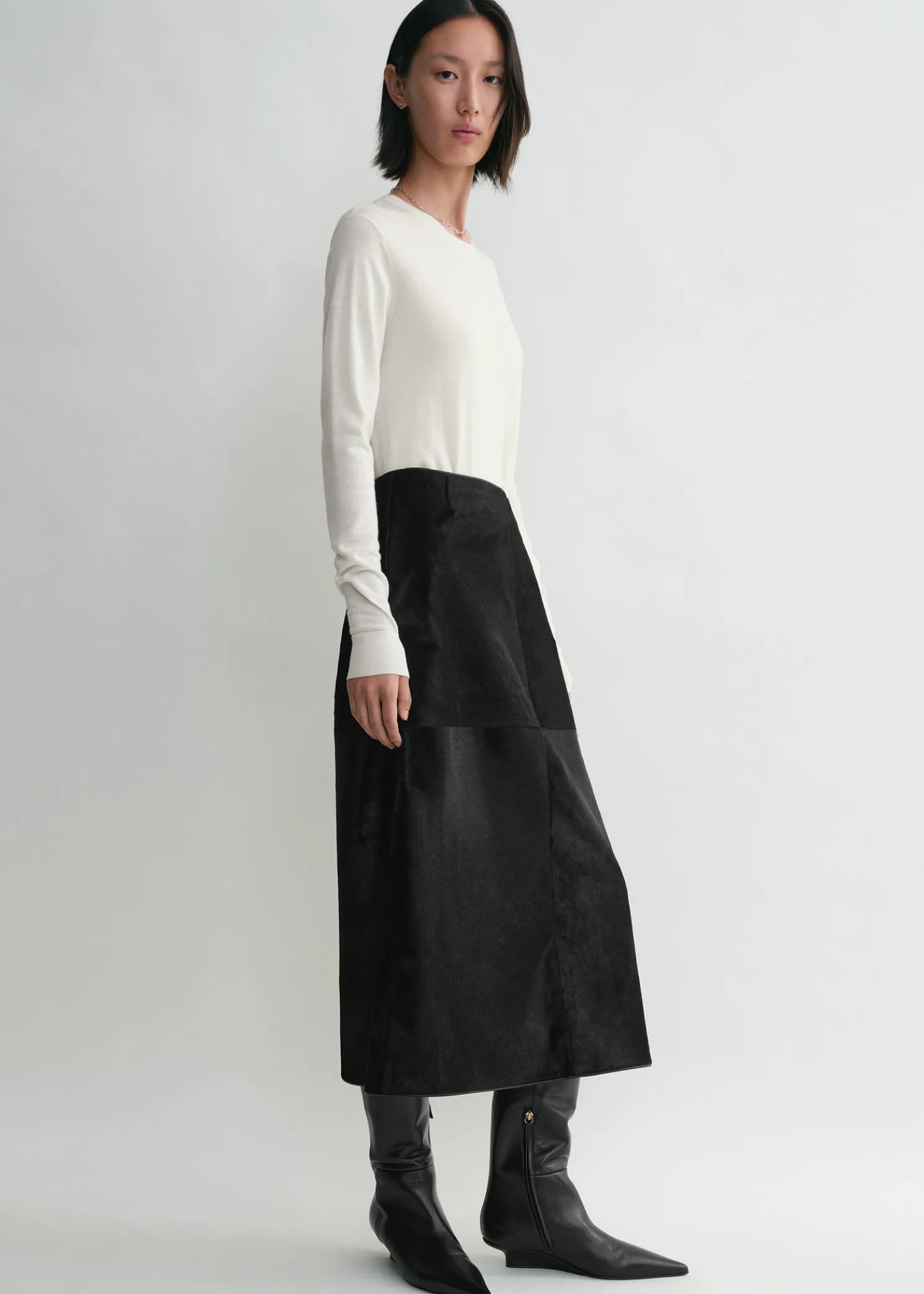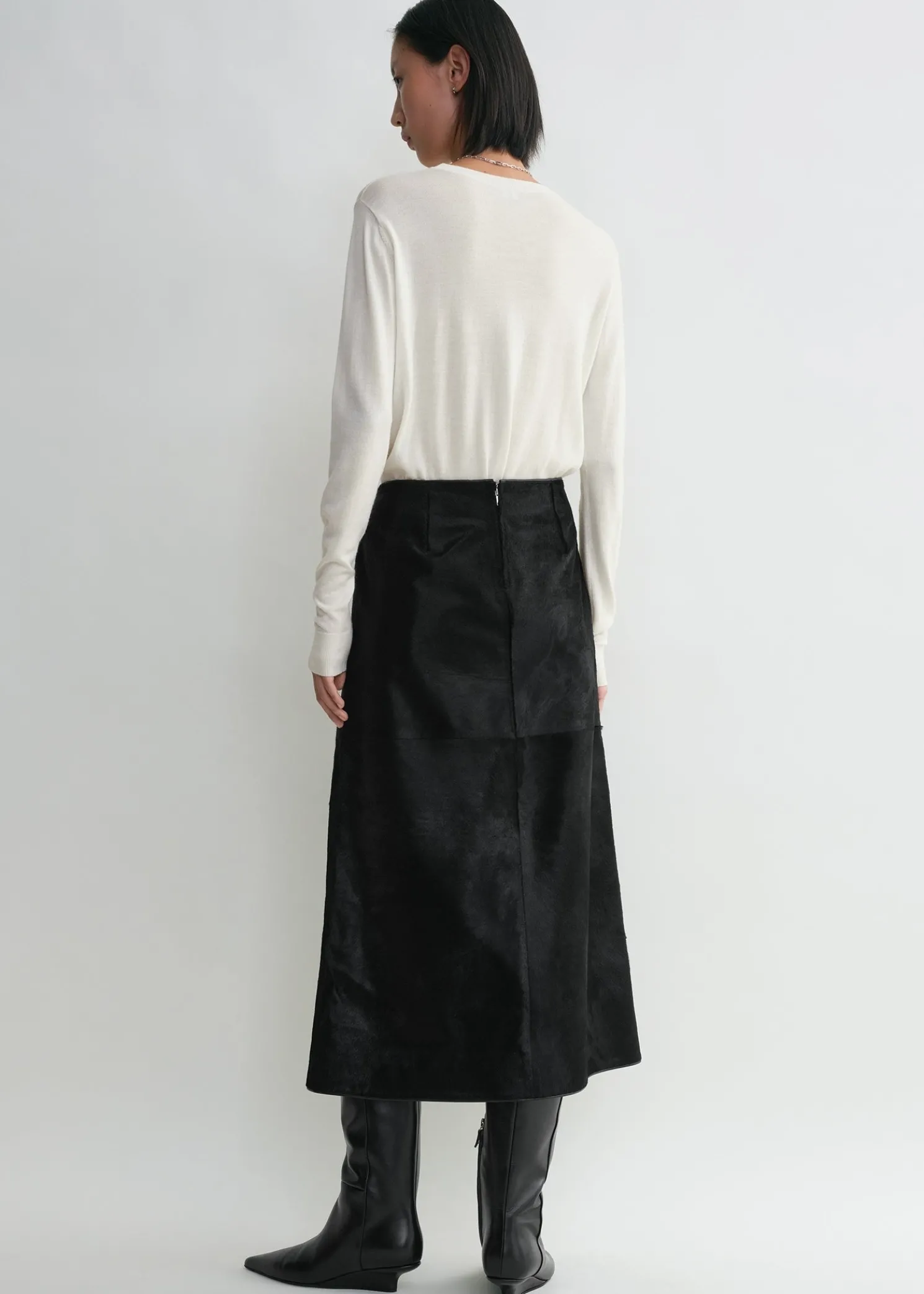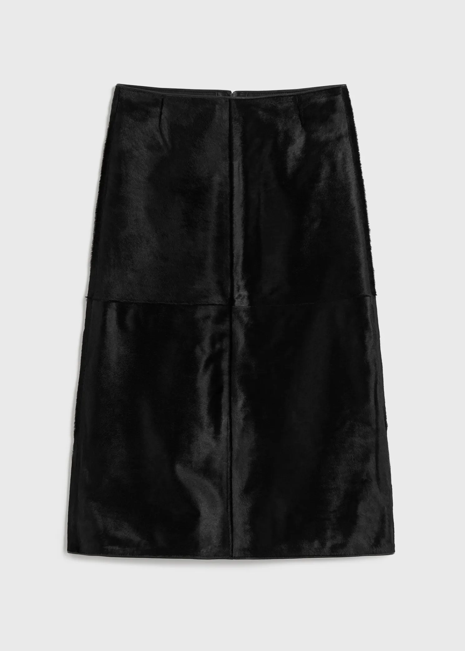 TOTEME midi skirt made from pony hair-effect calf leather for an eclectic take on texture. It is outlined with a subtle A-line silhouette and fastens with a concealed back zipper. Wear it with a top and boots to a dinner date.