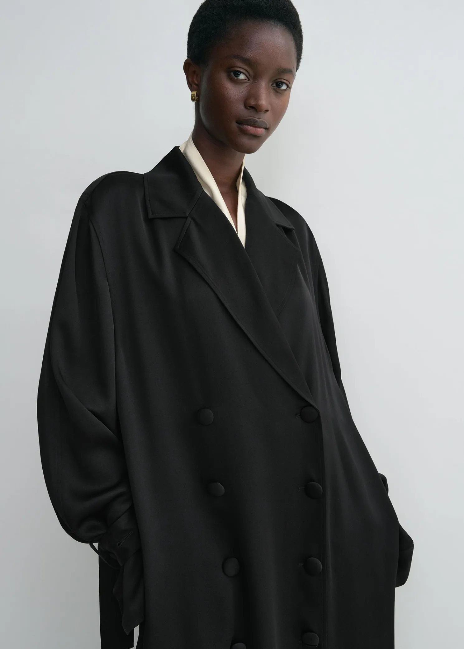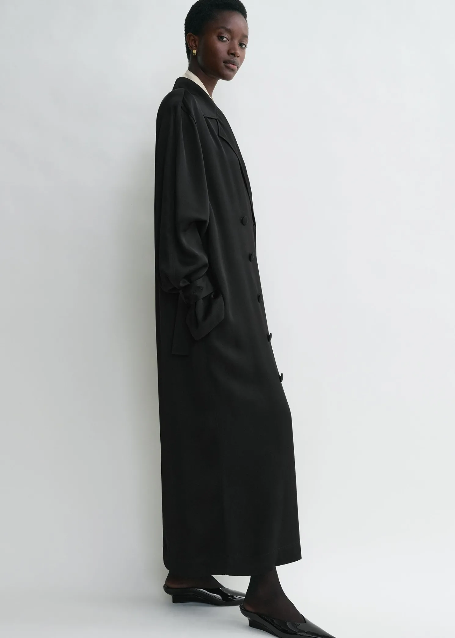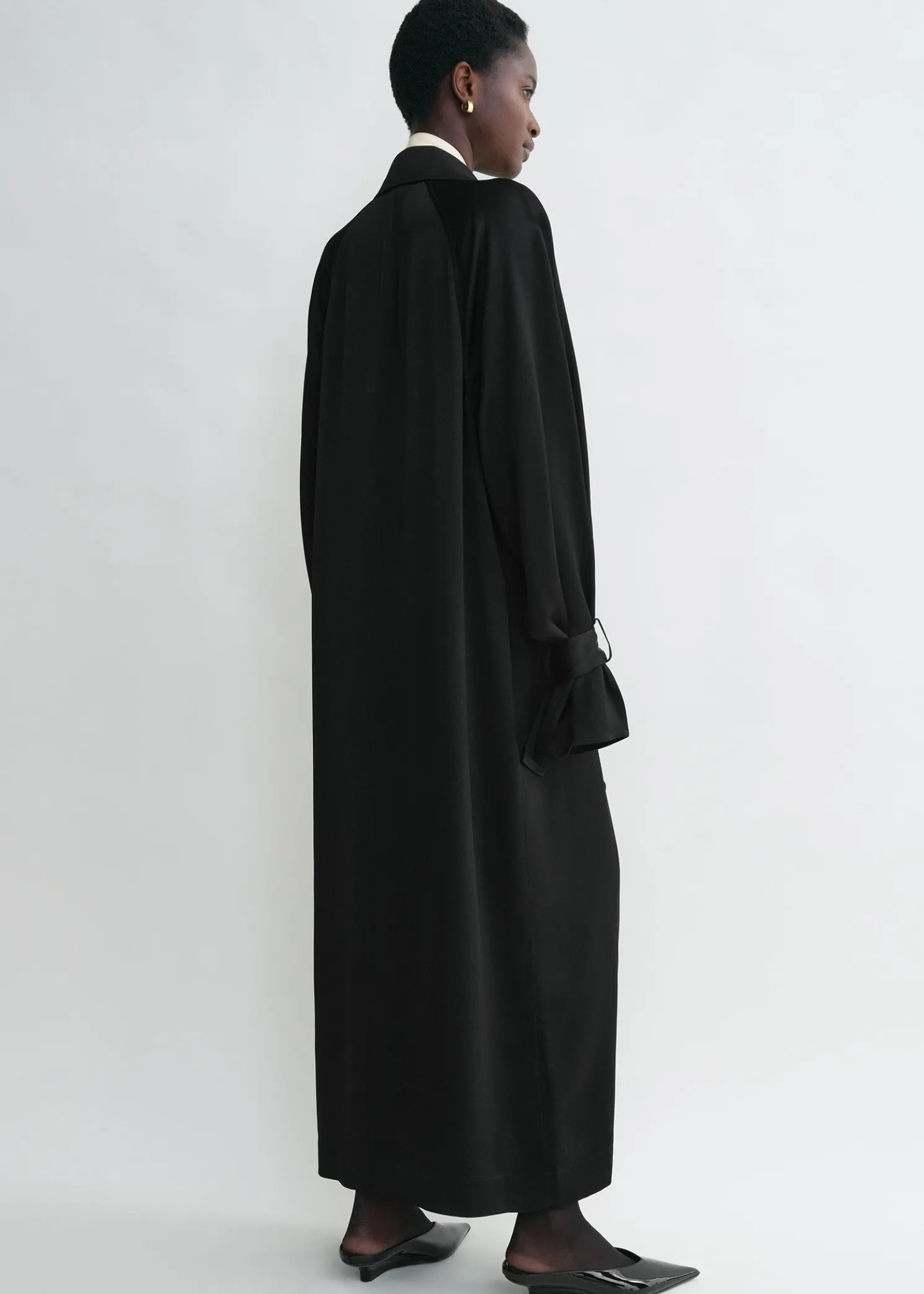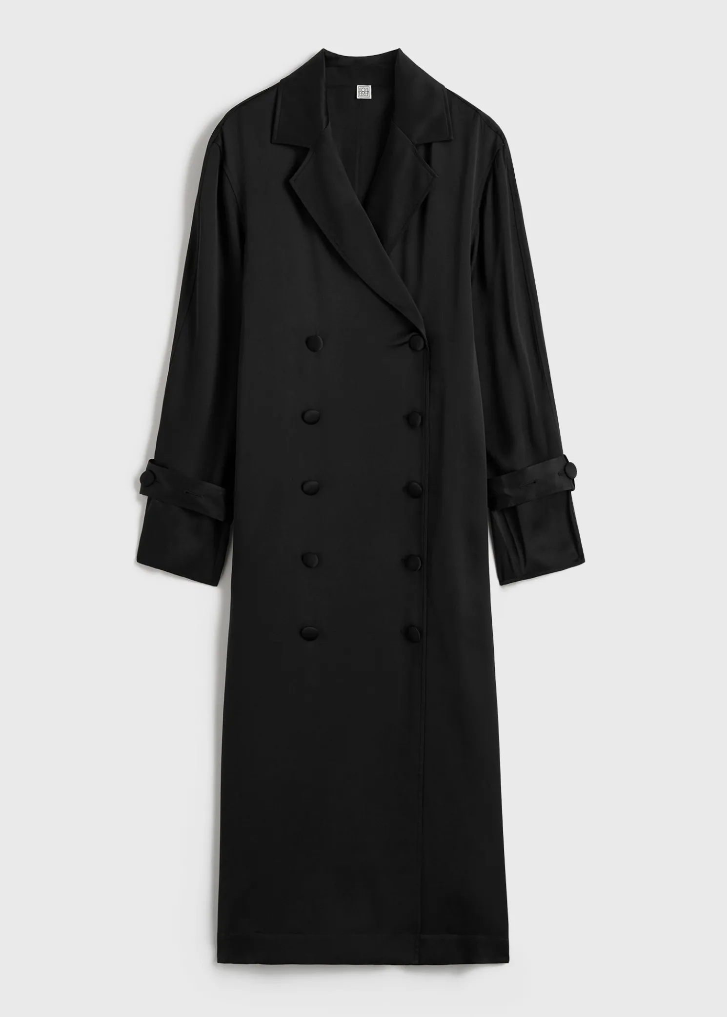 Our signature TOTEME trench coat is reimagined as a long satin dress for special occasions. It has a straight, double-breasted silhouette set with buttons, slip pockets and detachable belts dangling gracefully from the cuffs. Style it with mules as part of an elegant evening look.