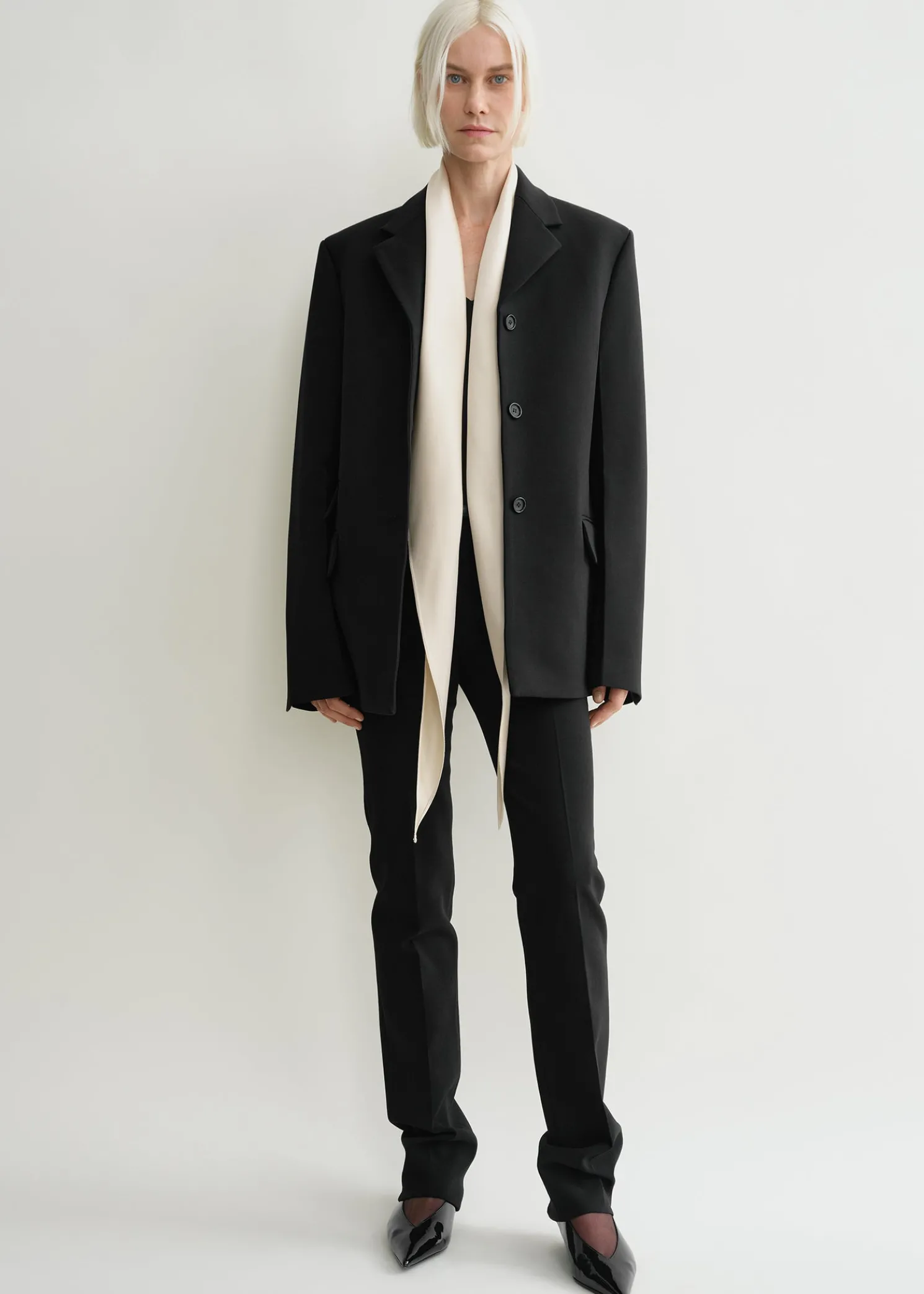 TOTEME scarf inspired by black tie dressing. Made from fluid viscose satin, it has an elongated triangular shape that can be styled draped over the shoulders or hanging from the neck.