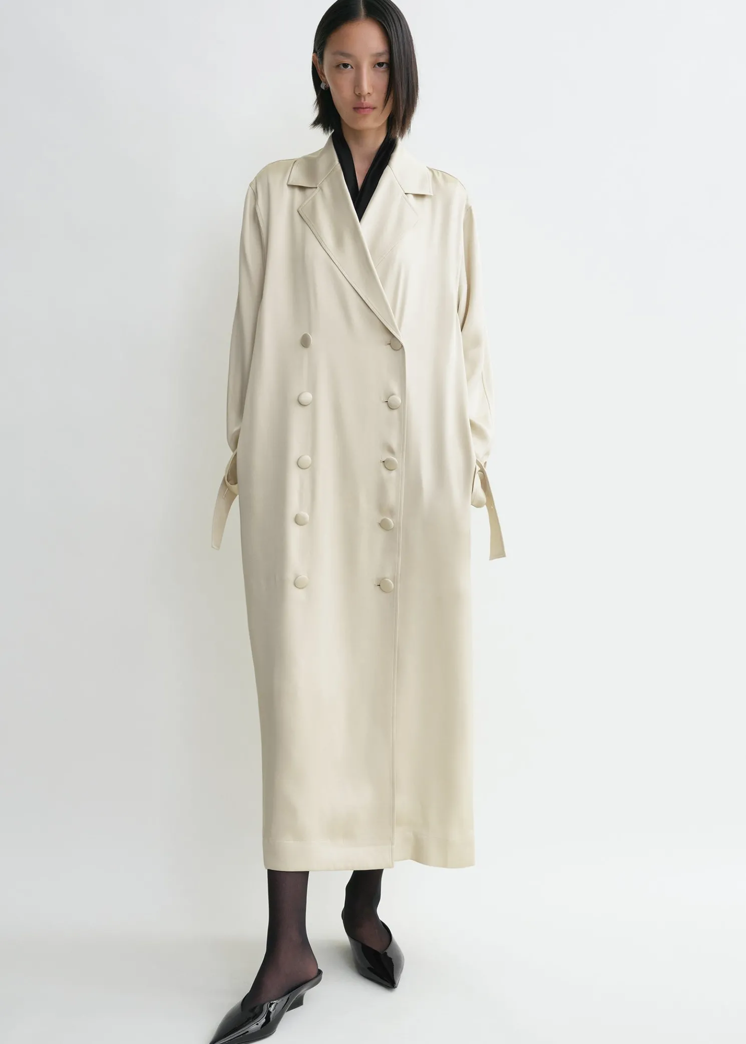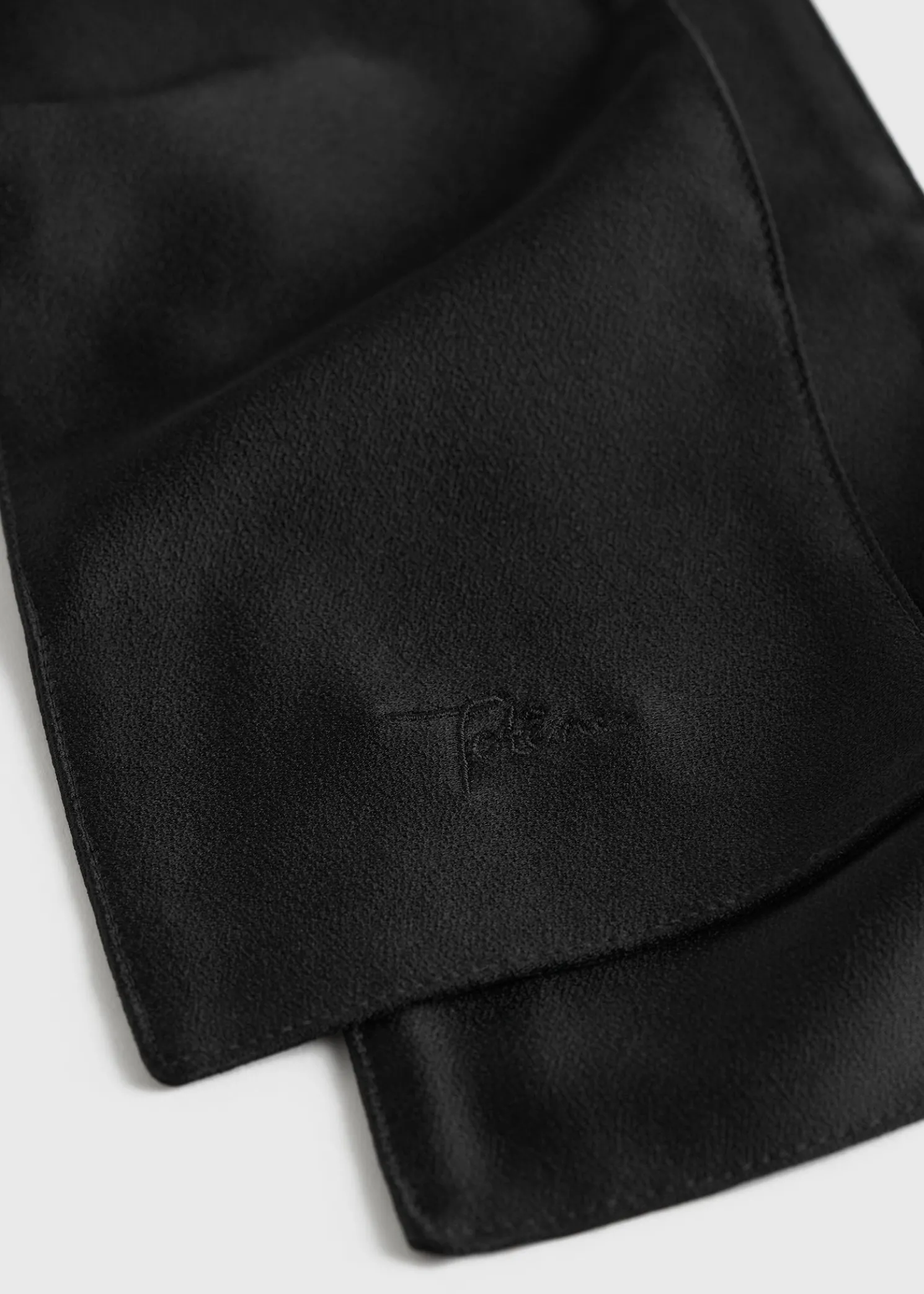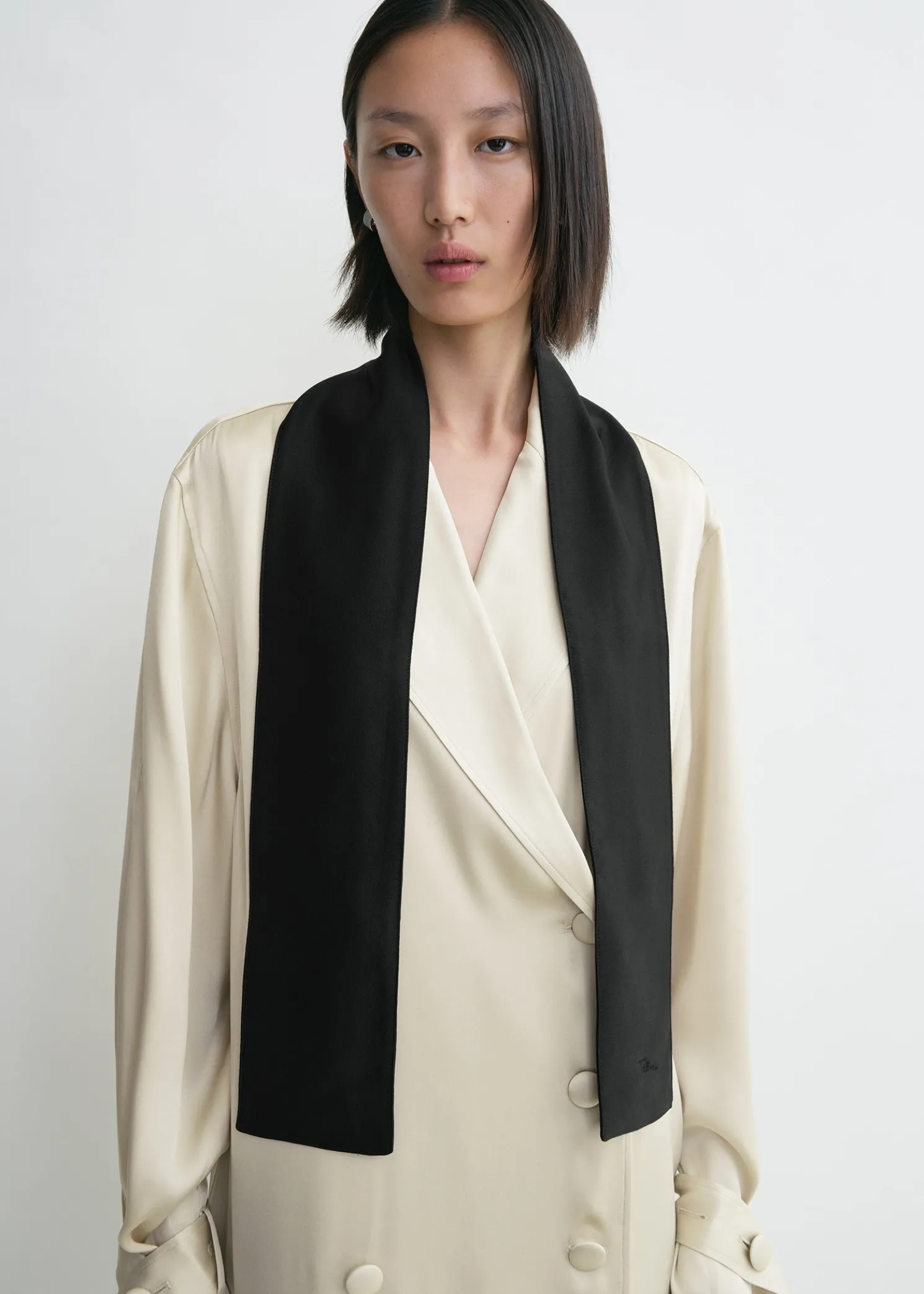 Inspired by the collection’s tuxedo theme, this TOTEME shawl scarf is made from lustrous charmeuse satin to mimic an untied bow tie draping from the neck. Complete an evening look by styling it tucked underneath a suit jacket.