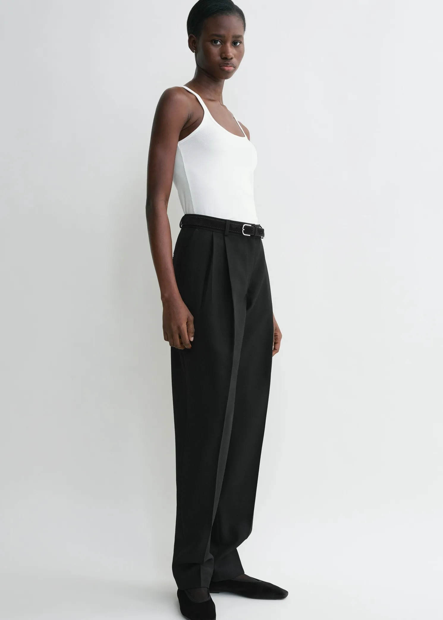nTOTEME tank top with slim shoulder straps joining a spacious scoop neckline and a racer back. It is rib-knitted in Portugal from light and fresh organic cotton blended with a hint of elastane for comfort. Complete an off-duty look with jeans.