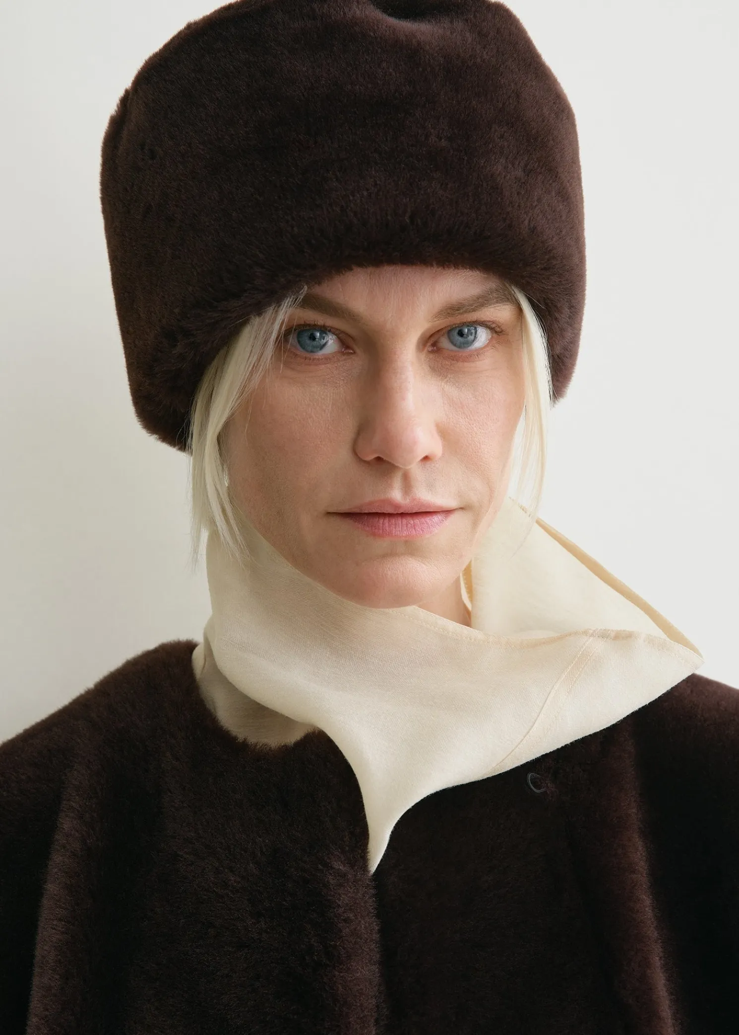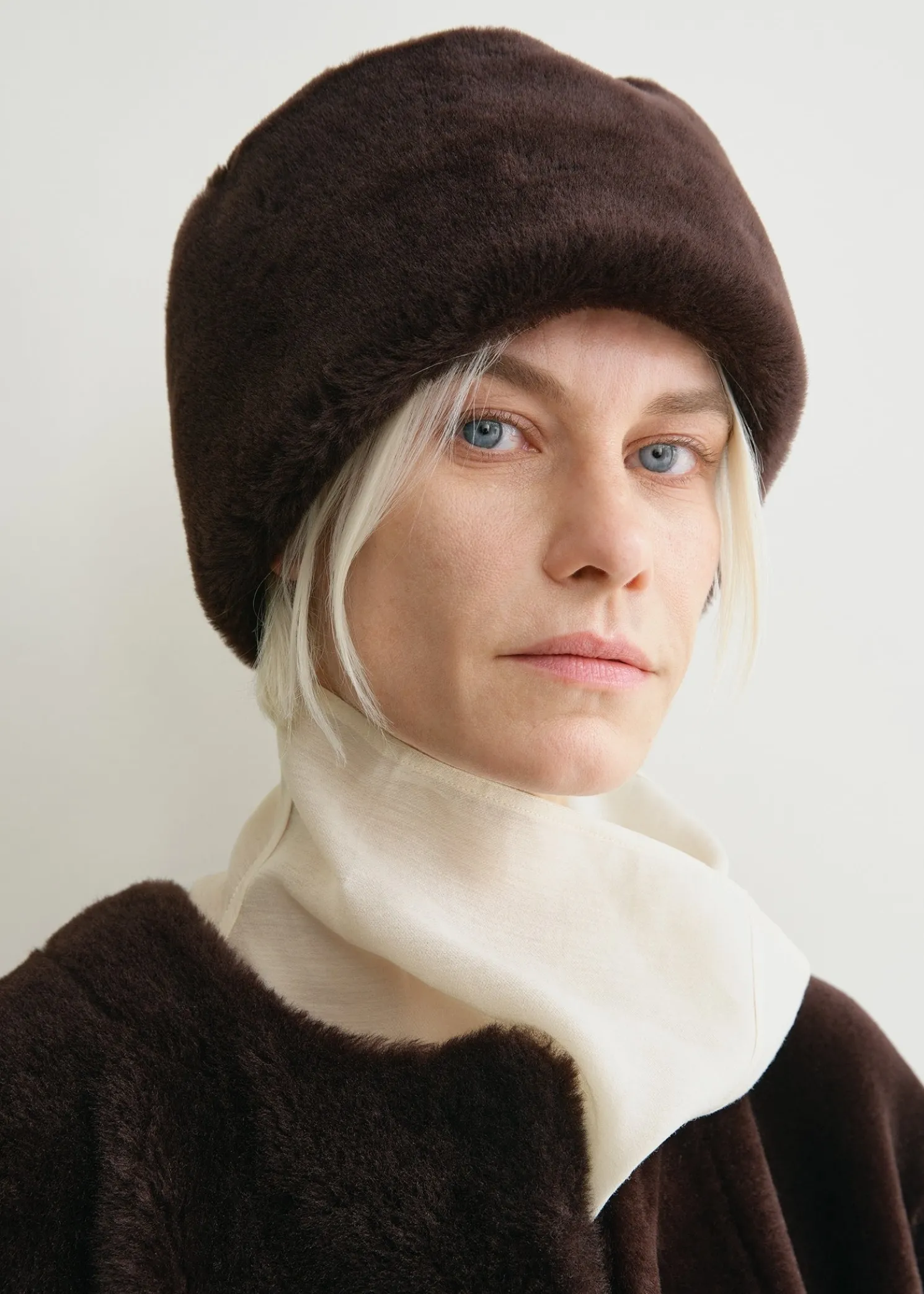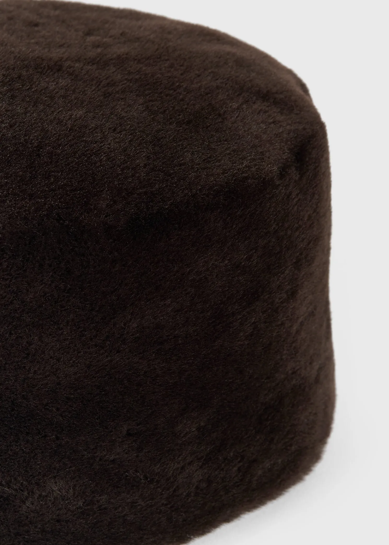 TOTEME hat shaped with a stylish pillbox silhouette. It is crafted from warm shearling with a soft shaved finish and has a partial suede reverse. Complete a winter look with a coordinated scarf.n