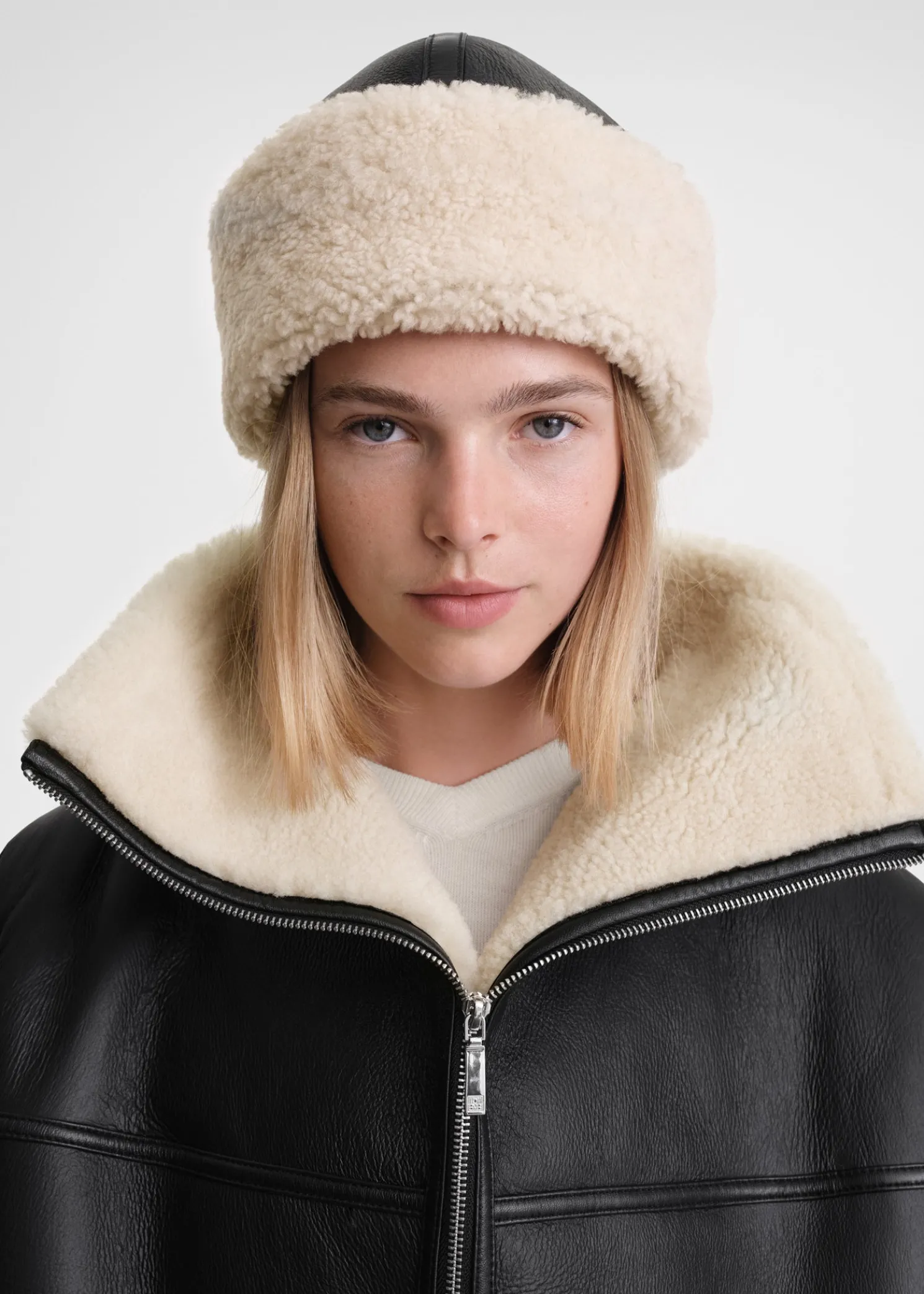 TOTEME winter hat crafted from warm lamb shearling. It has a stand-up crown supported with crossover leather strips and a wide foldover edge, and comes in two sizes. Wear it with a heavy coat and denim for a city stroll.