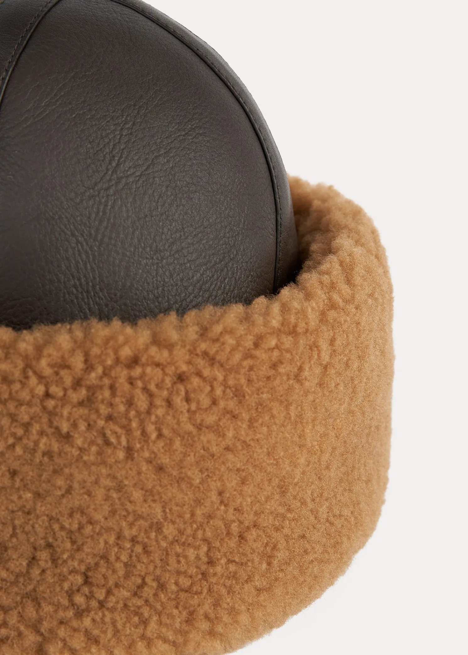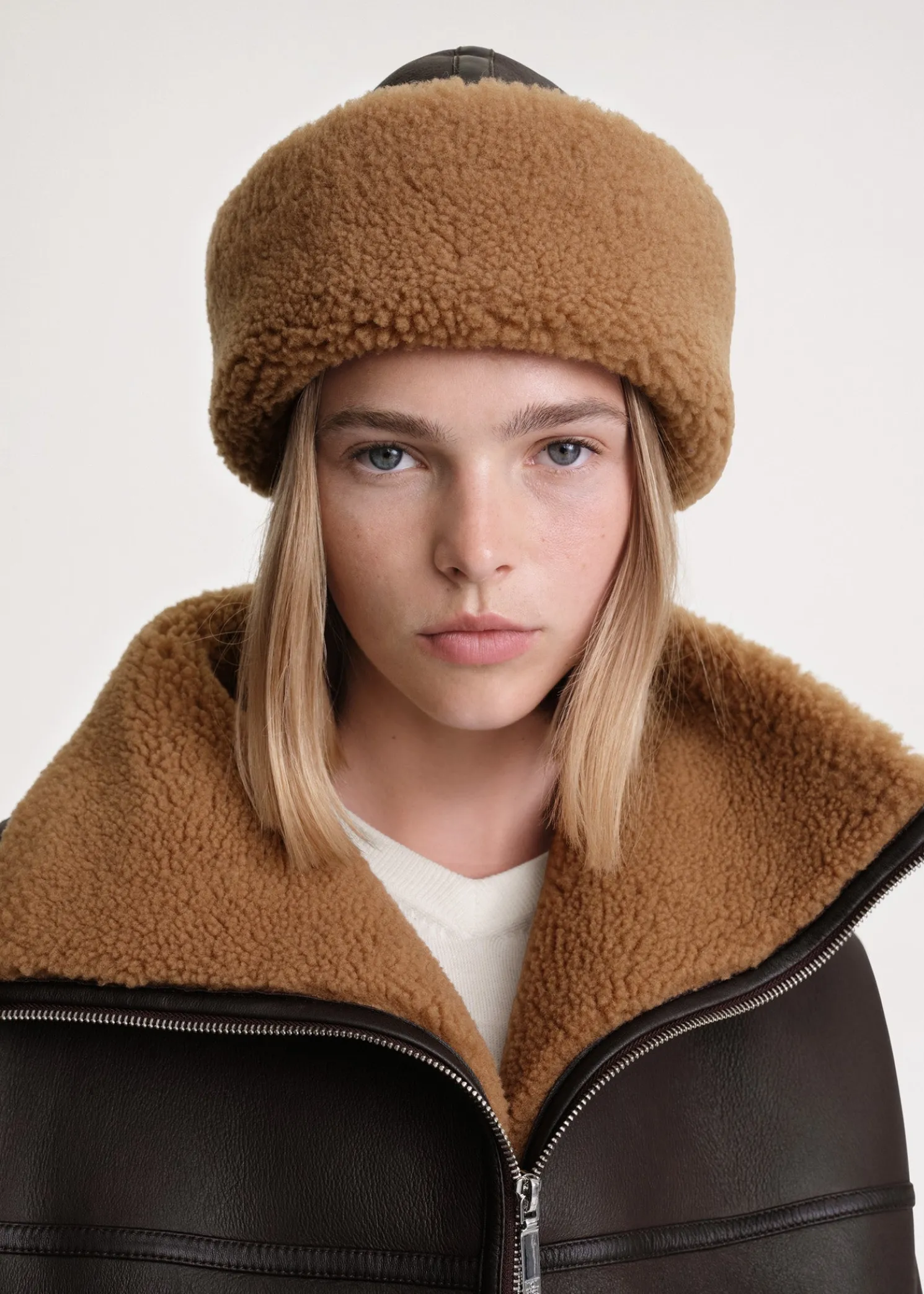 TOTEME winter hat crafted from warm lamb shearling. It has a stand-up crown supported with crossover leather strips and a wide foldover edge, and comes in two sizes. Wear it with a heavy coat and denim for a city stroll.