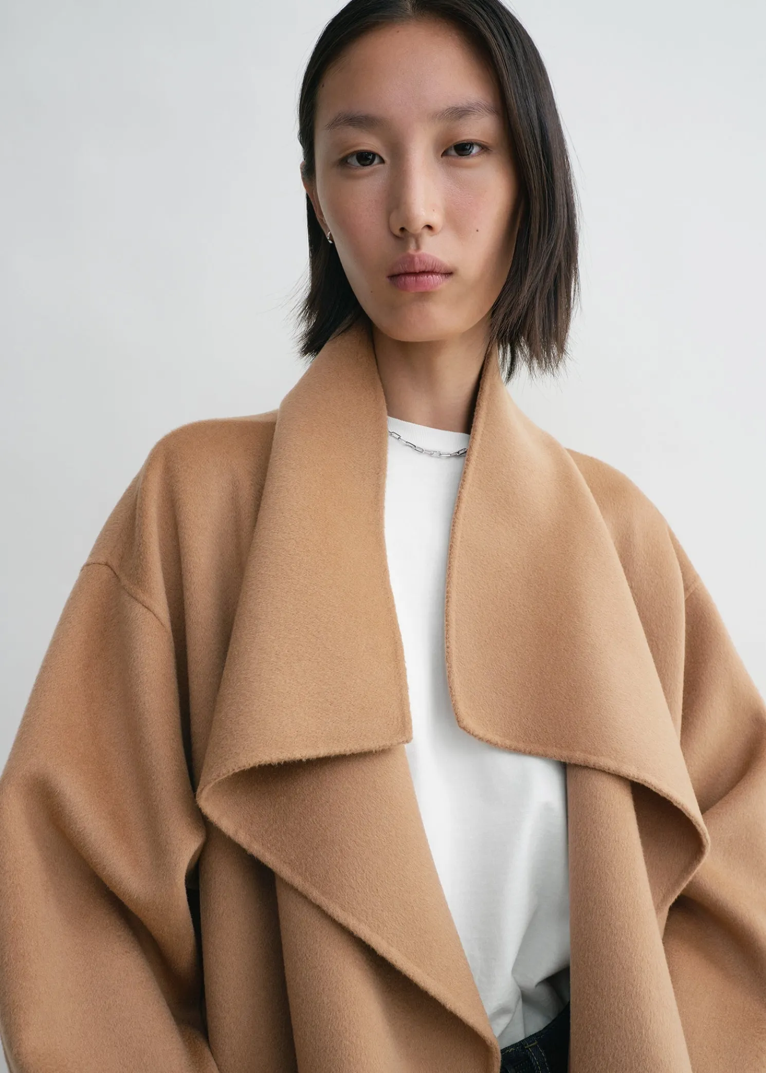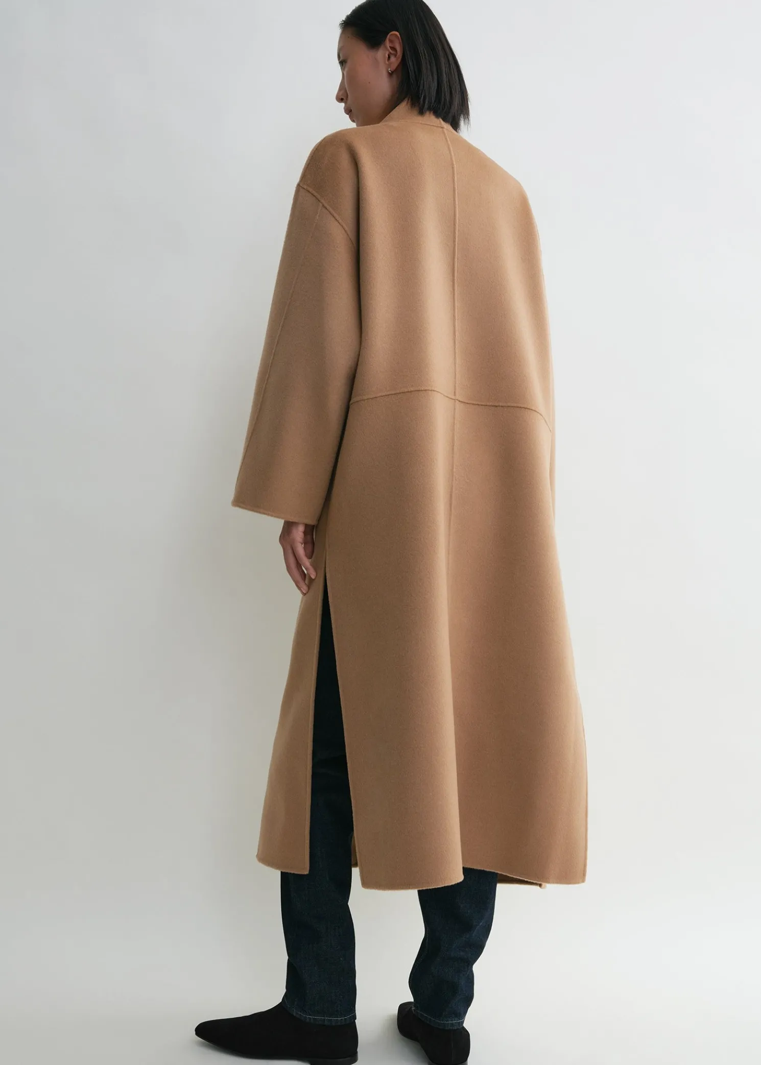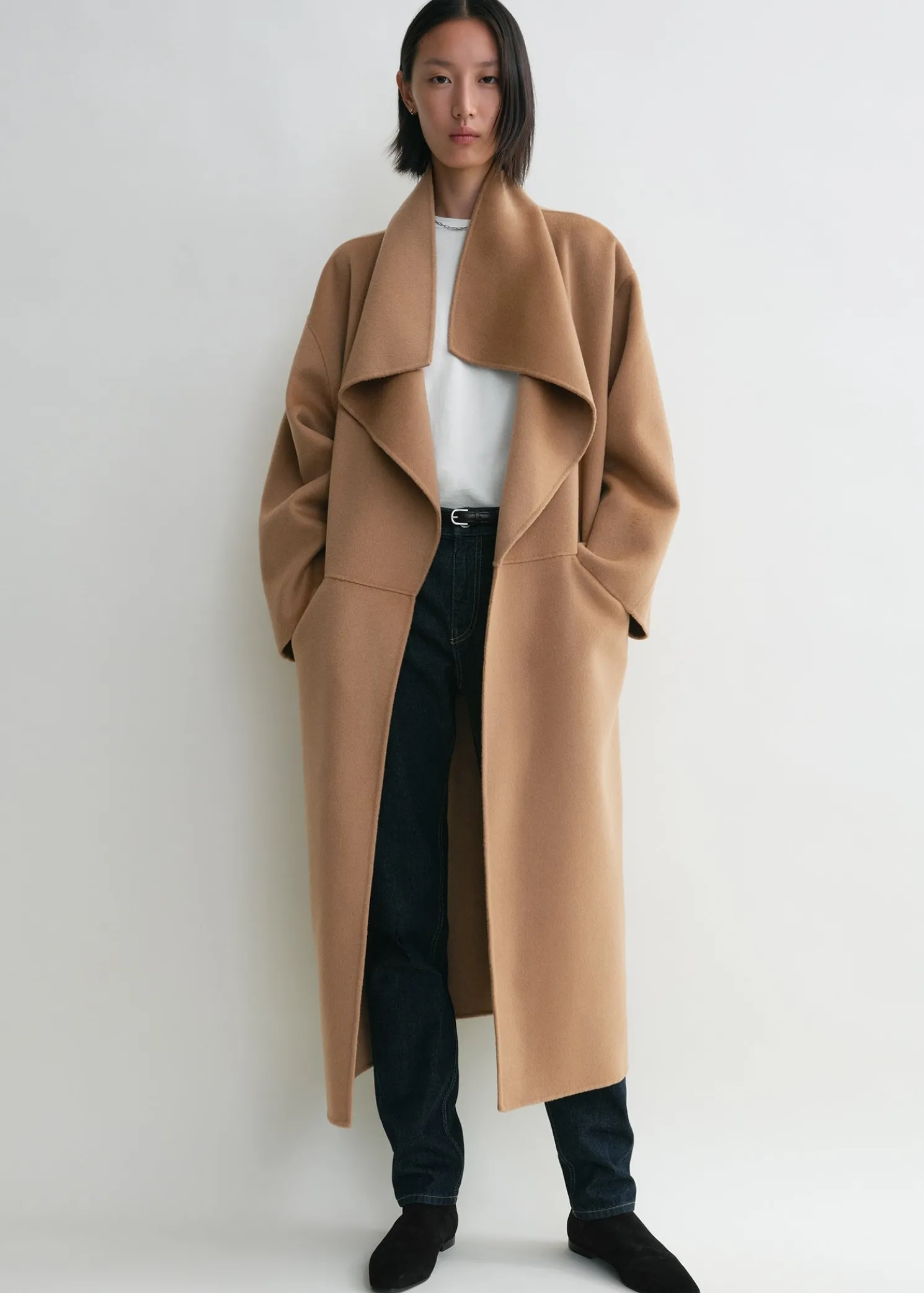 nSignature coat crafted from TOTEME’s soft doublé fabric – a blend of responsibly sourced wool and cashmere created by hand-stitching two fine layers together to achieve a double-faced finish with clean seams. It has an oversized silhouette with easy-to-style shawl lapels, dropped shoulders, and an open front which makes it perfect for layering, then is complete with inseam pockets and side slits. Coordinate it with the Long doublé scarf in the same color.