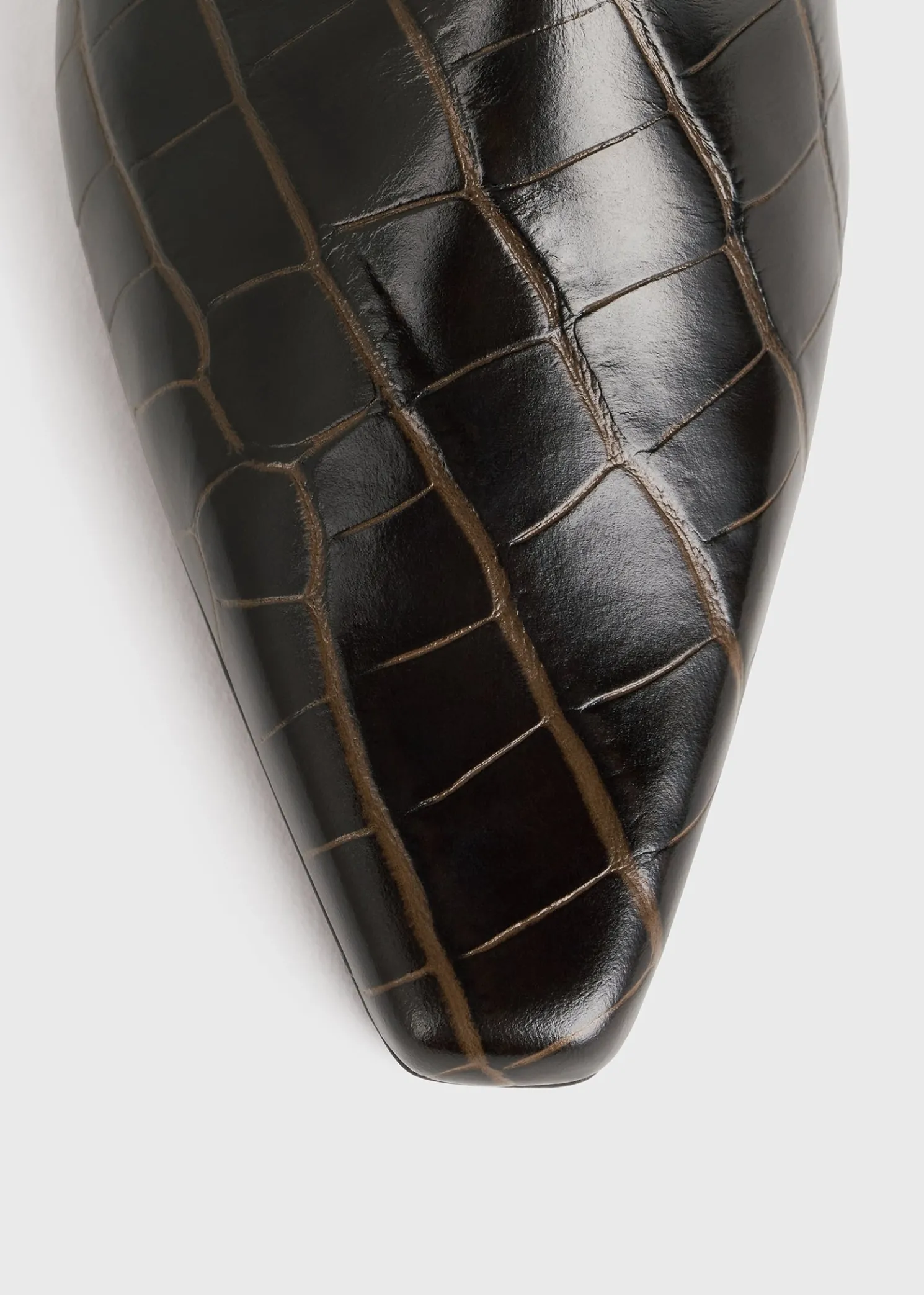 An elongated and pointed knee-length addition to TOTEME’s boot offering, stitched up with a neatly paneled upper and set on a 35mm kitten heel. They’re crafted in Italy from crocodile-effect leather with a foot-wrapping effect that’s possible thanks to a handy side zipper. Let them peep below dresses and skirts.