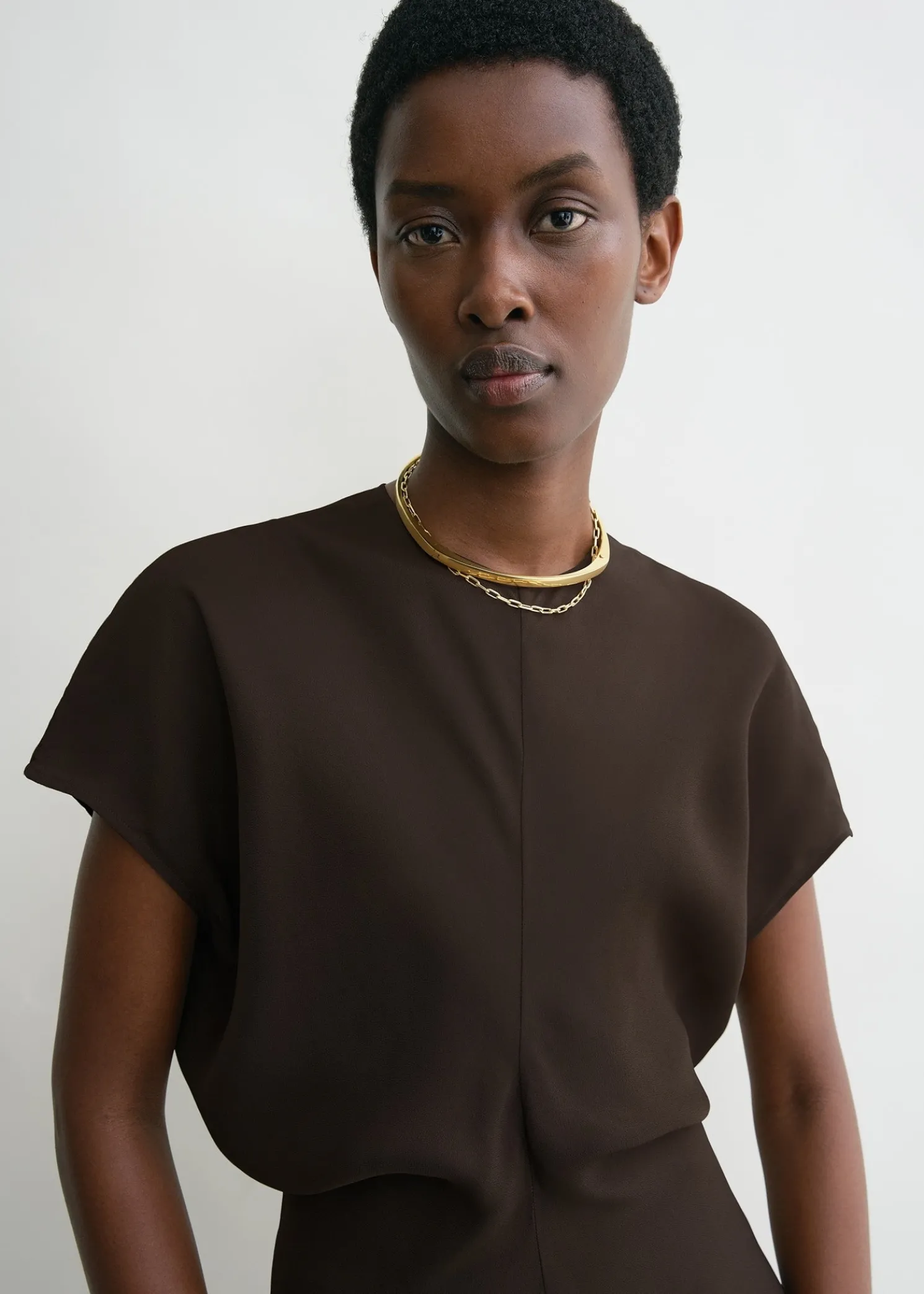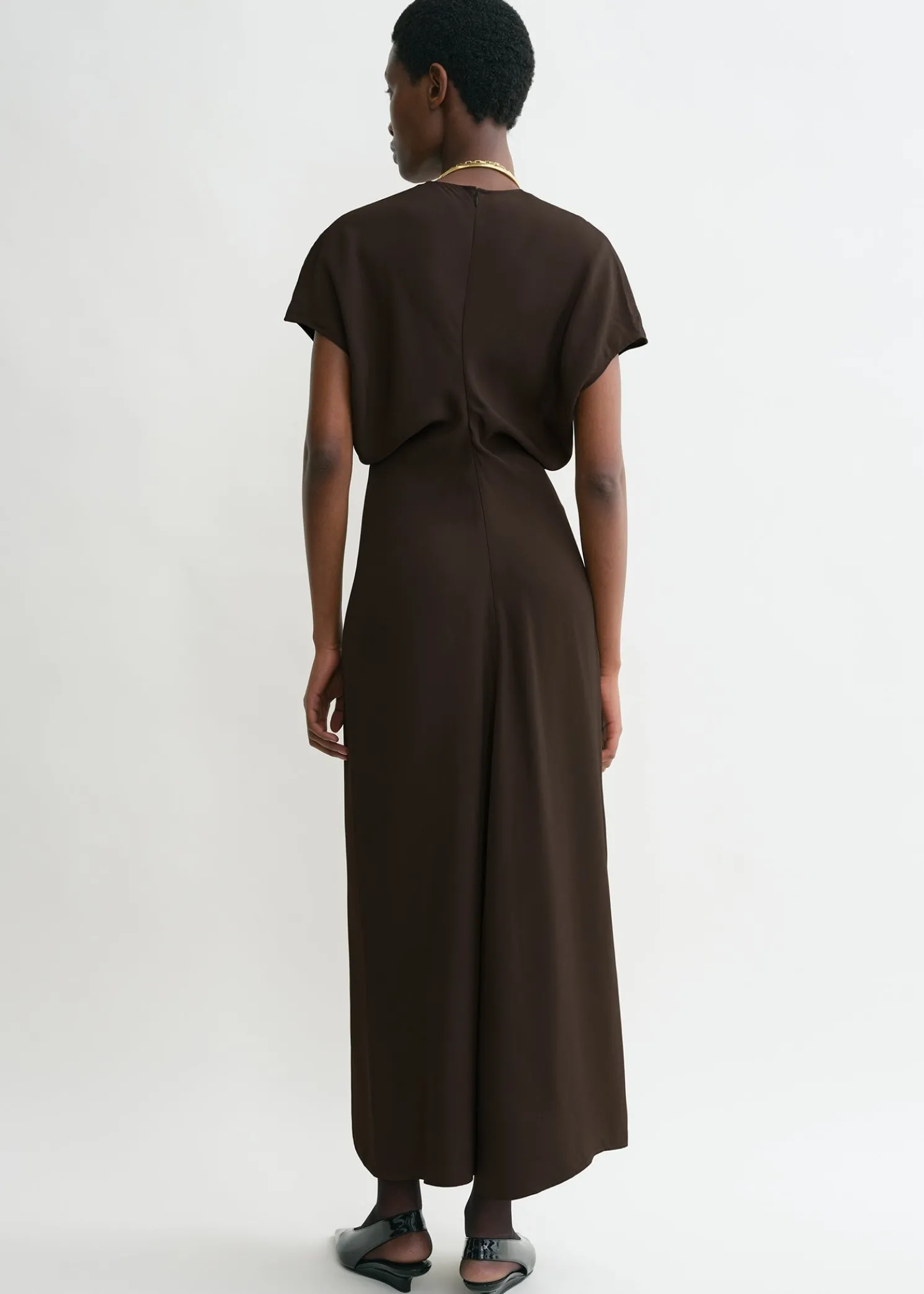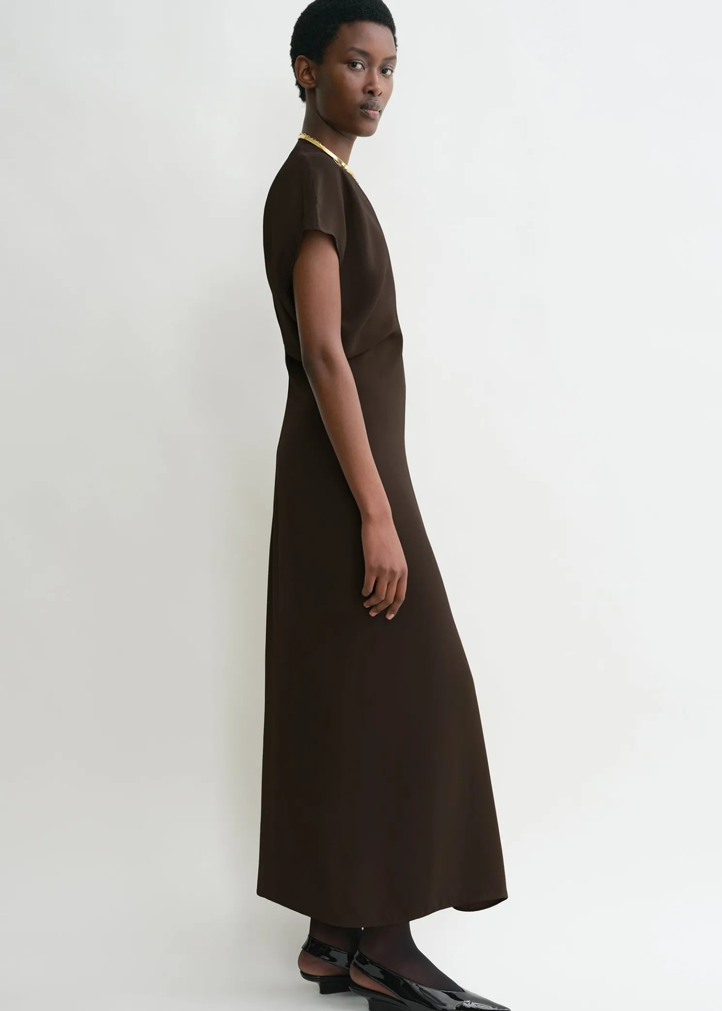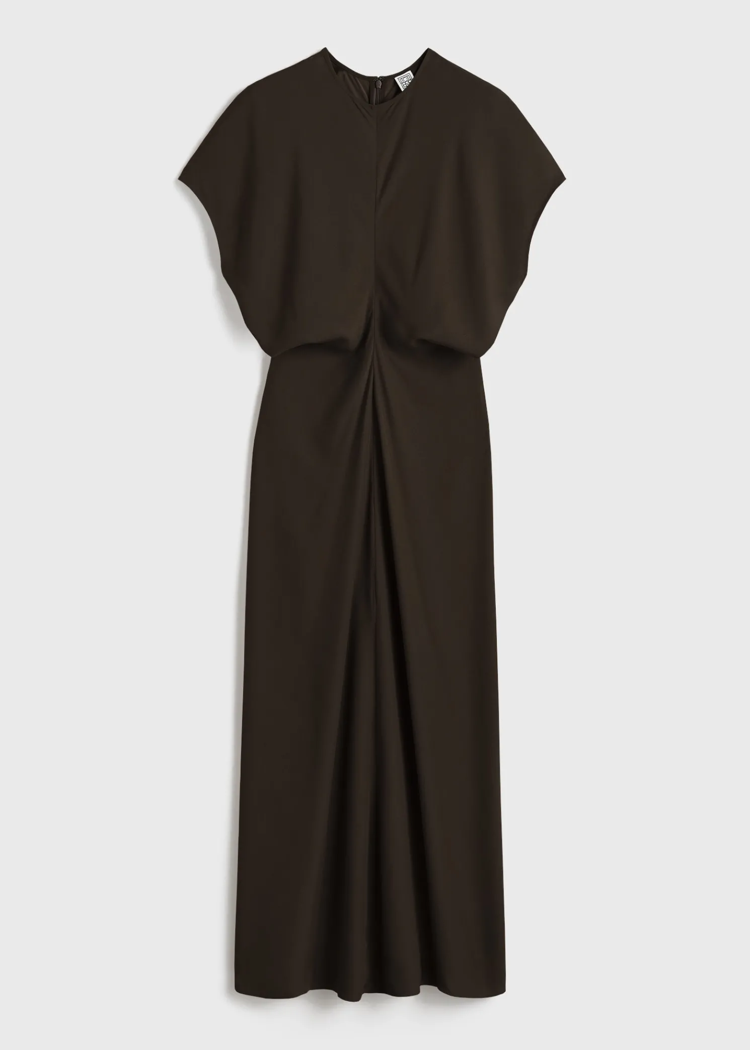 TOTEME dress constructed from curved panels that create a slouching effect at the waist when sewn together. Made from fluid crepe with a lustrous satin reverse, it has cap sleeves and a floor-grazing hem and fastens with a concealed back zipper. Add a clutch and heels to attend an opening night.