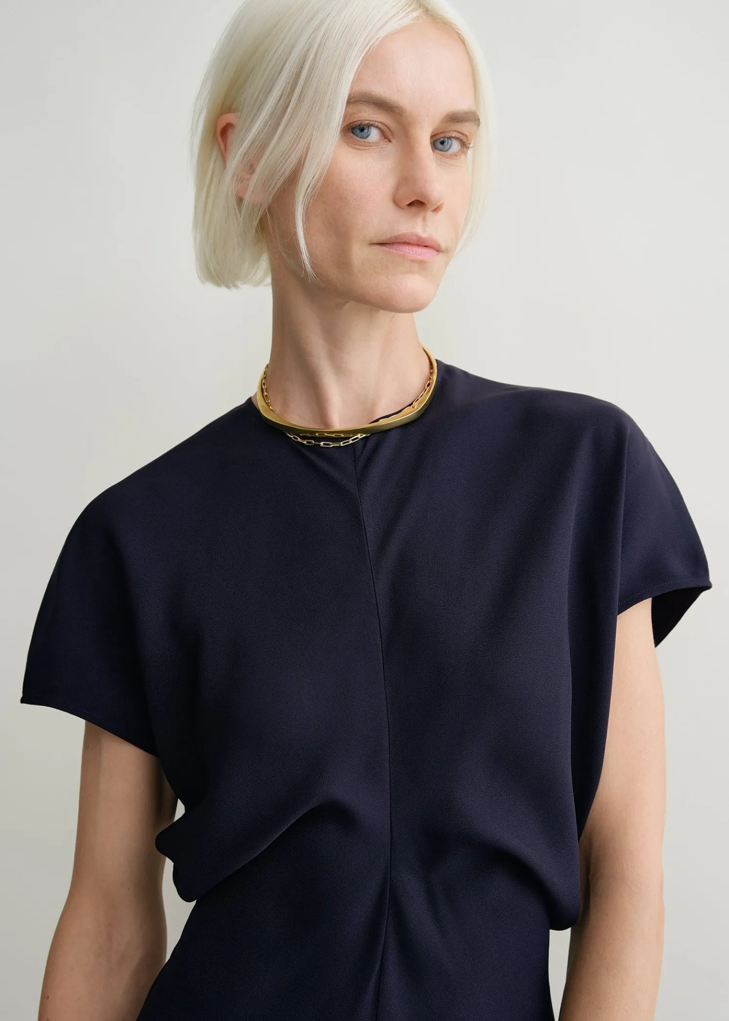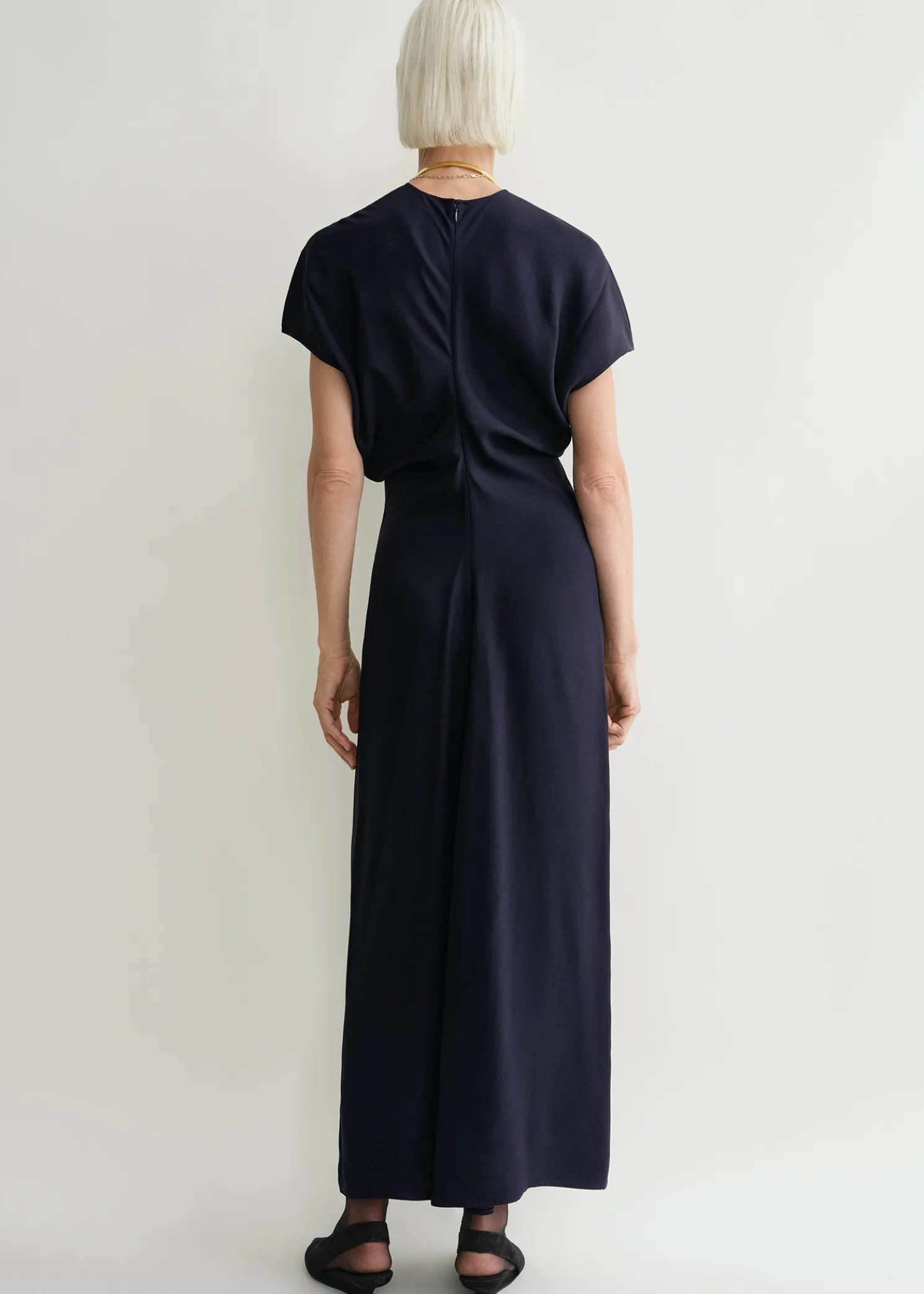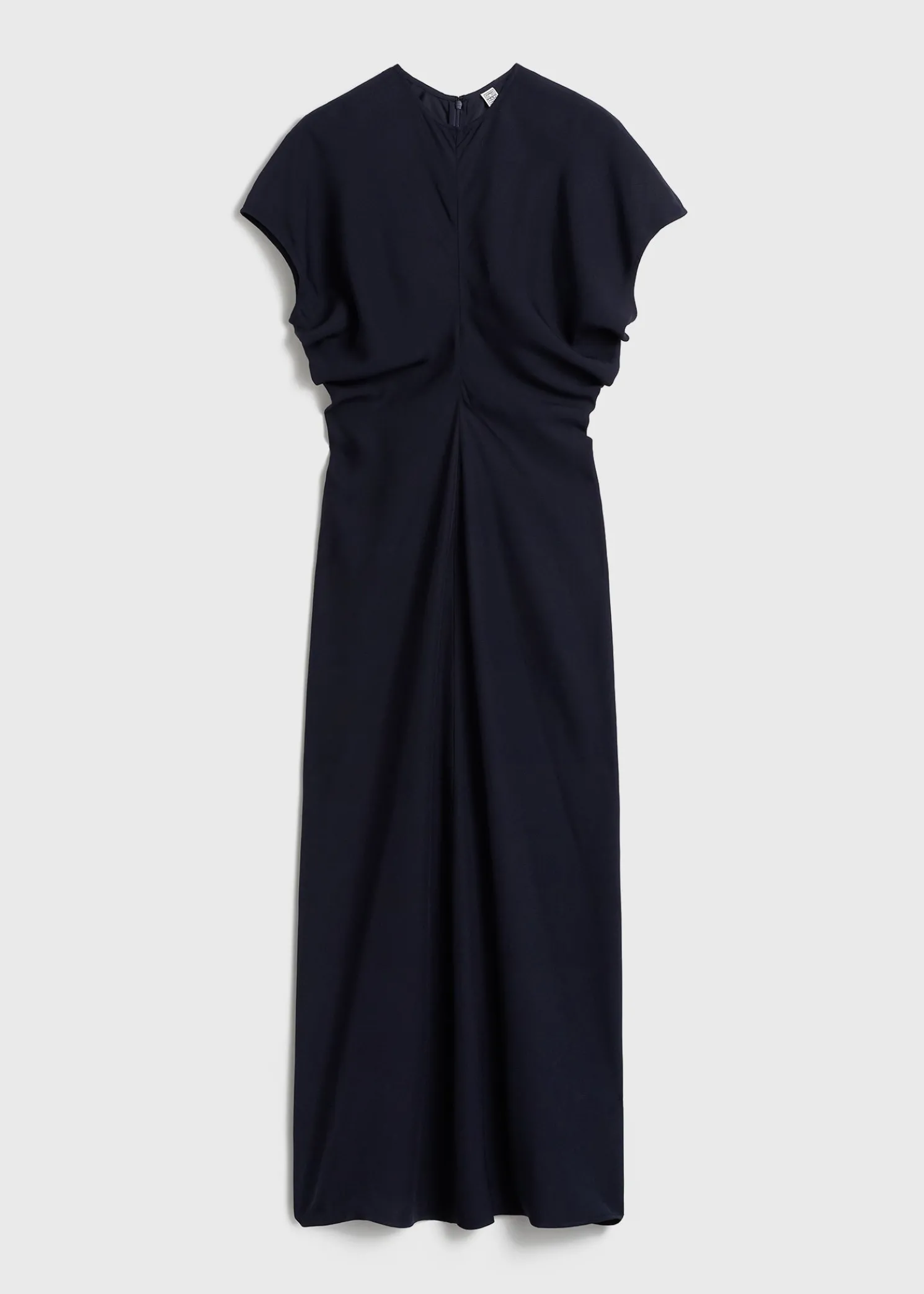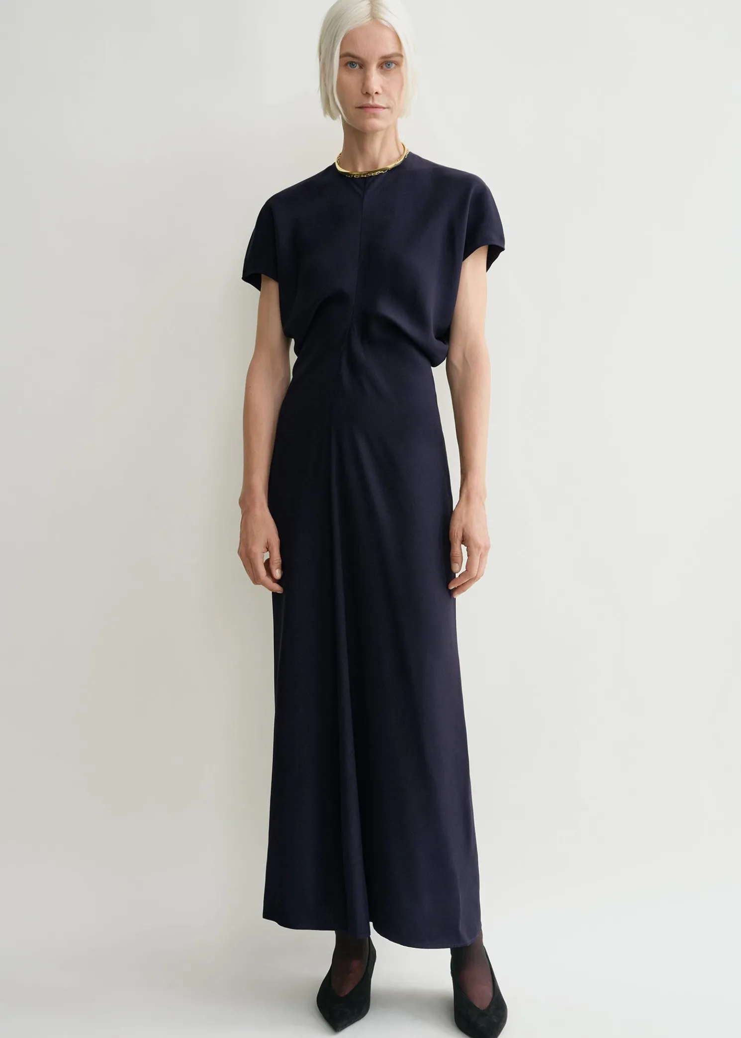 TOTEME dress constructed from curved panels that create a slouching effect at the waist when sewn together. Made from fluid crepe with a lustrous satin reverse, it has cap sleeves and a floor-grazing hem and fastens with a concealed back zipper. Add a clutch and heels to attend an opening night.