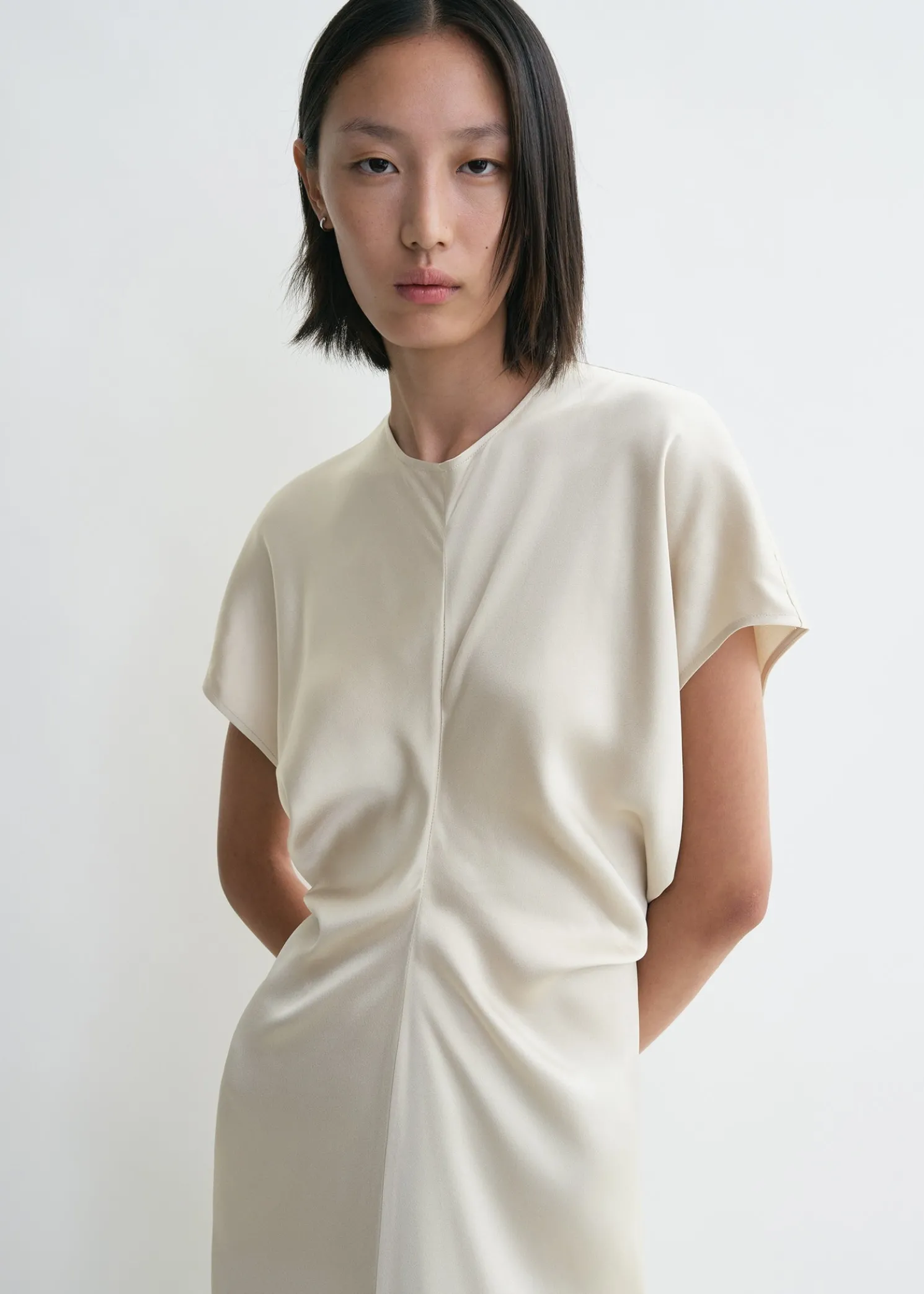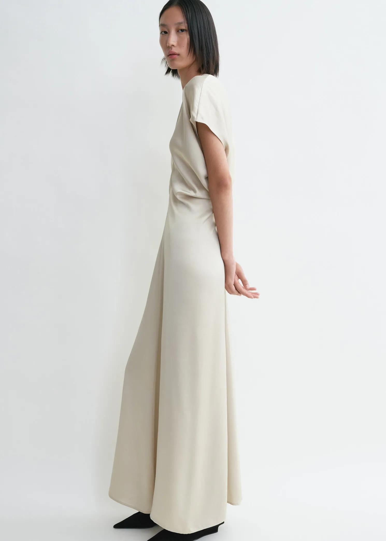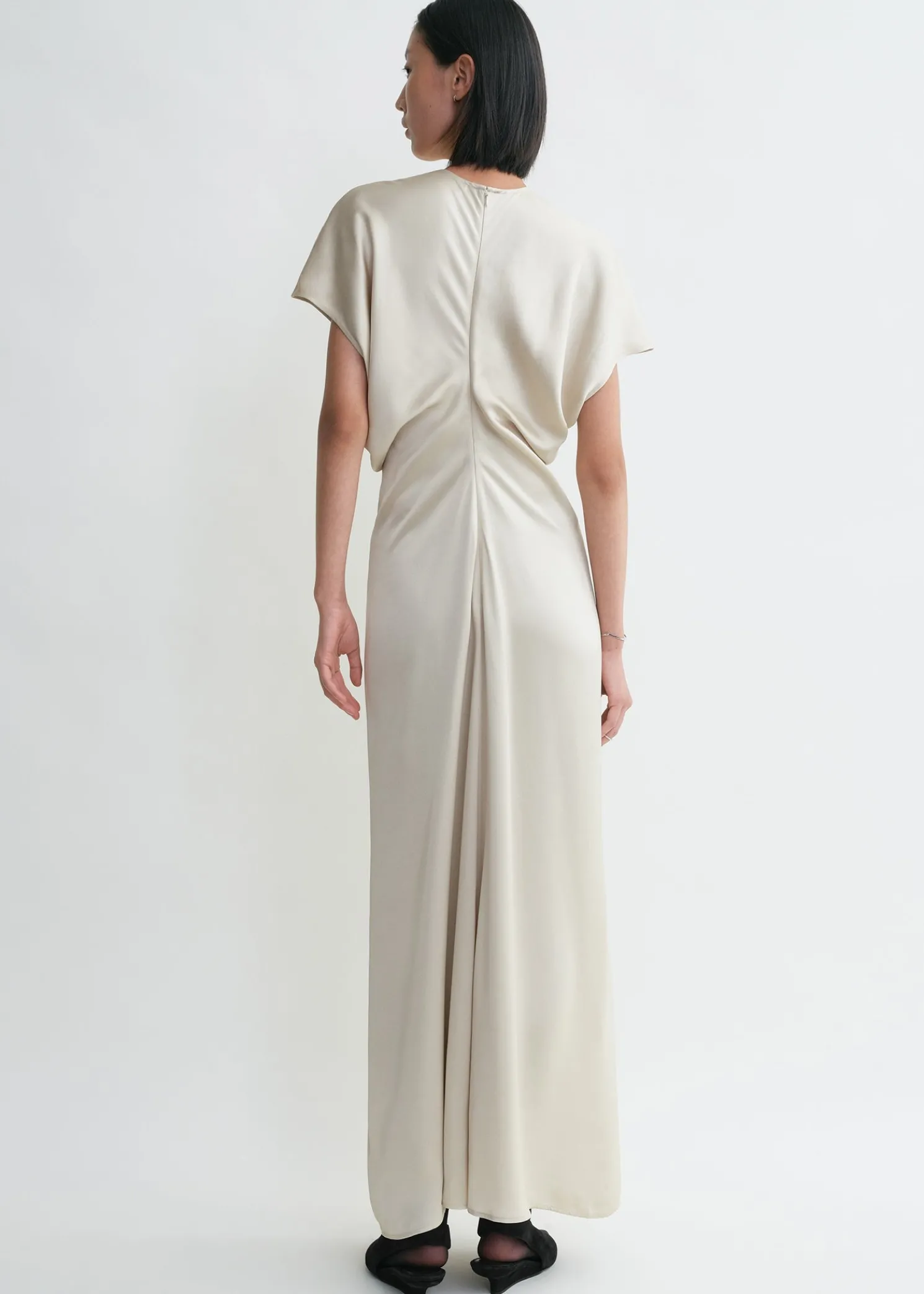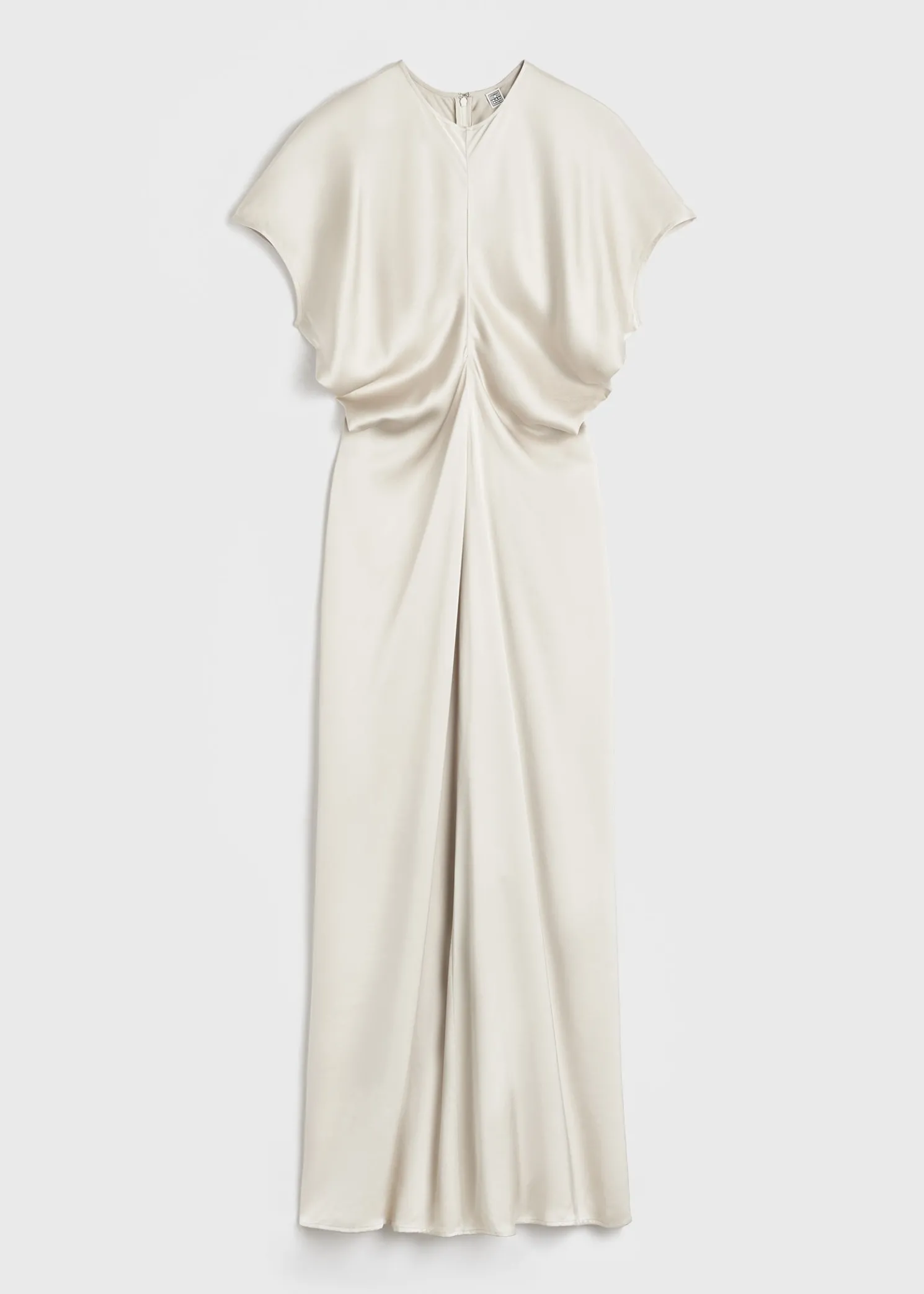 TOTEME dress constructed from curved panels that create a slouching effect at the waist when sewn together. Made from fluid satin with a lustrous crepe reverse, it has cap sleeves and a floor-grazing hem and fastens with a concealed back zipper. Add a clutch and heels to attend an opening night.