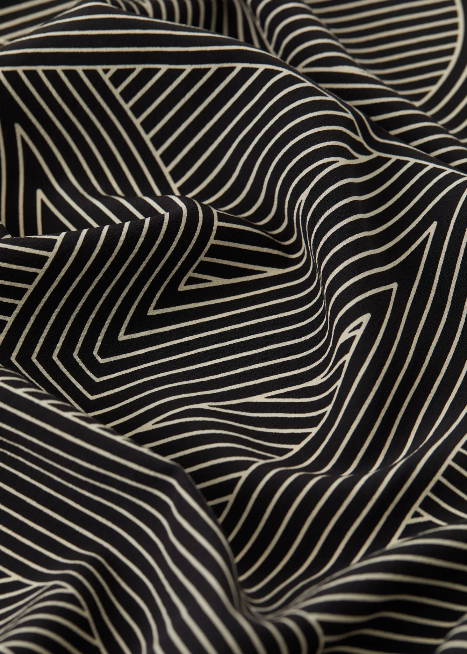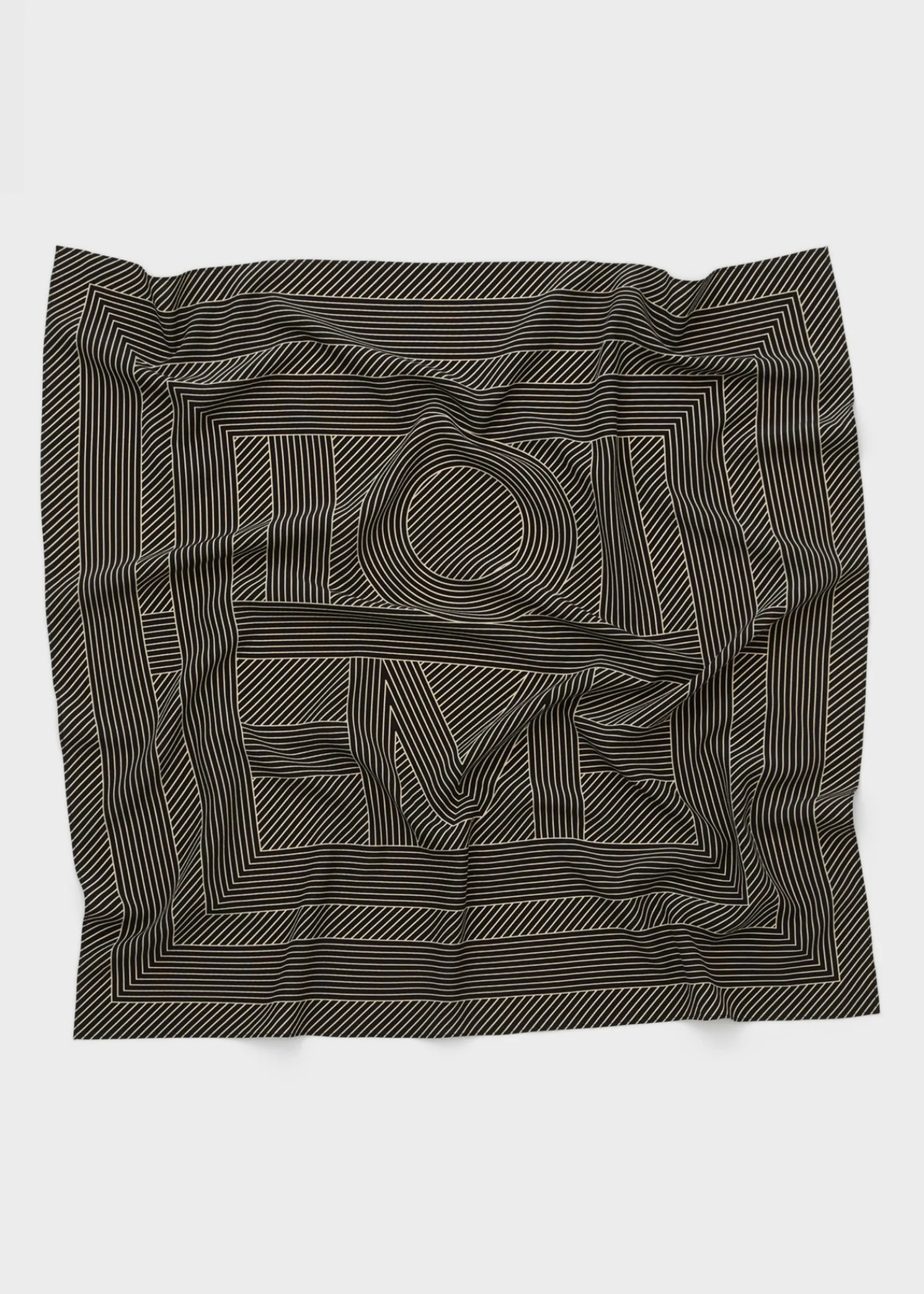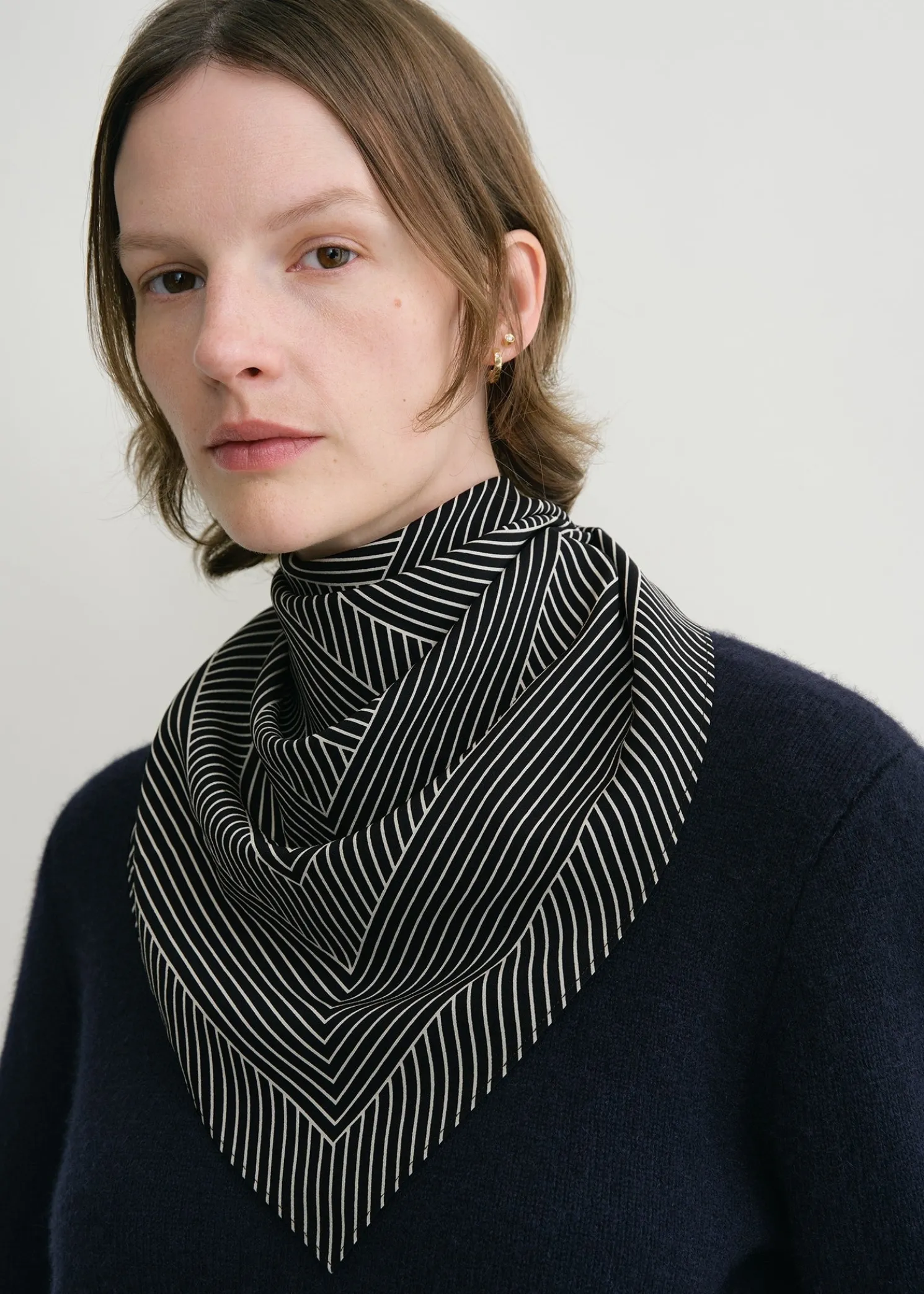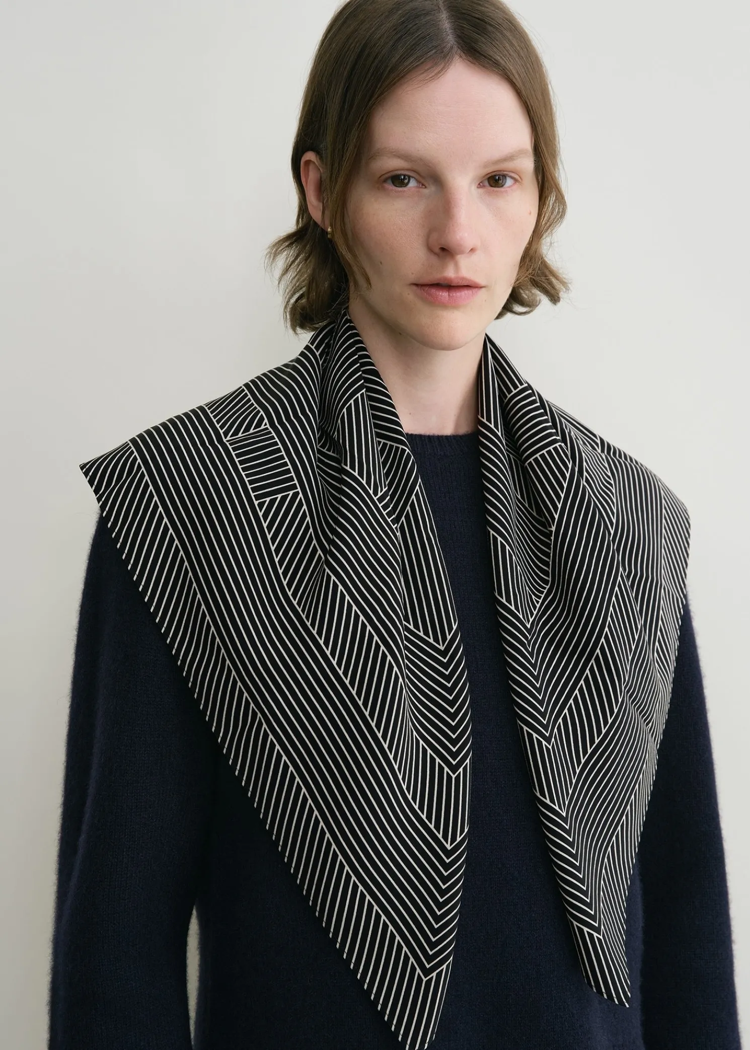 nnLarge silk scarf cut to a square shape measuring 80x80cm that’s printed with a black and crème-striped version of TOTEME’s distinctive monogram. Wear it around your neck or over your shoulders.