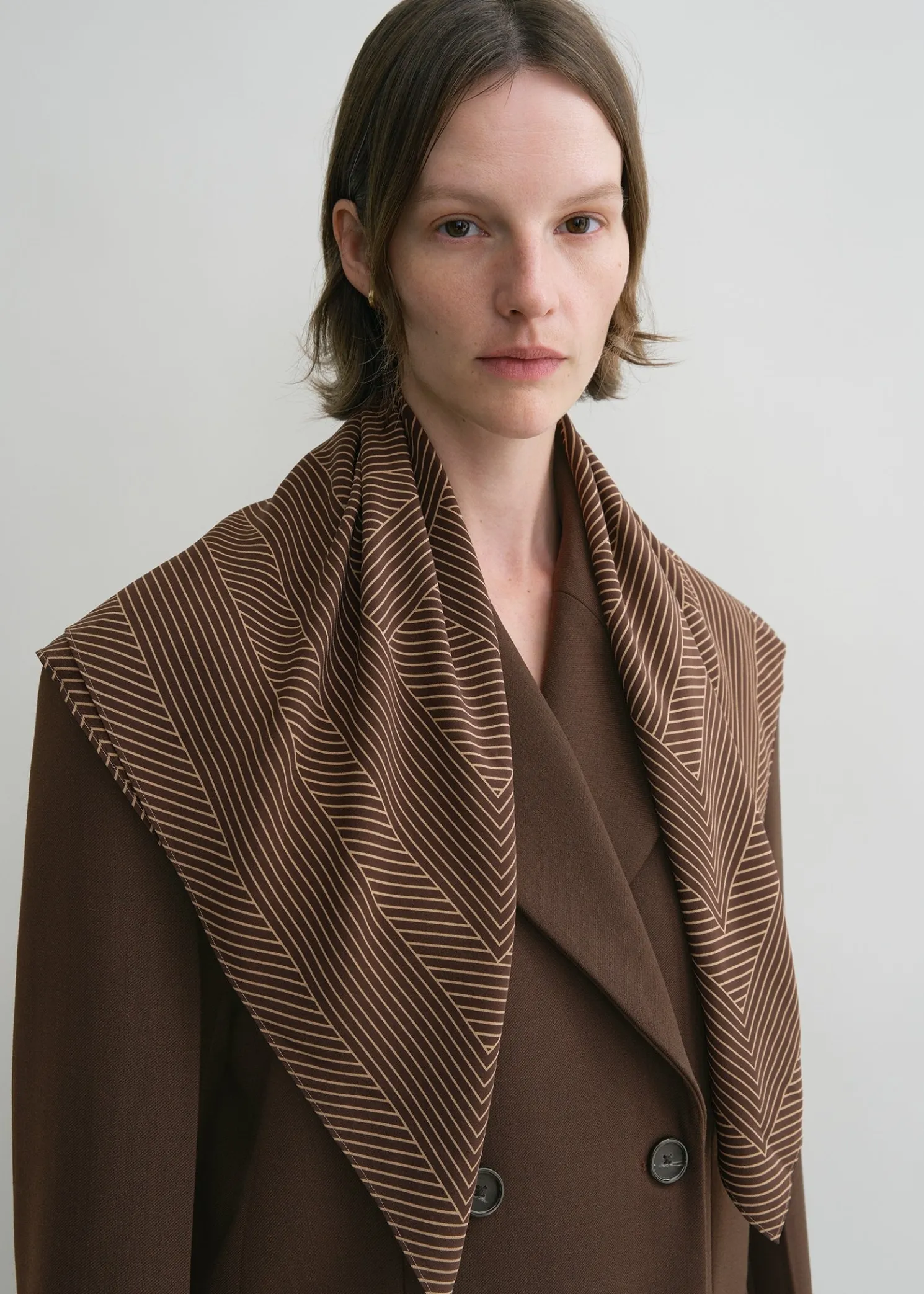 nnLarge silk scarf cut to a square shape measuring 80x80cm that’s printed with a striped take on TOTEME’s distinctive monogram. Wear it around your neck or over your shoulders.