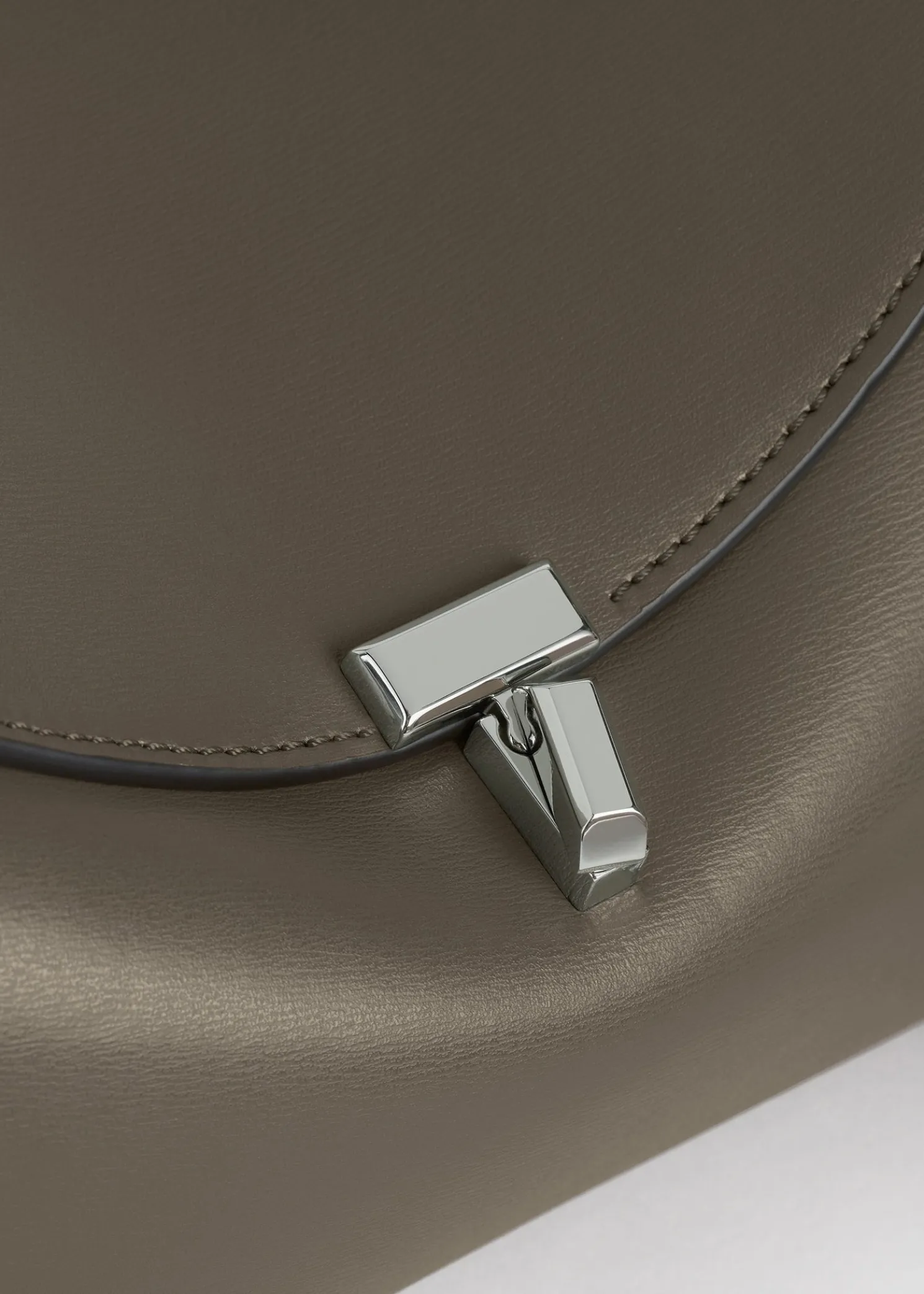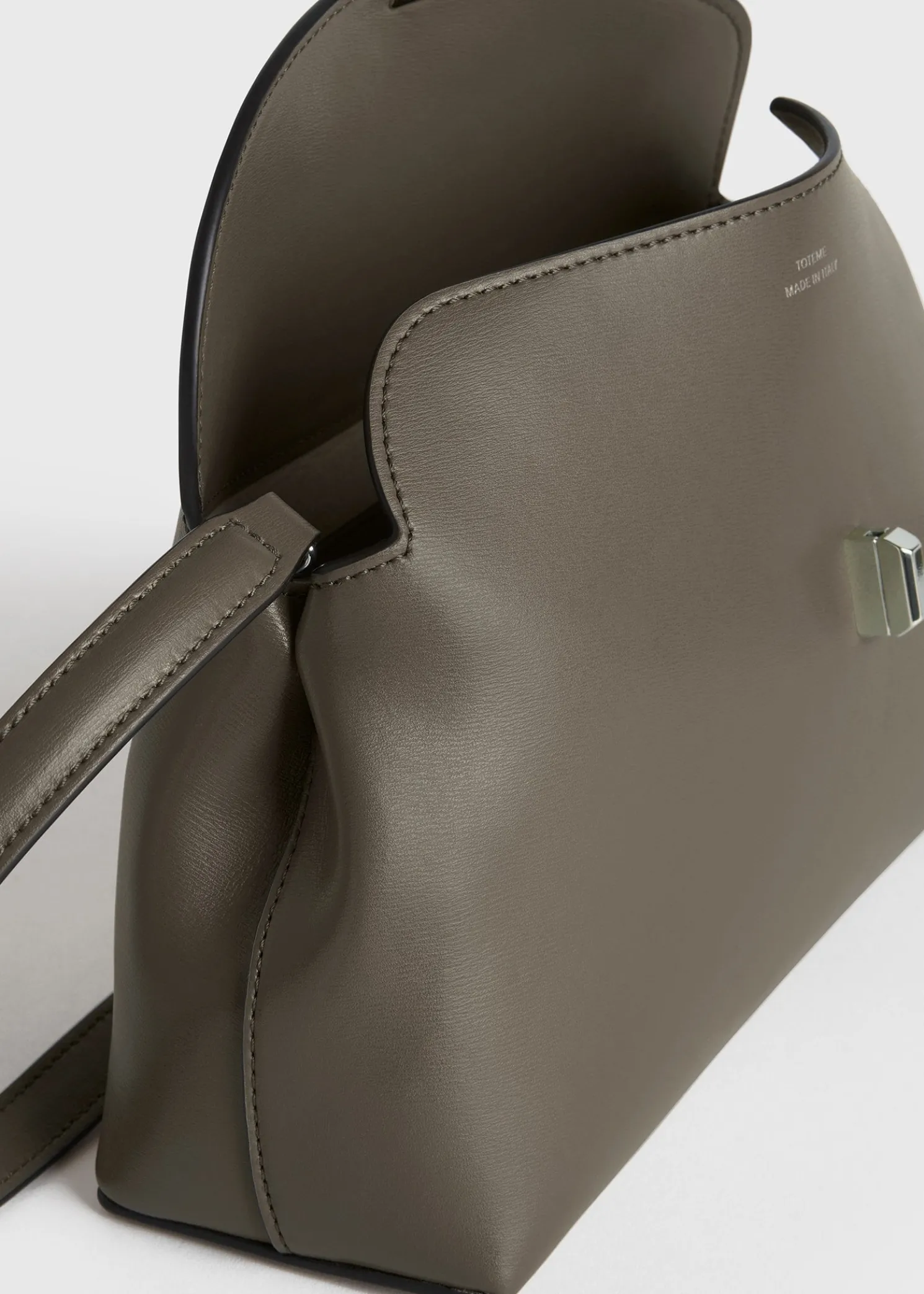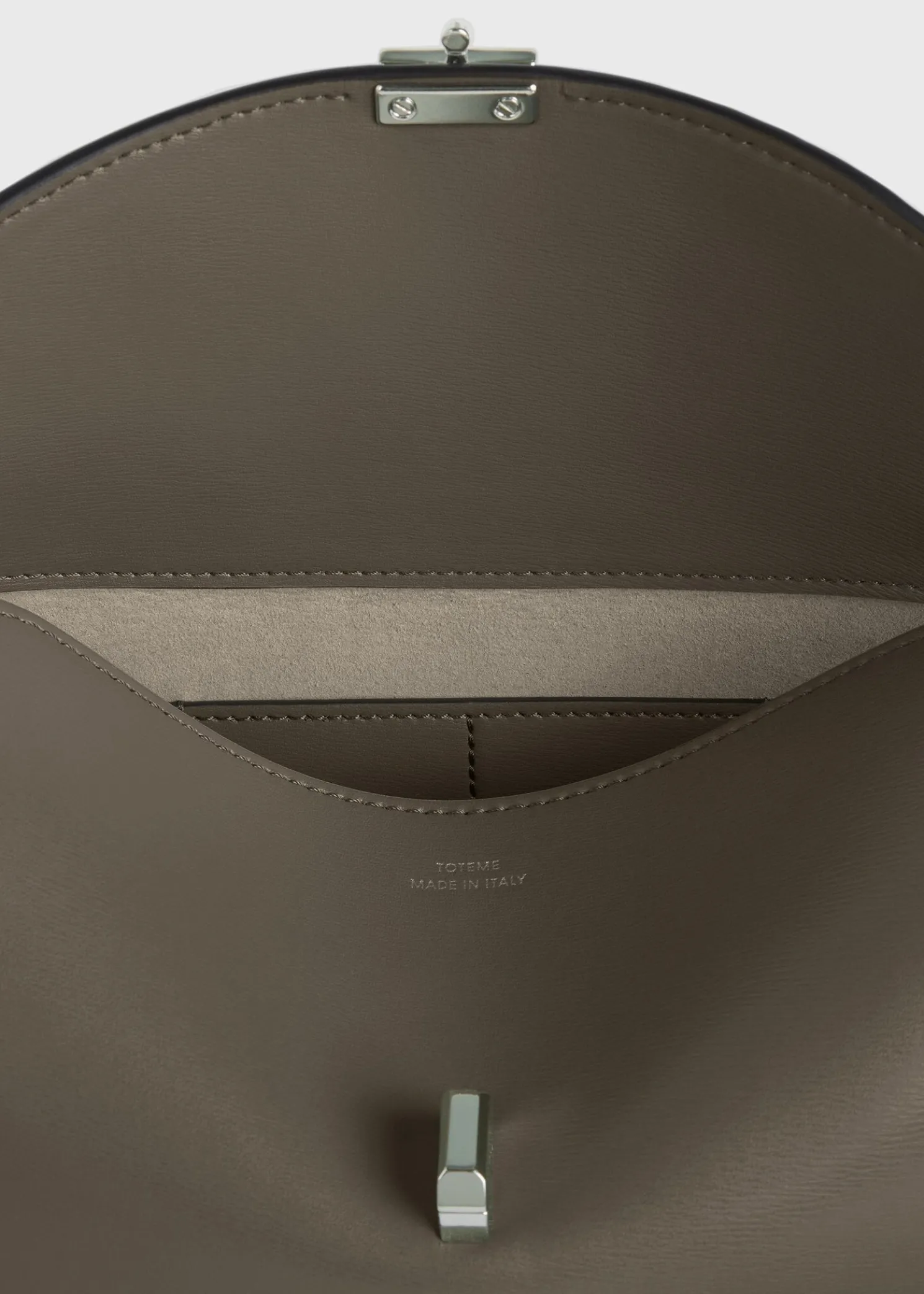 Sculptural TOTEME clutch bag named T-Lock after the silver-tone metal twist lock securing the curved top flap. It’s crafted in Italy from smooth leather and opens to a beige microsuede interior fitted with a leather card slot. Hold it in your hand or carry it across the body using the optional strap.